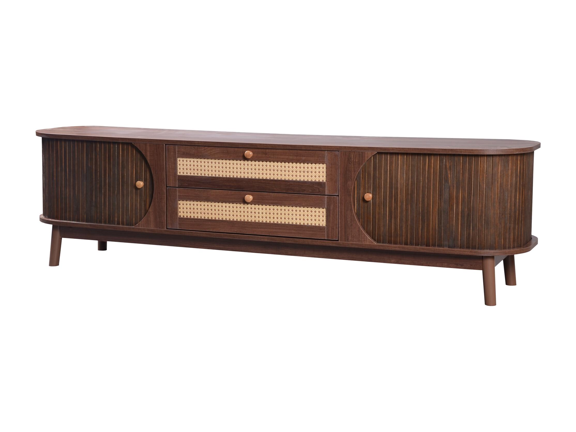 Meuble TV à couleur bois naturel : avec portes, tiroirs et côtés en rotin – Solution de rangement pratique dans un style lande naturel