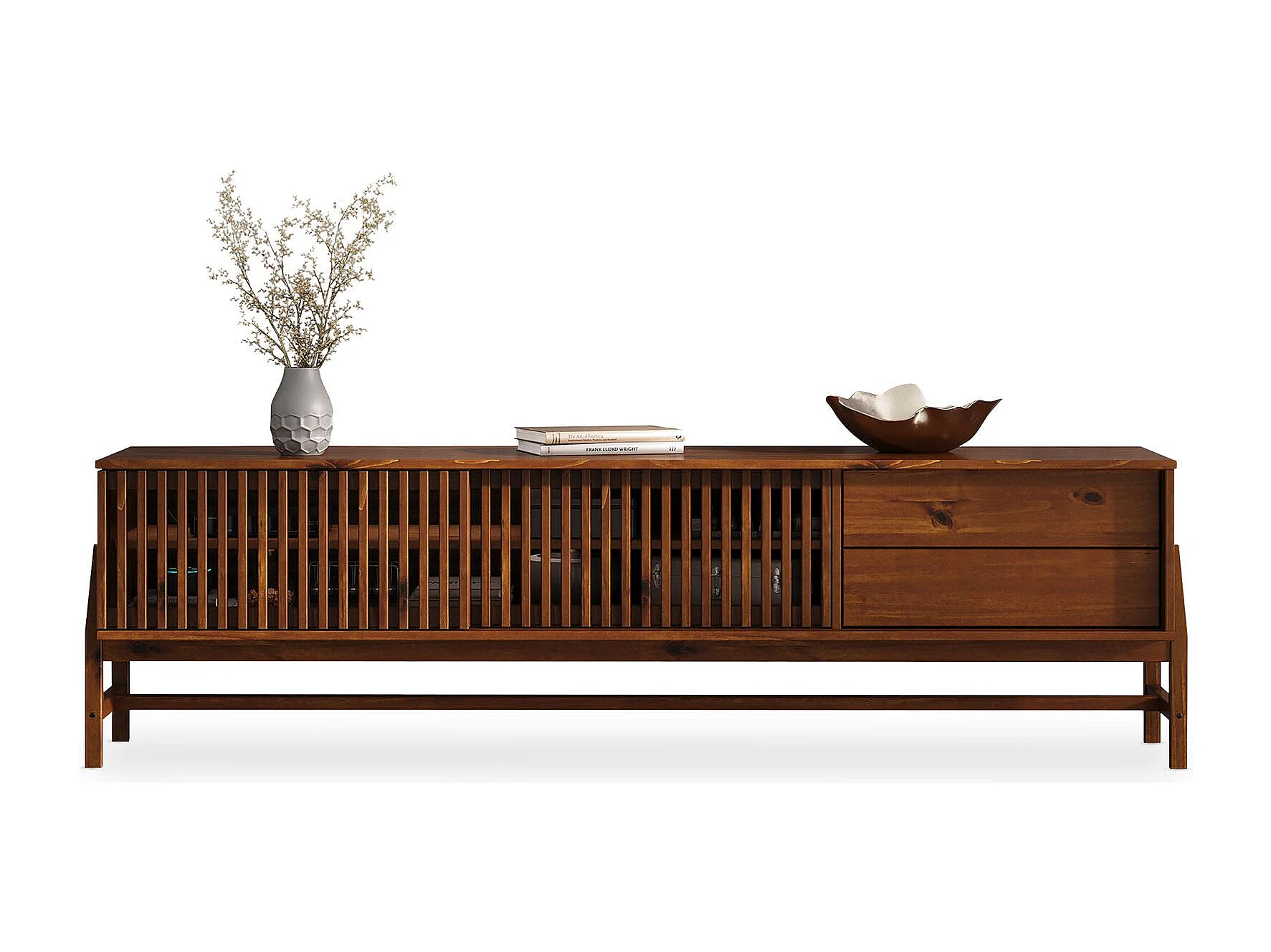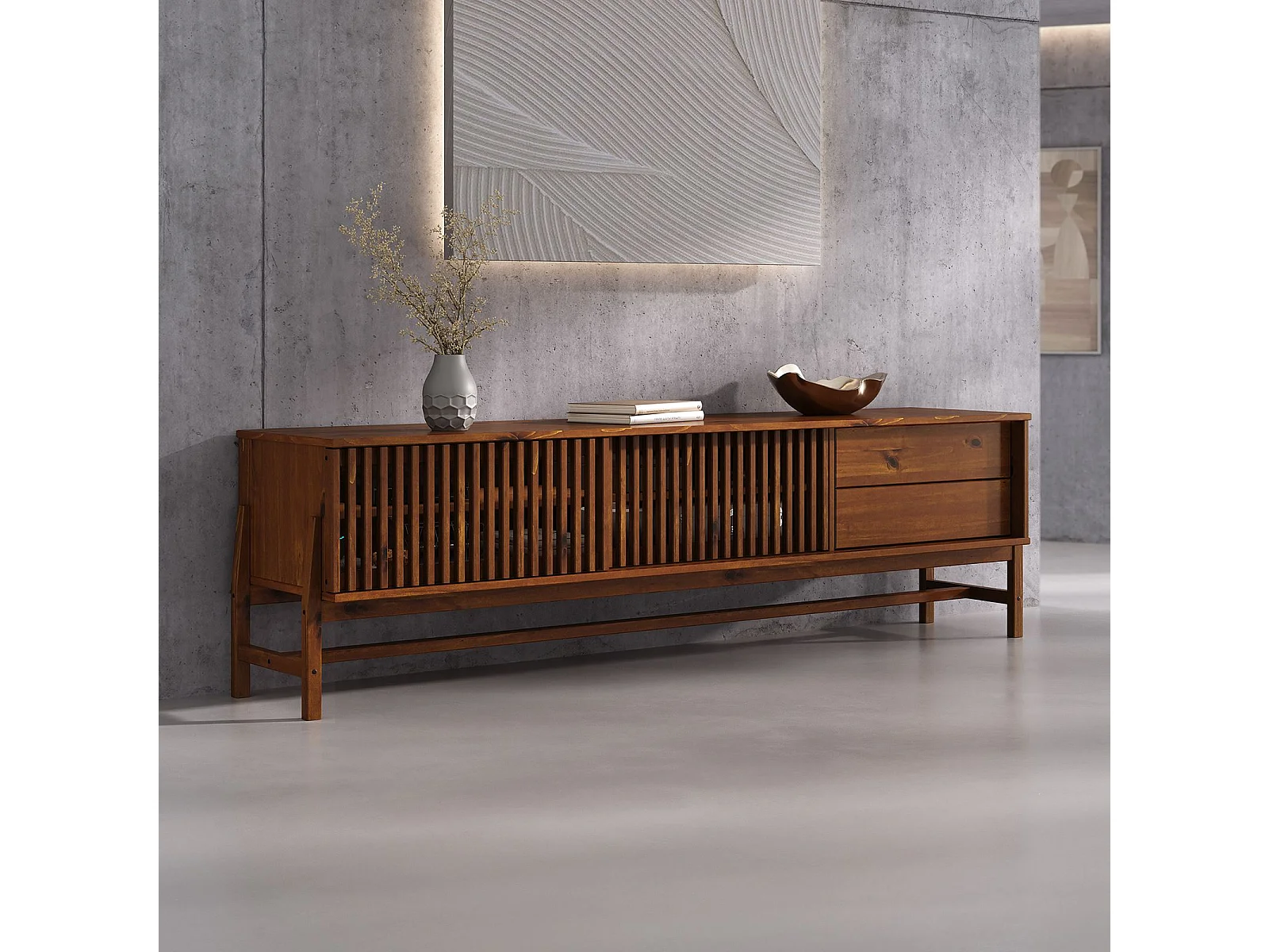 Meuble TV ADAMO L 180 cm en Bois Massif Couleur Châtaignier avec 2 Portes Coulissantes, 2 Tiroirs, Pour TV jusqu'à 203 cm (80")