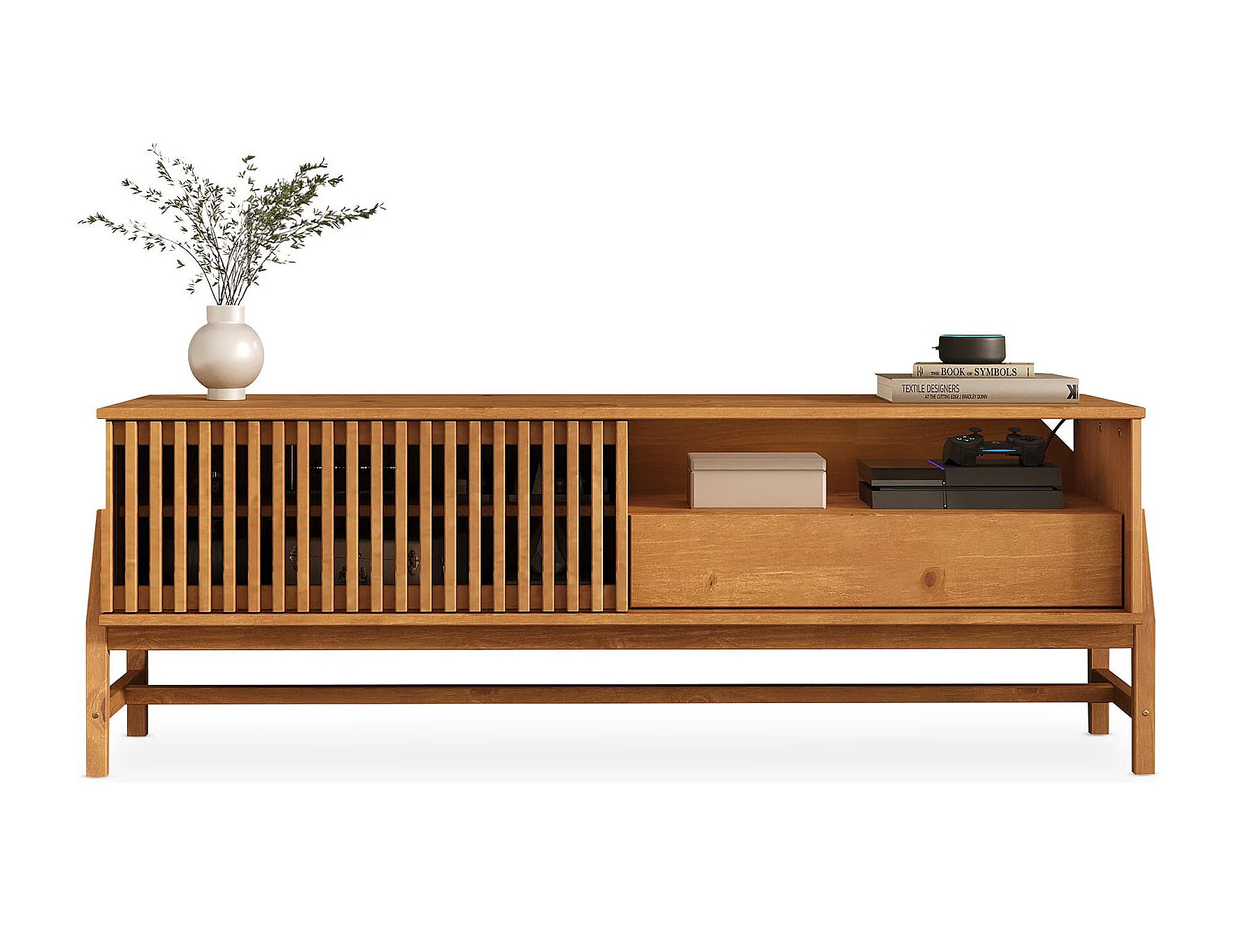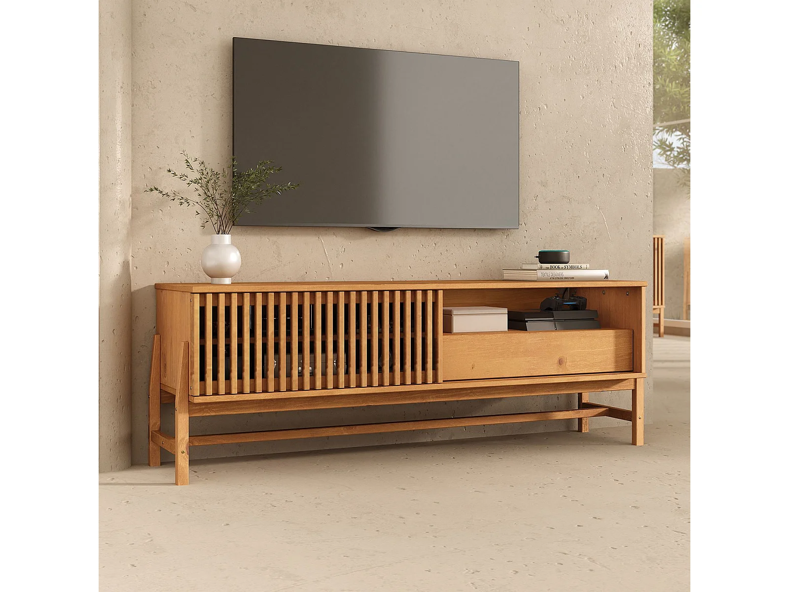 Meuble TV ADAMO L 145 cm en Bois Massif Couleur Chêne avec 1 Porte Coulissante, 1 Tiroir, pour TV jusqu'à 165 cm (65")