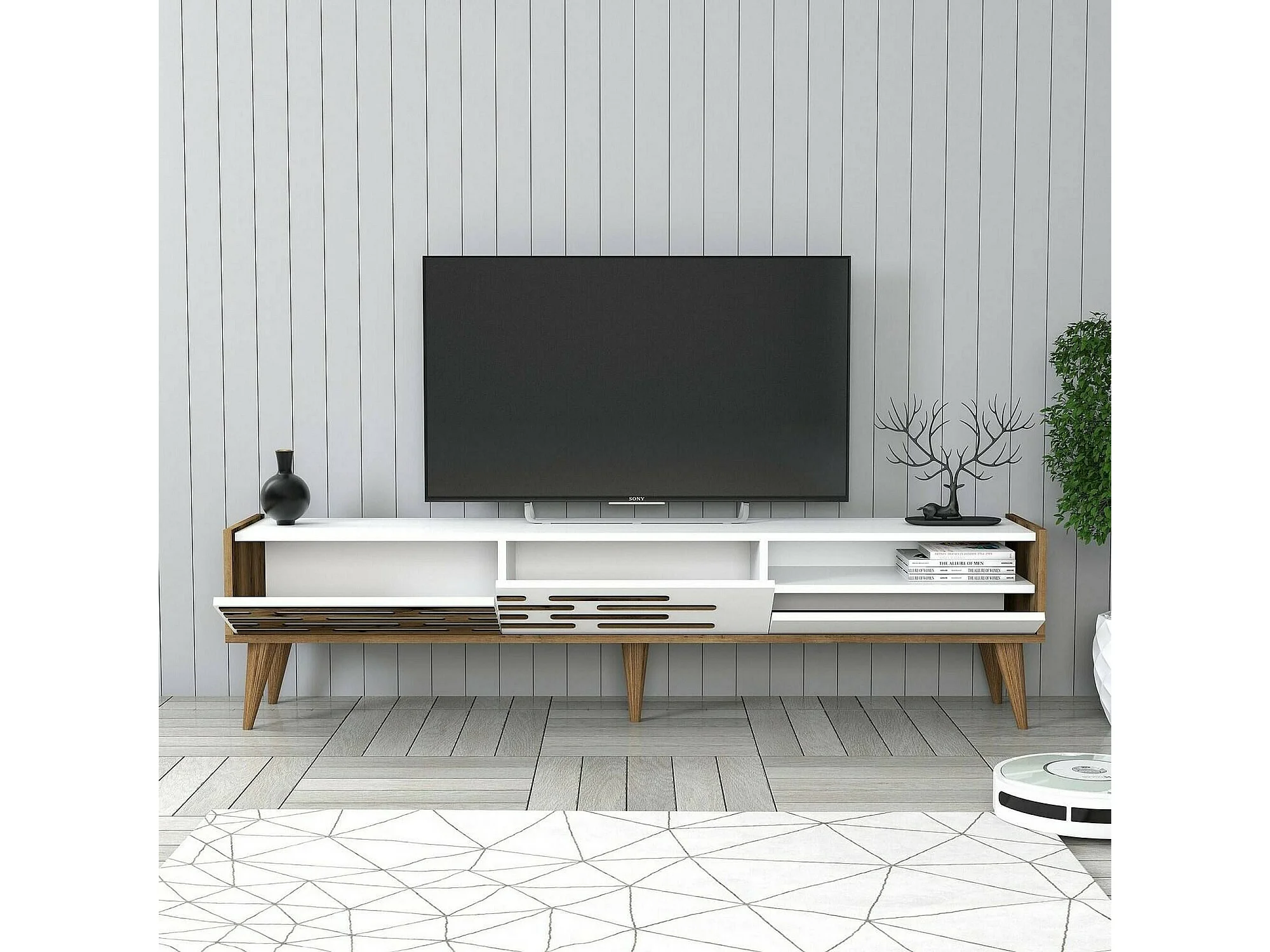 Meuble TV Alnilam, Buffet de salon, Armoire basse pour TV, Base murale de rangement, 180x45h35 cm, Blanc et Noyer