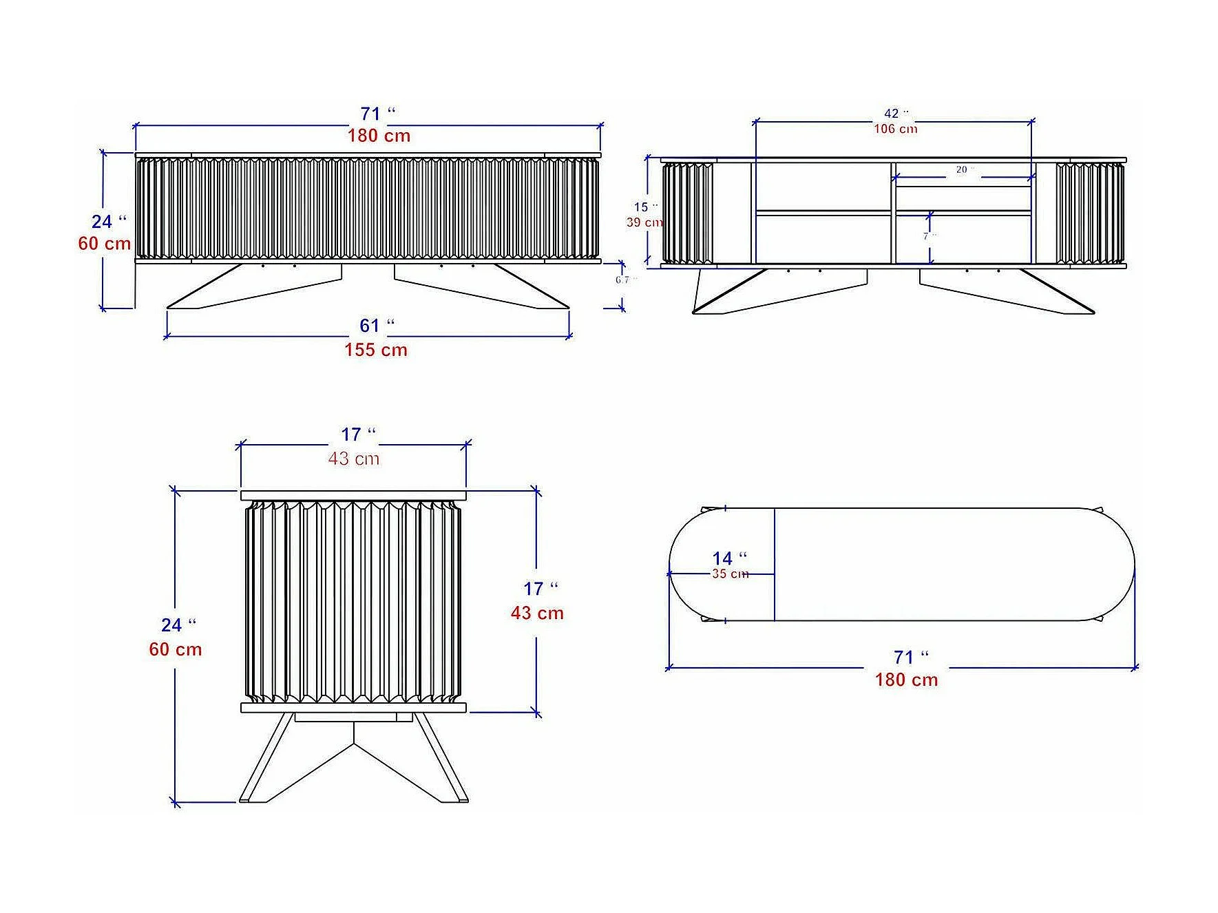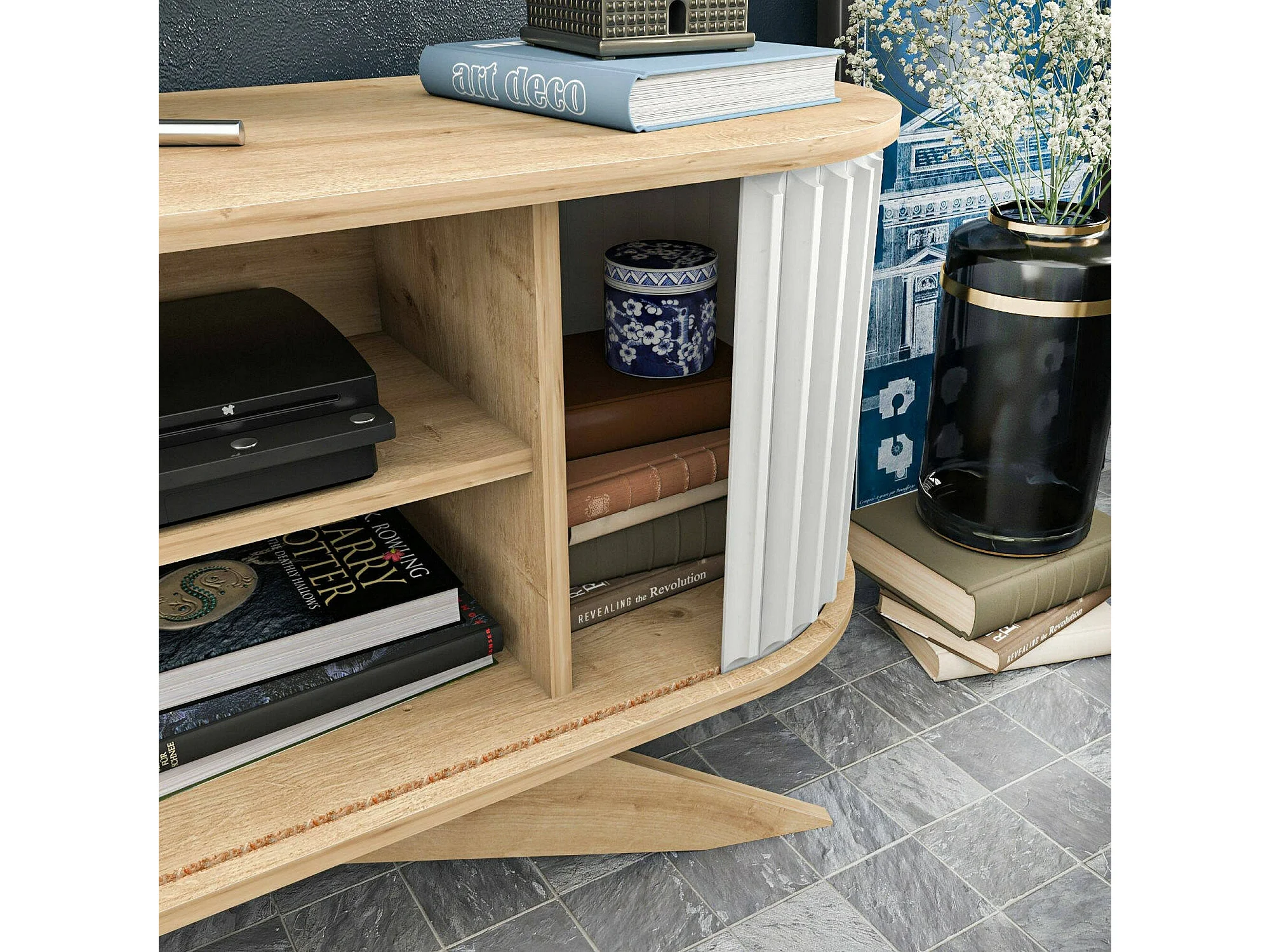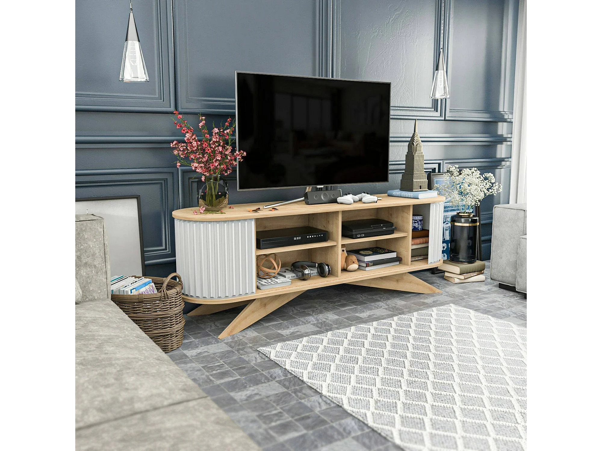 Meuble TV Aludra, Buffet de salon, Armoire basse pour TV, Base murale de rangement, 180x43h60 cm, Chêne et Blanc