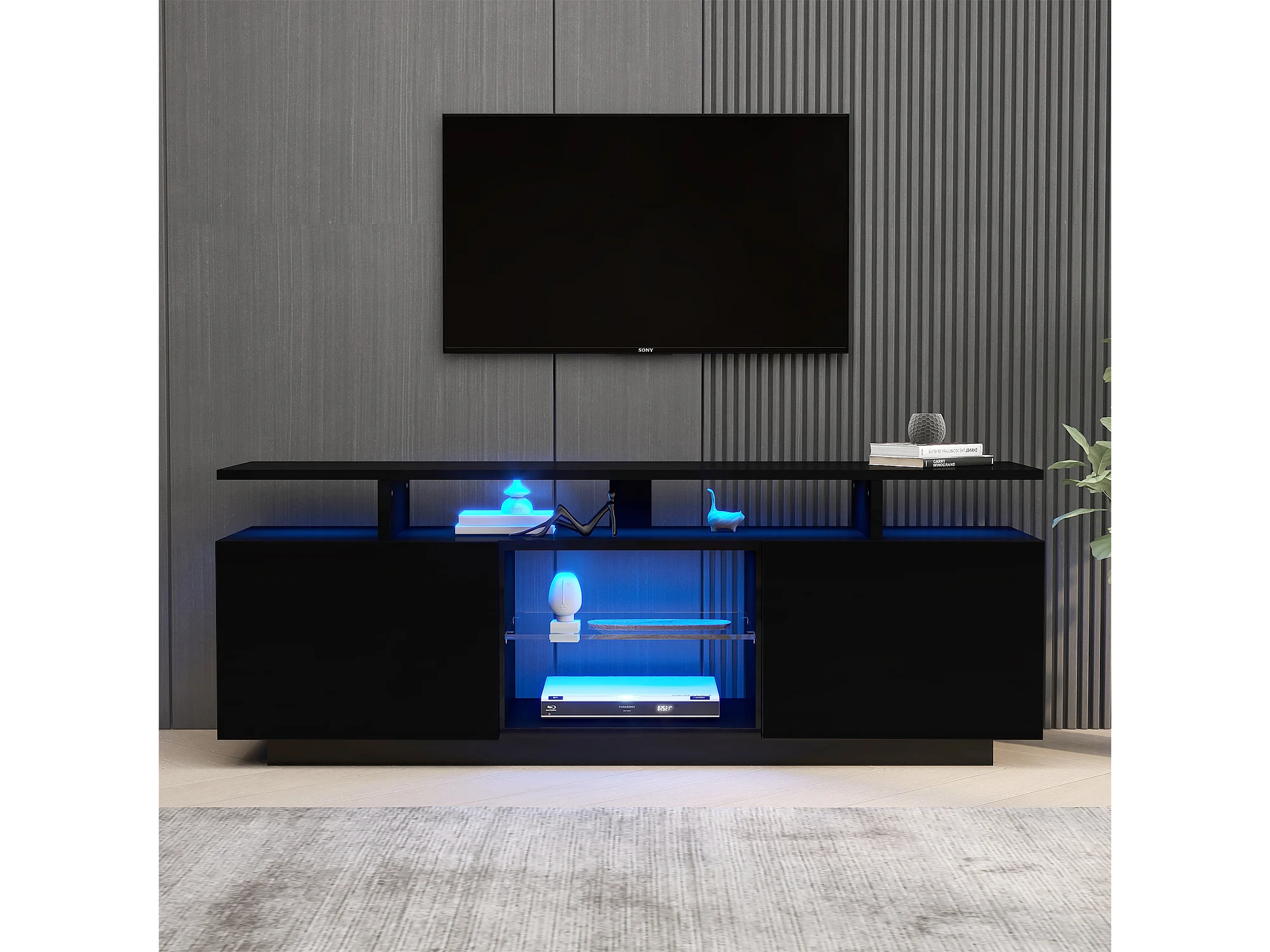 Meuble TV avec 2 portes et étagères pour téléviseur 60" - 140 x 35 x 55 cm - LEDs - Panneaux de particules - Noir brillant