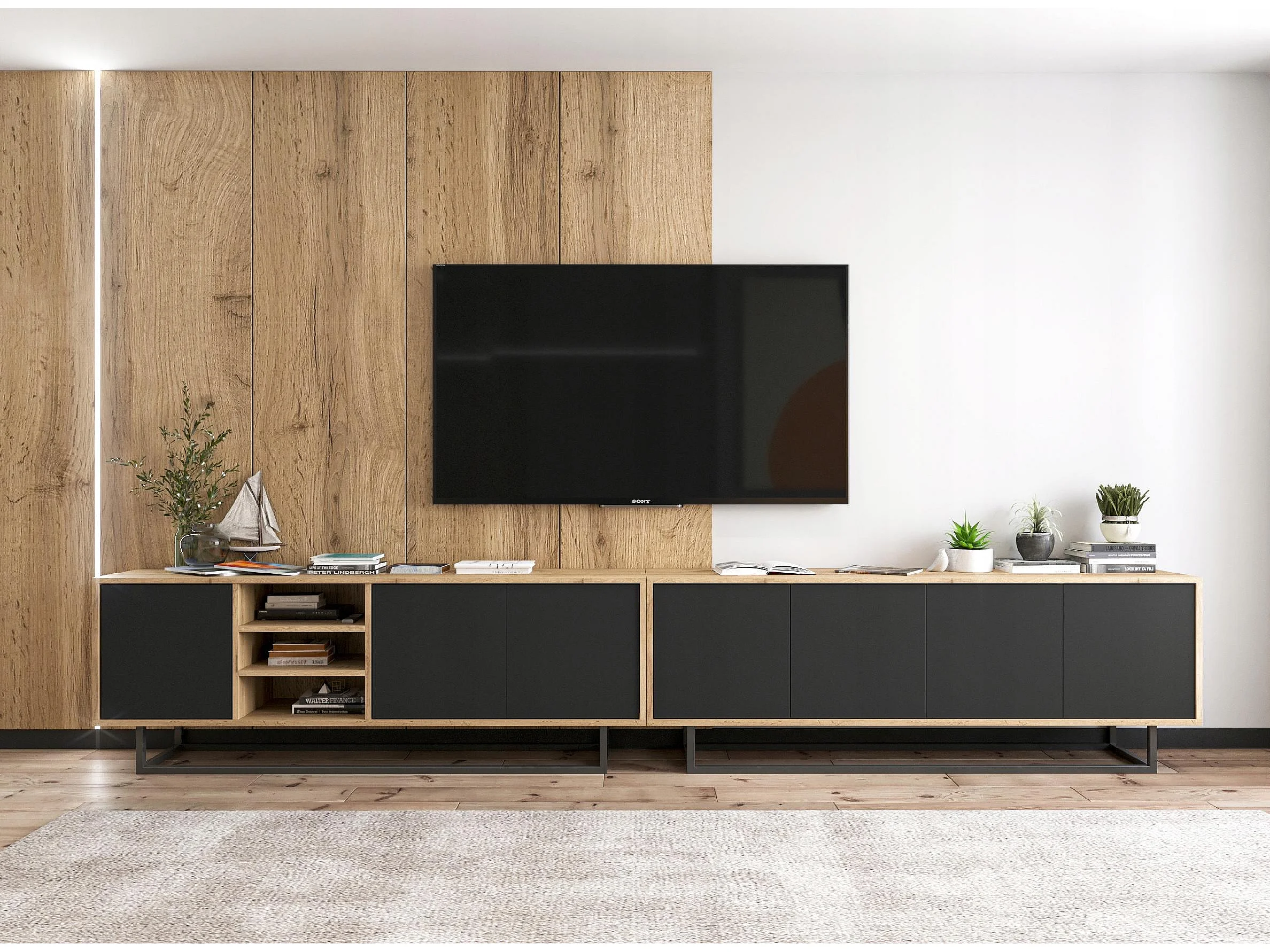 Meuble TV avec 3 portes et 1 niches - carcasse chêne wotan façades noir mat - 150 cm, cadre métallique