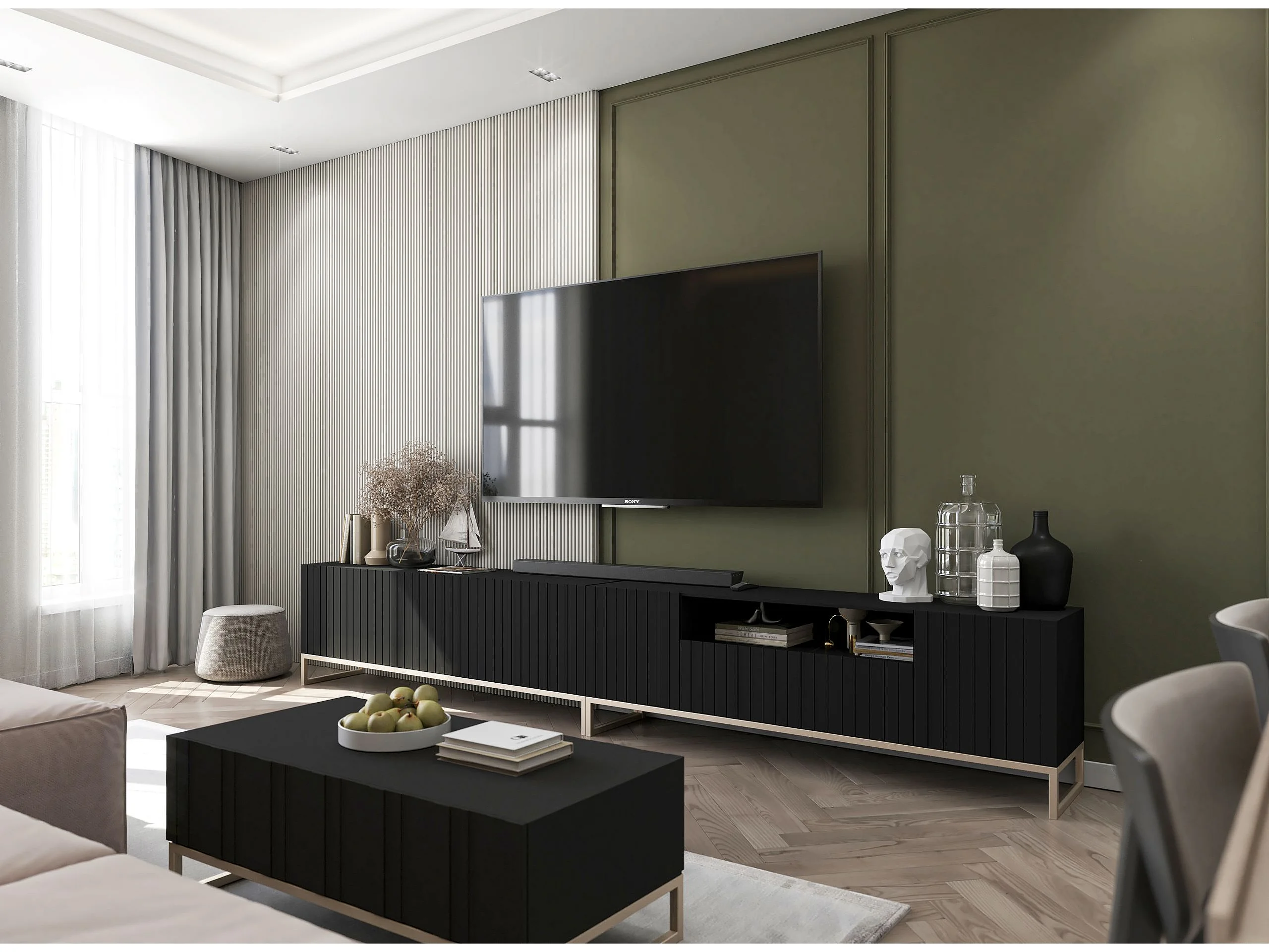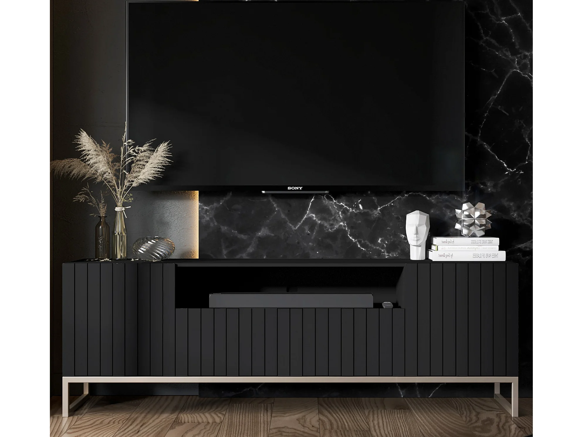 Meuble TV avec 3 portes et niche - Corps Noir mat, façades rainurées Noir mat - 150 cm, cadre en métal