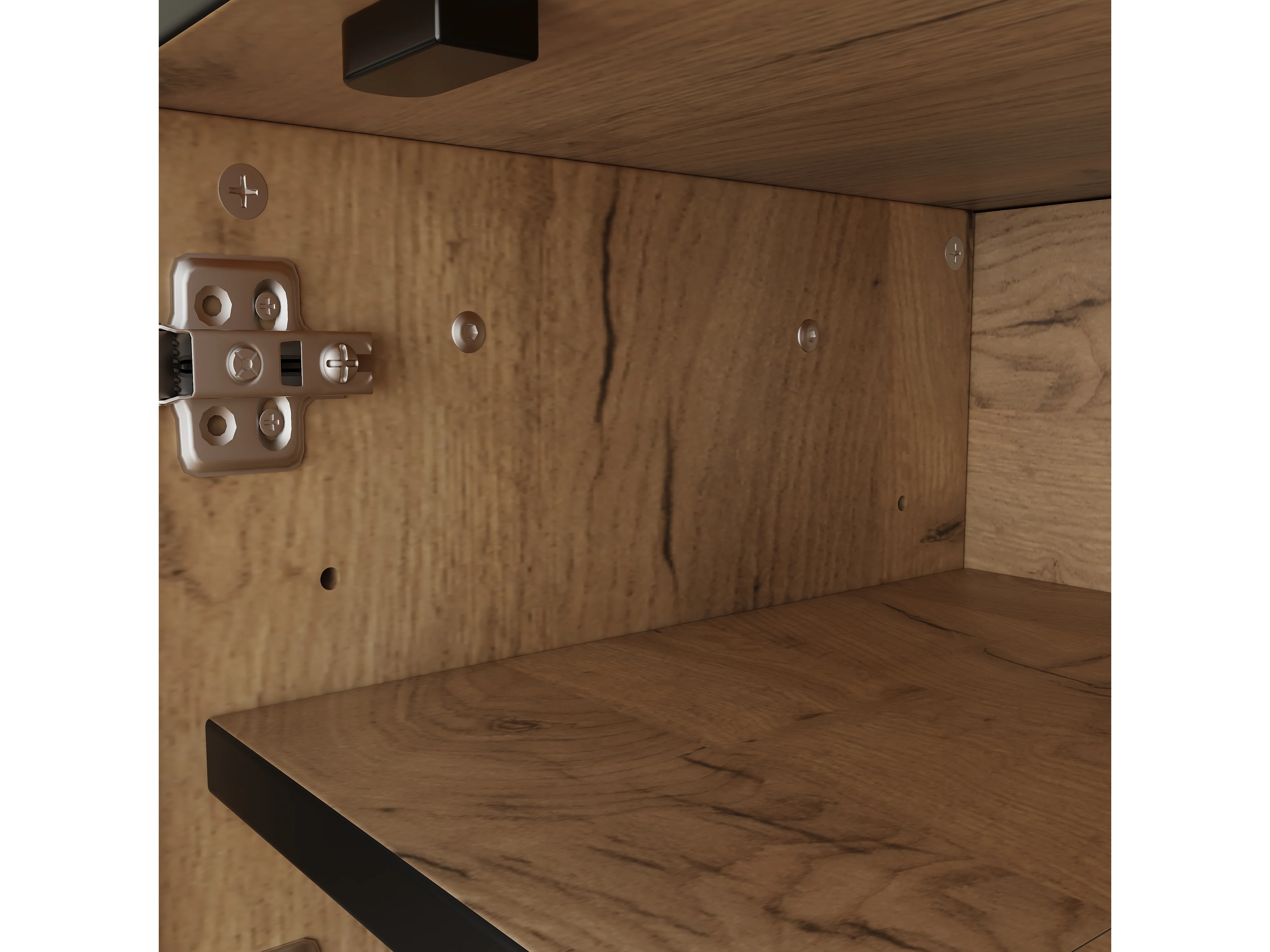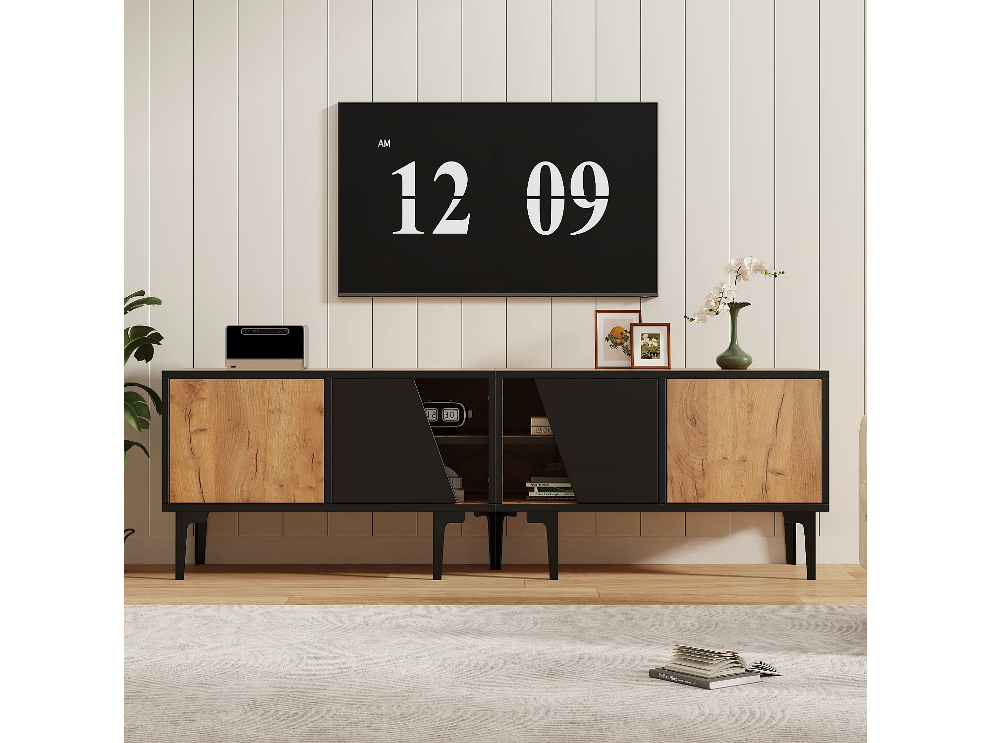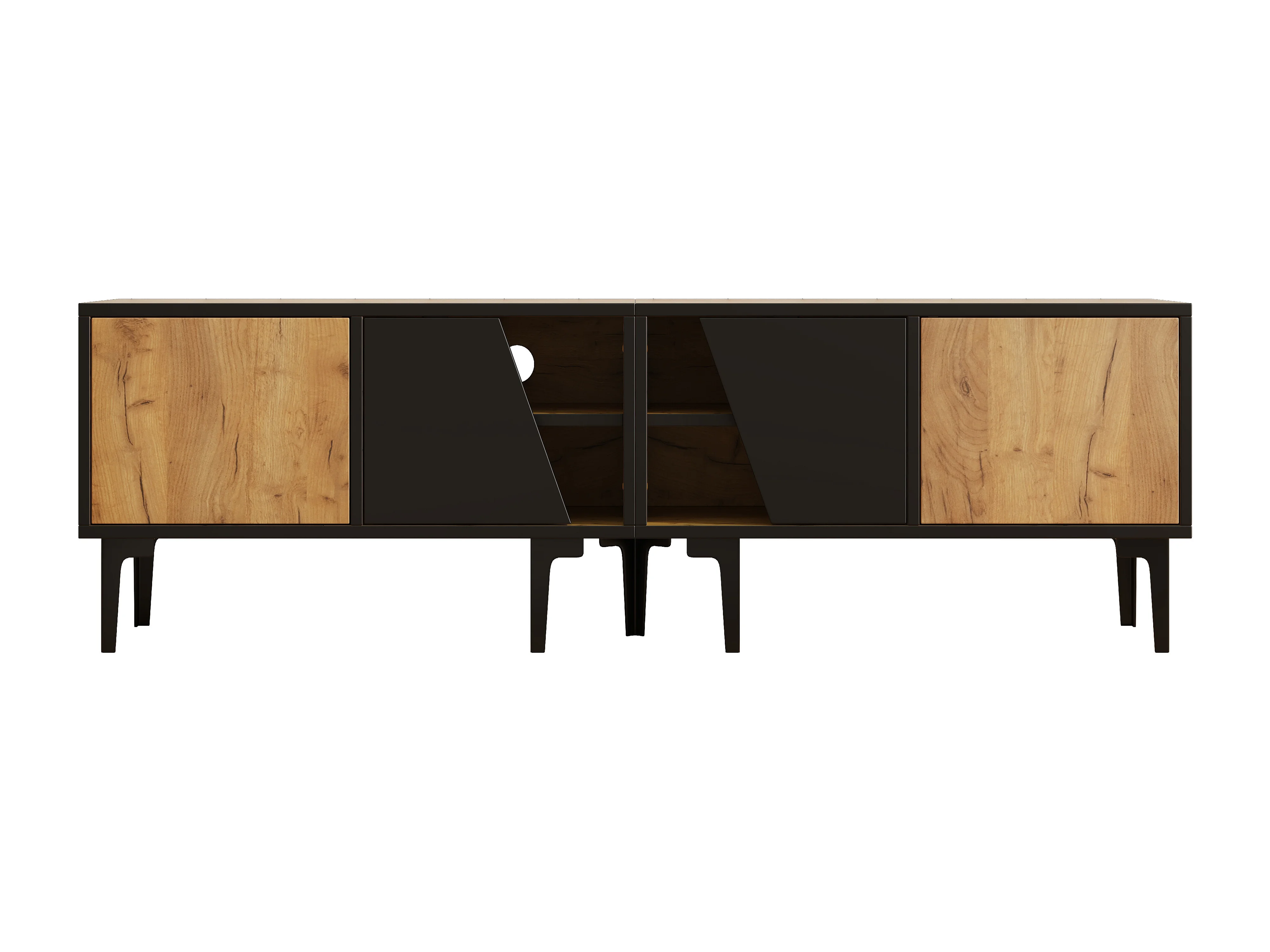 Meuble TV avec 4 compartiments - Portes inclinées - Couleur bois et noir