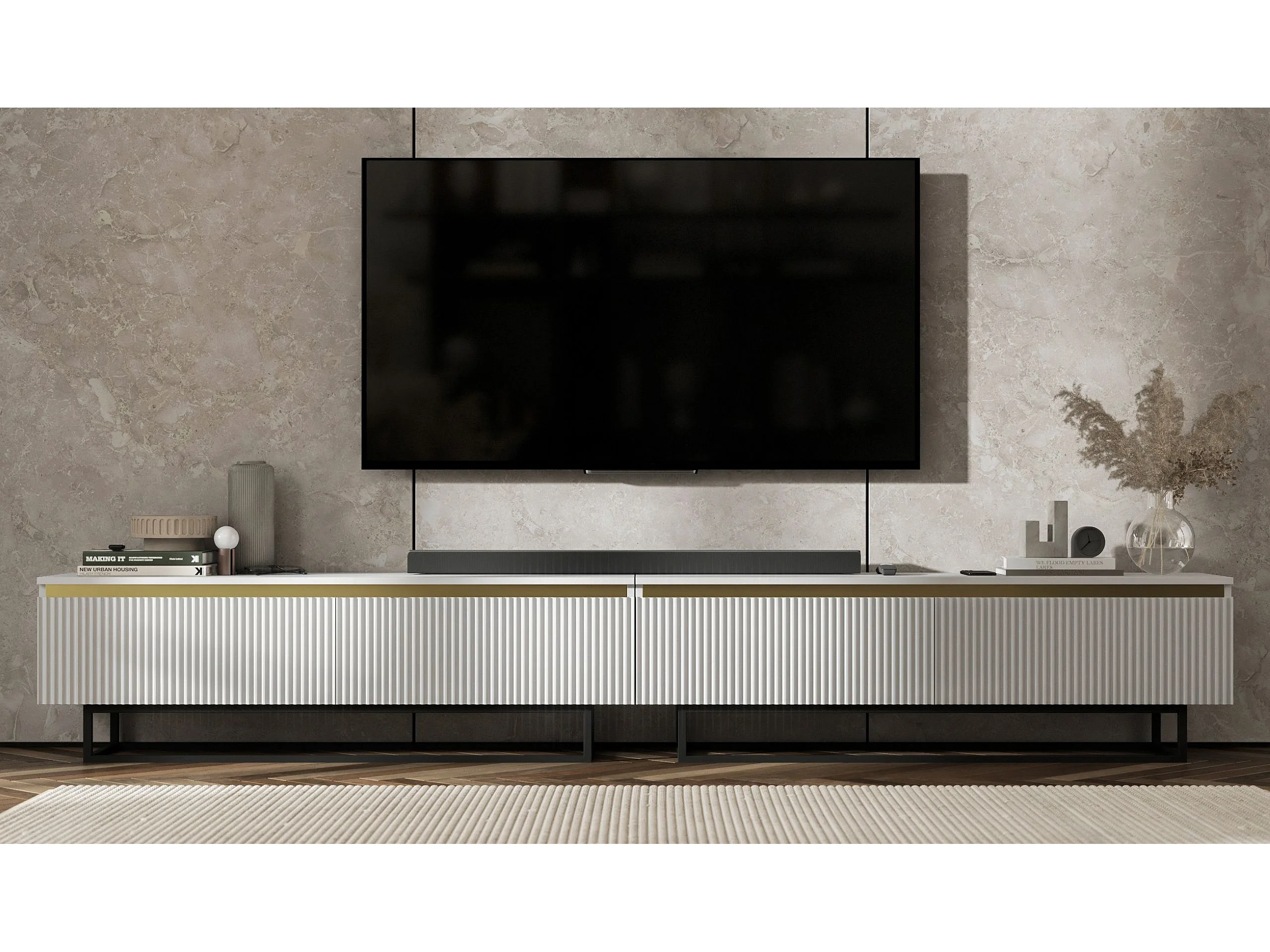 Meuble TV avec 4 portes - Corps Blanc mat, façades rainurées Blanc mat - 280 cm, Cadre en métal noir
