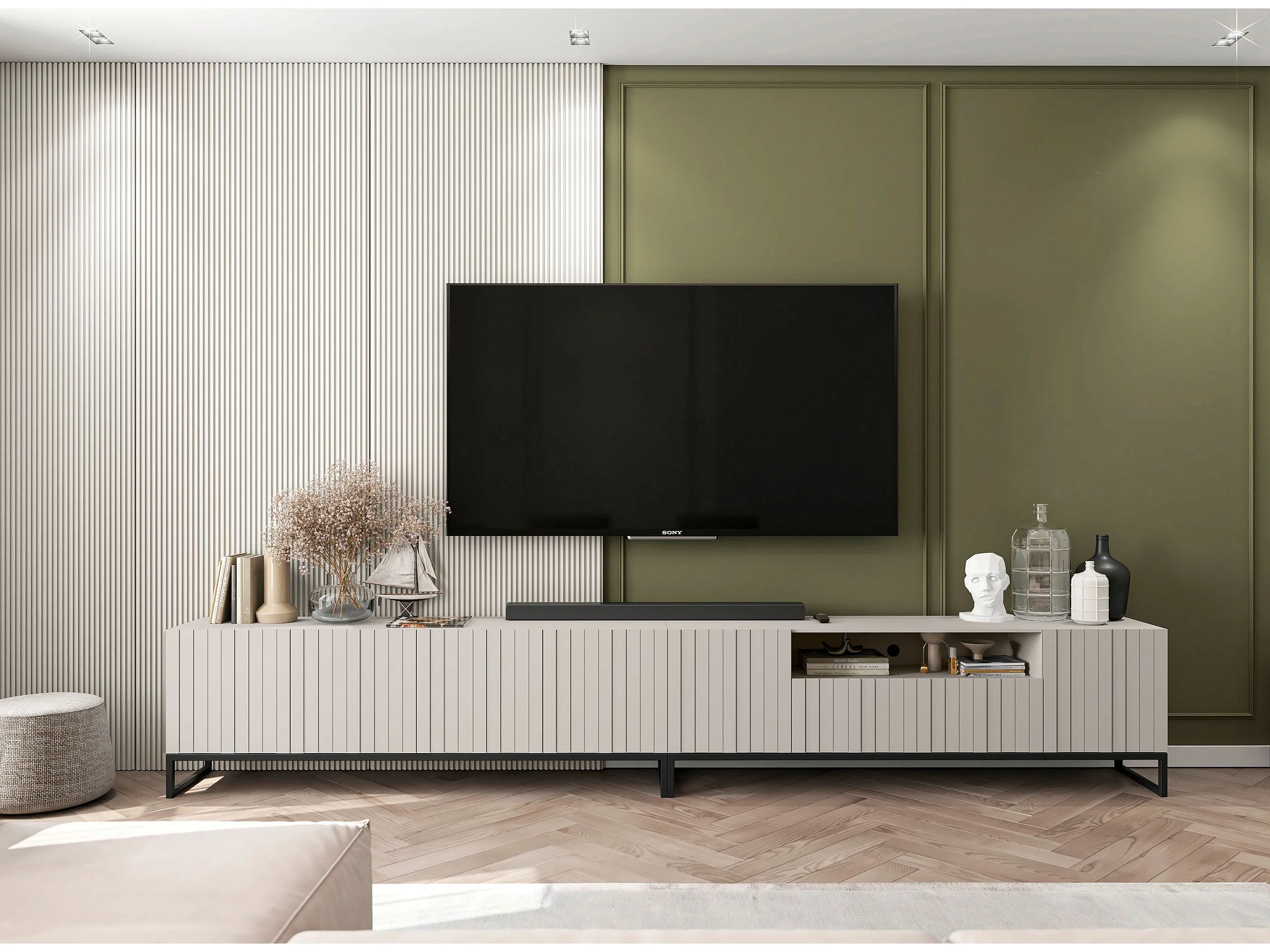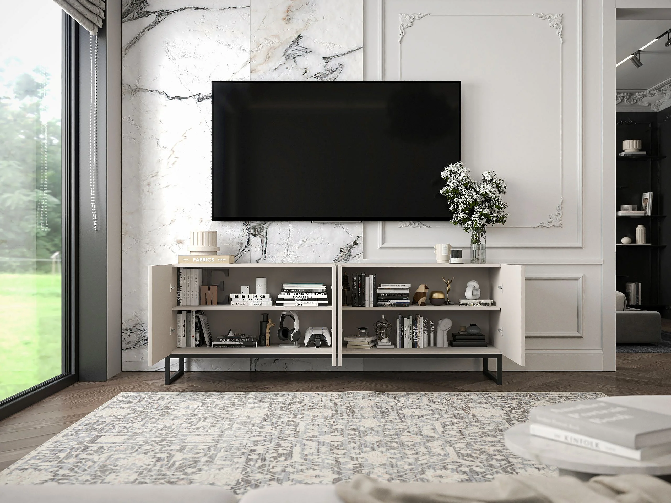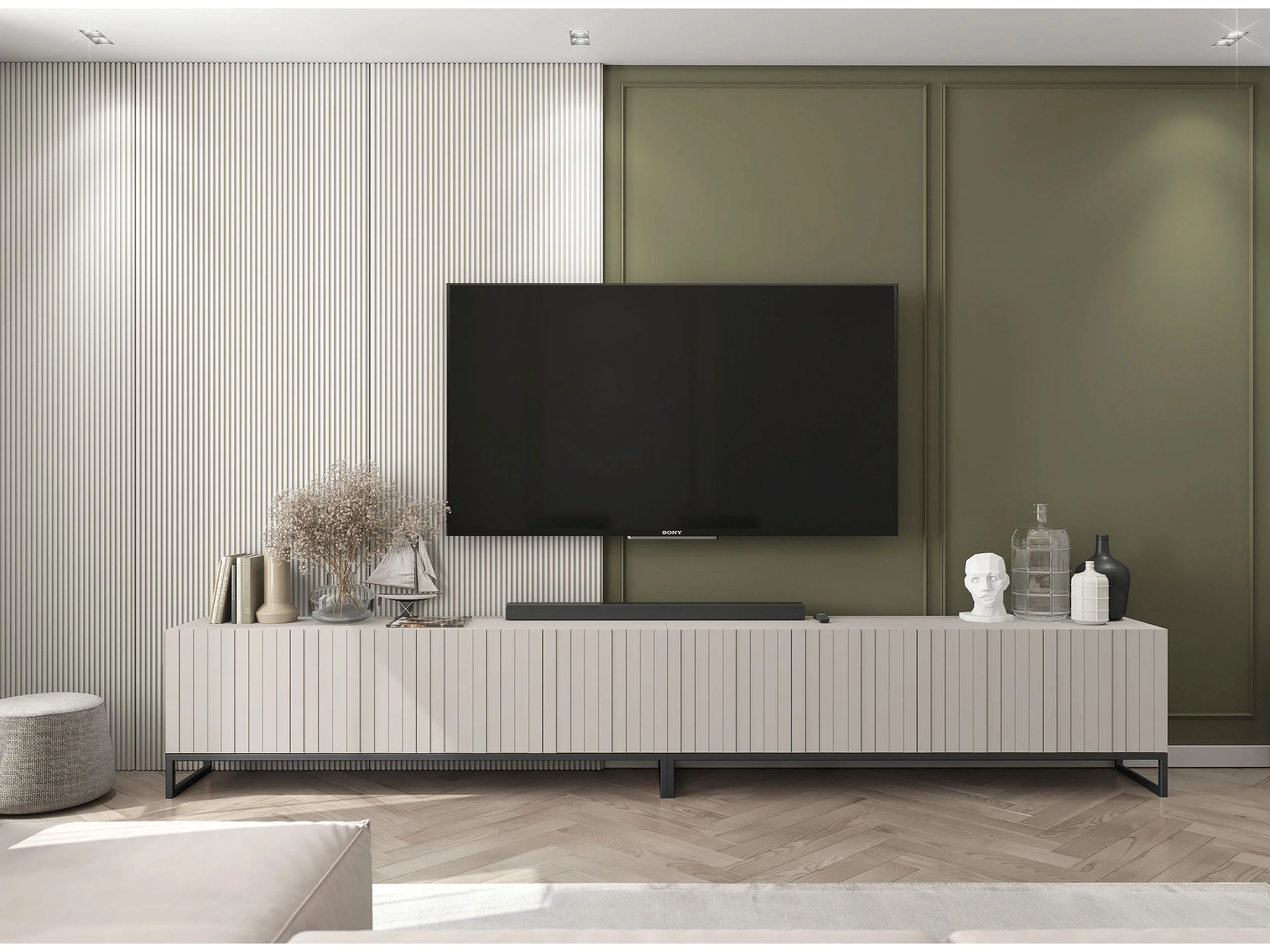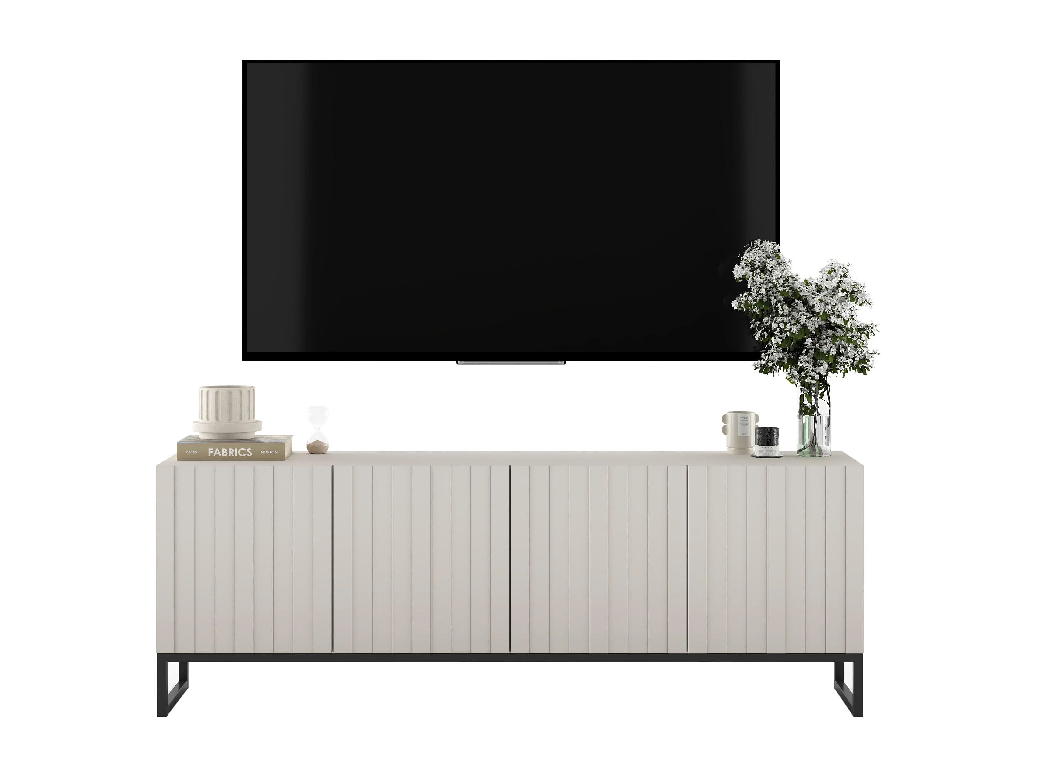 Meuble TV avec 4 portes - Corps Cachemire mat, façades rainurées Cachemire mat - 150 cm, Cadre en métal noir