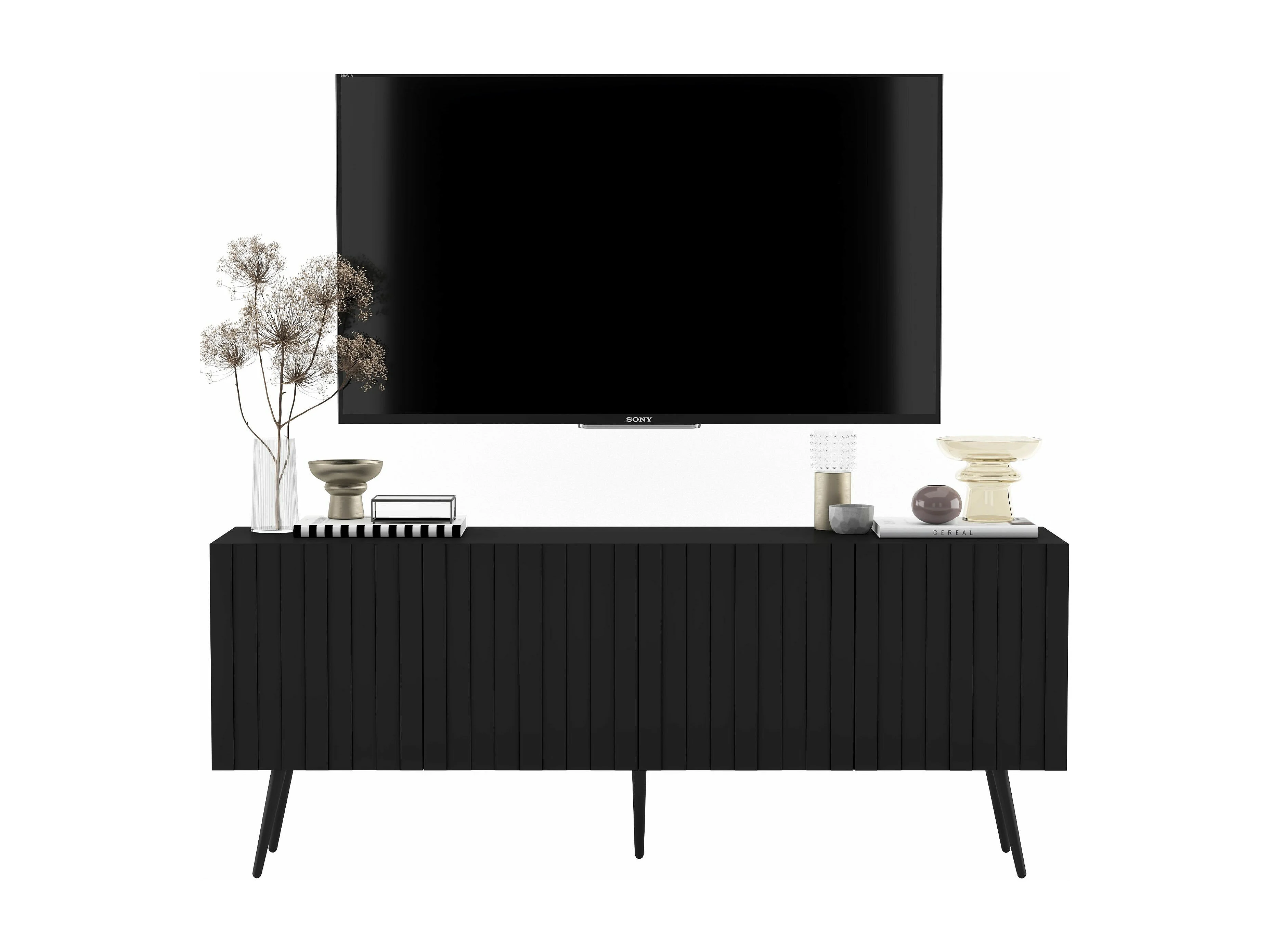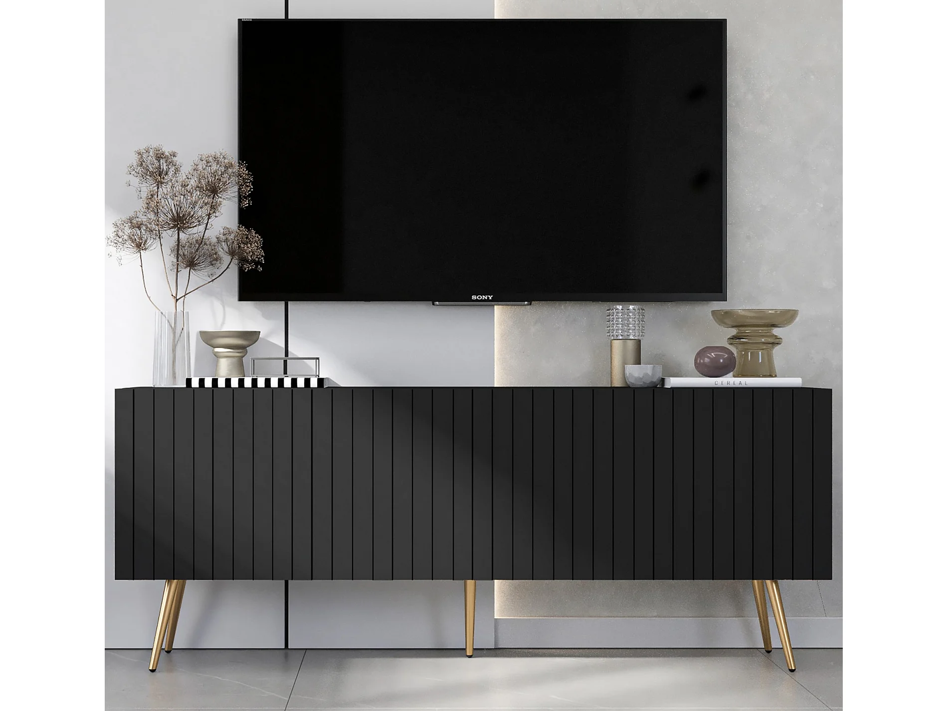 Meuble TV avec 4 portes - Corps Noir mat, façades rainurées Noir mat - 150 cm, pieds dorés