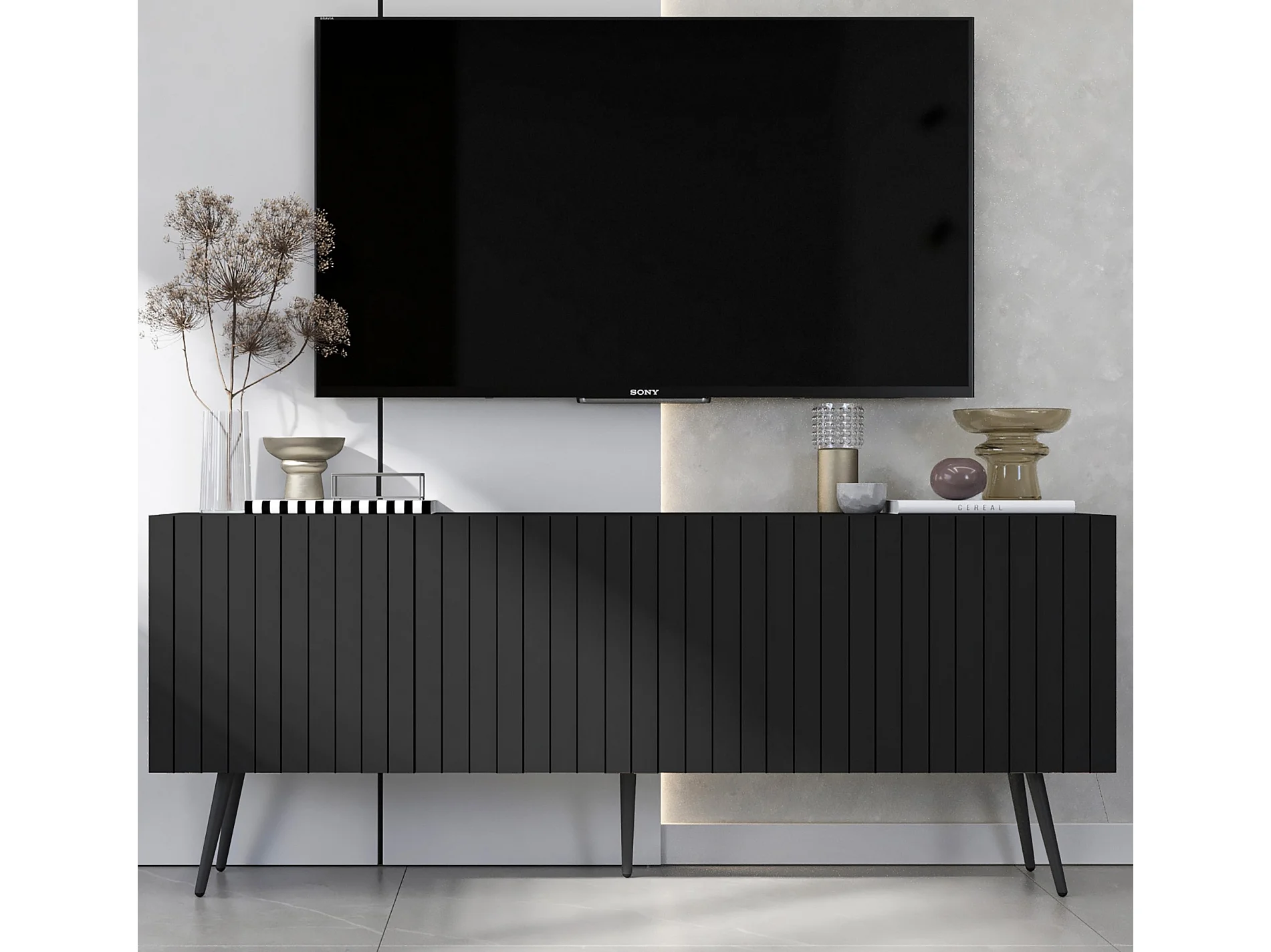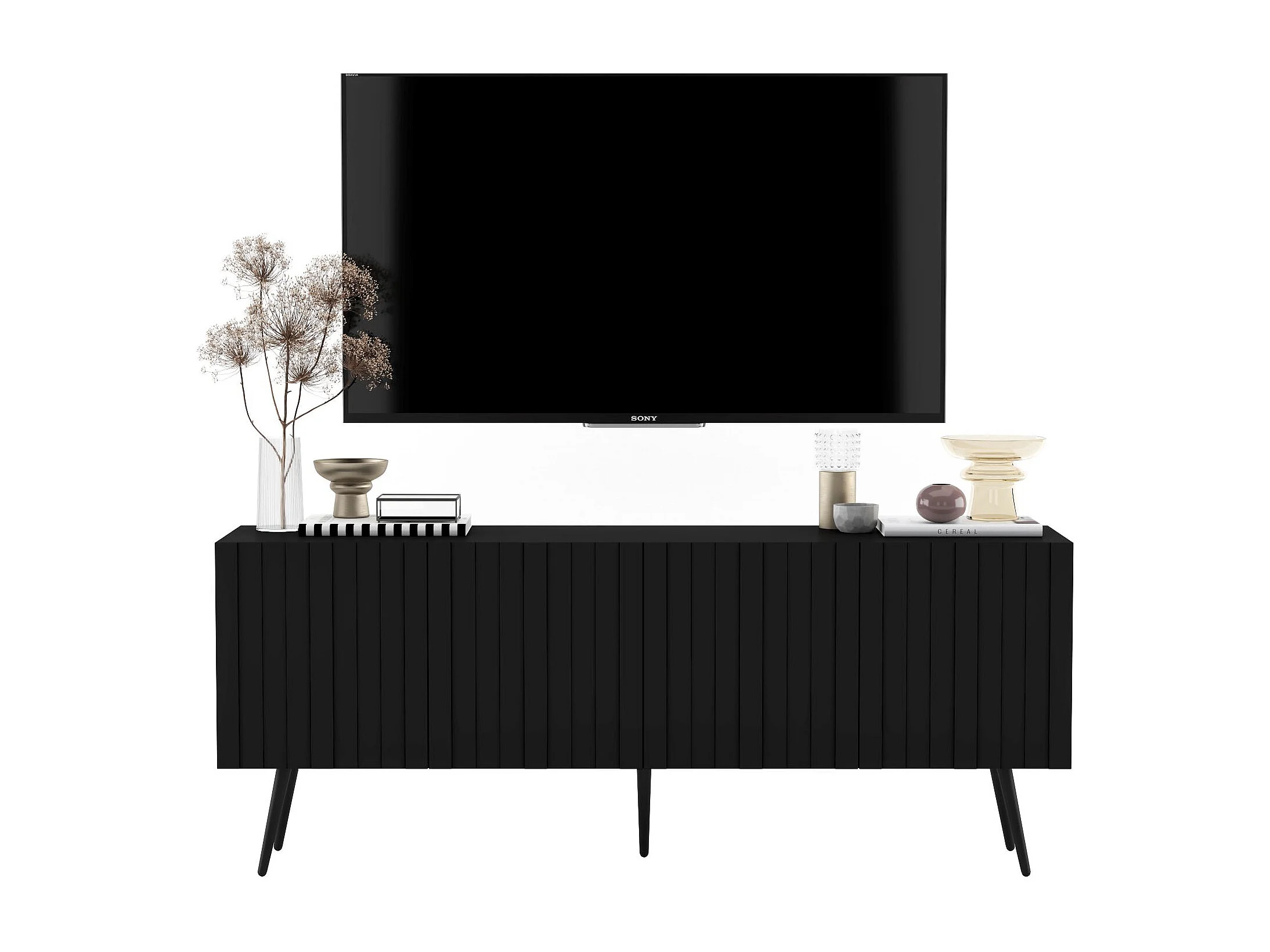 Meuble TV avec 4 portes - Corps Noir mat, façades rainurées Noir mat - 150 cm, pieds noirs