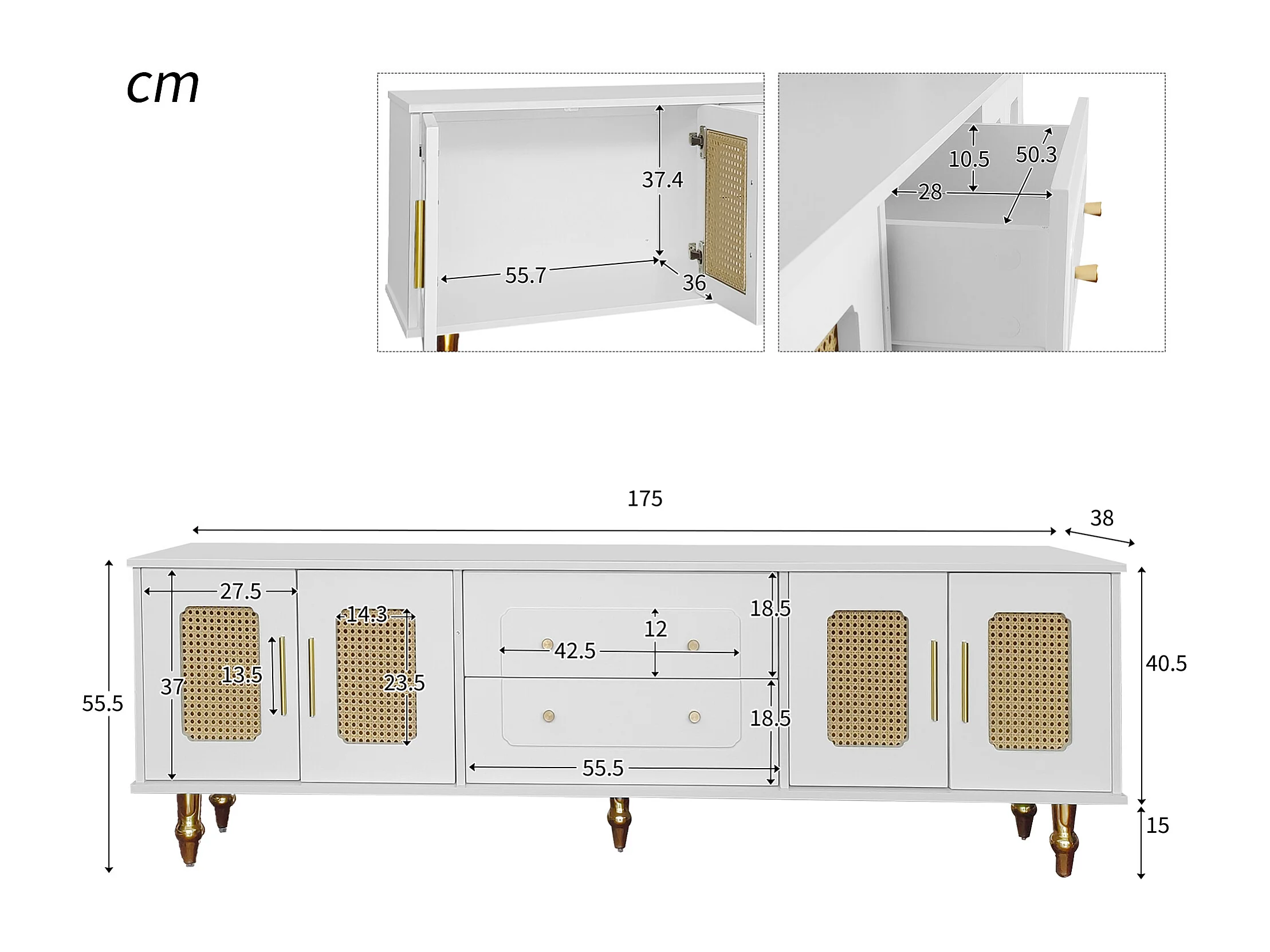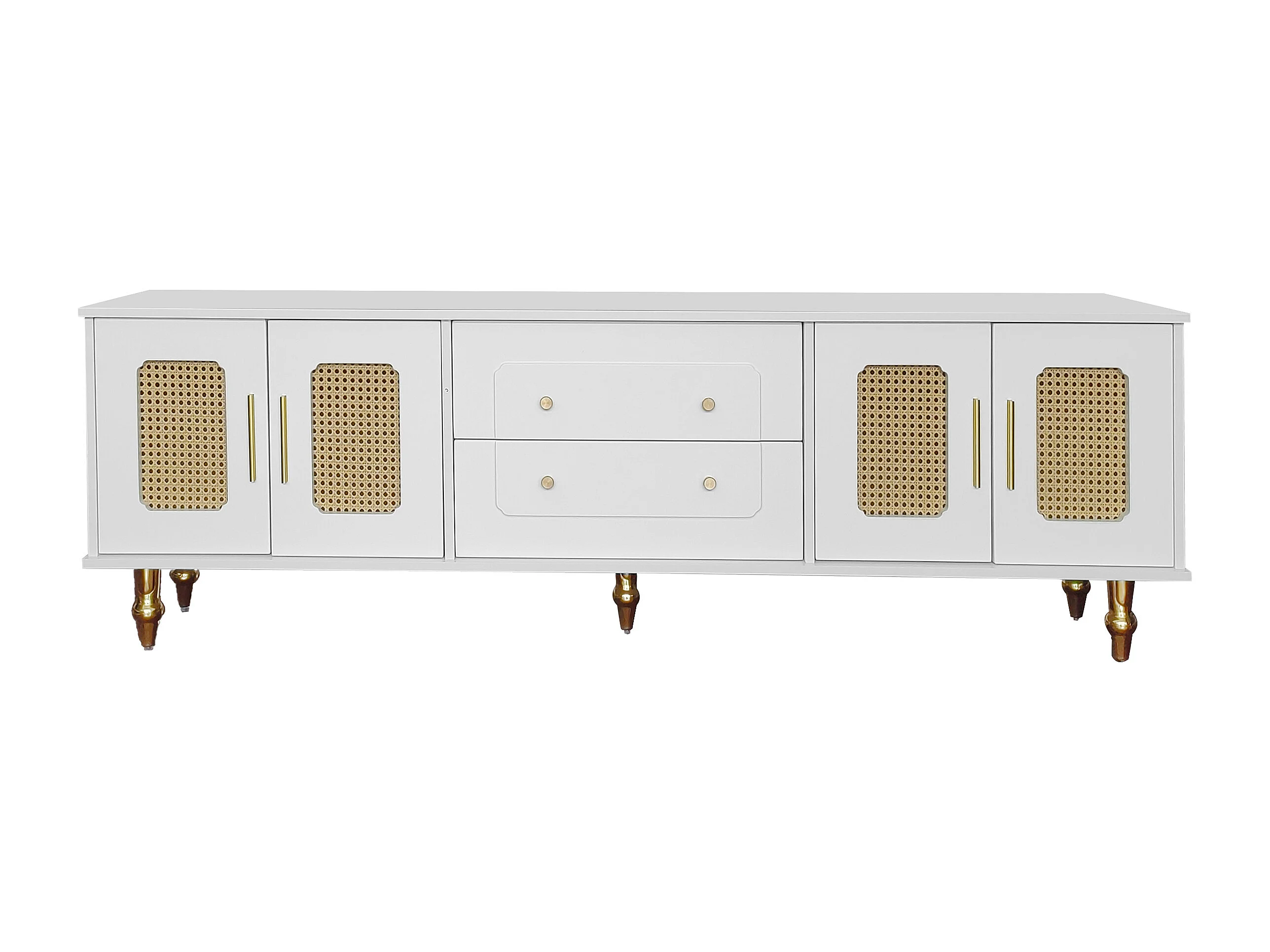 Meuble TV avec 4 portes en rotin et 2 tiroirs - Pieds en métal doré- Blanc