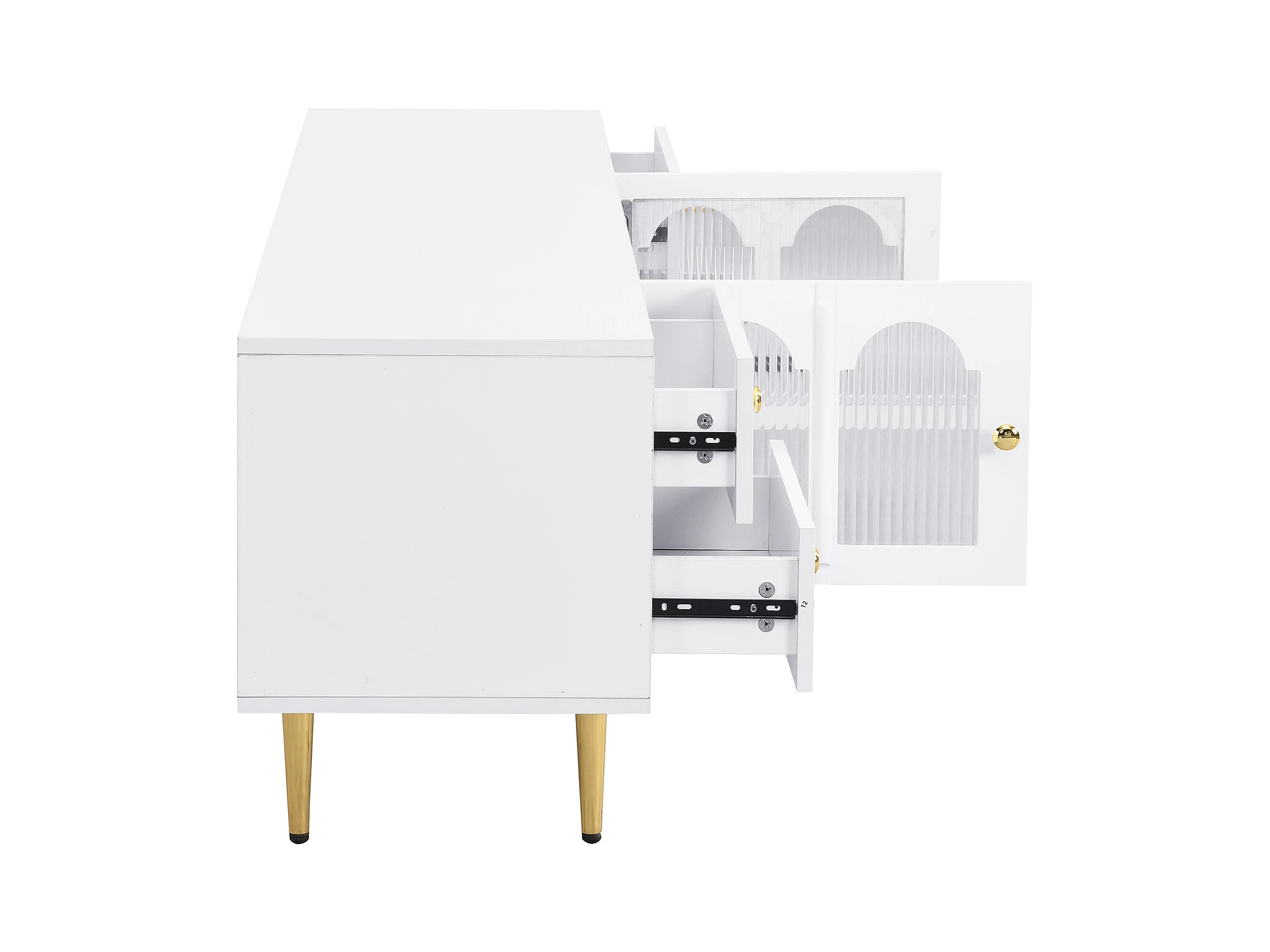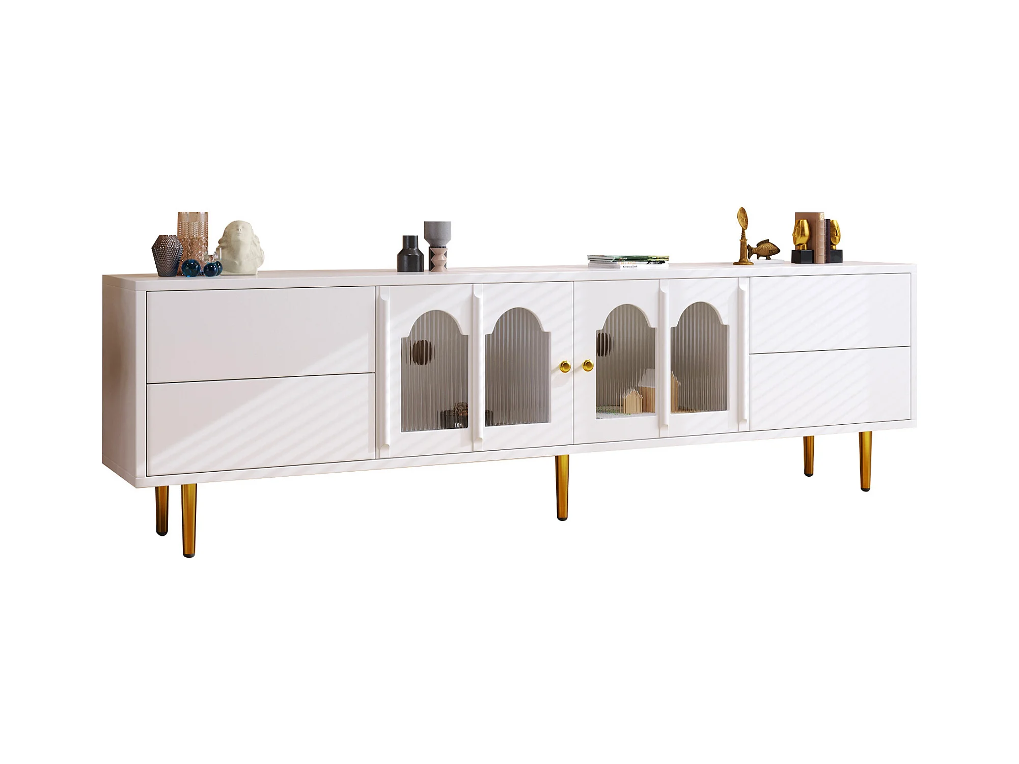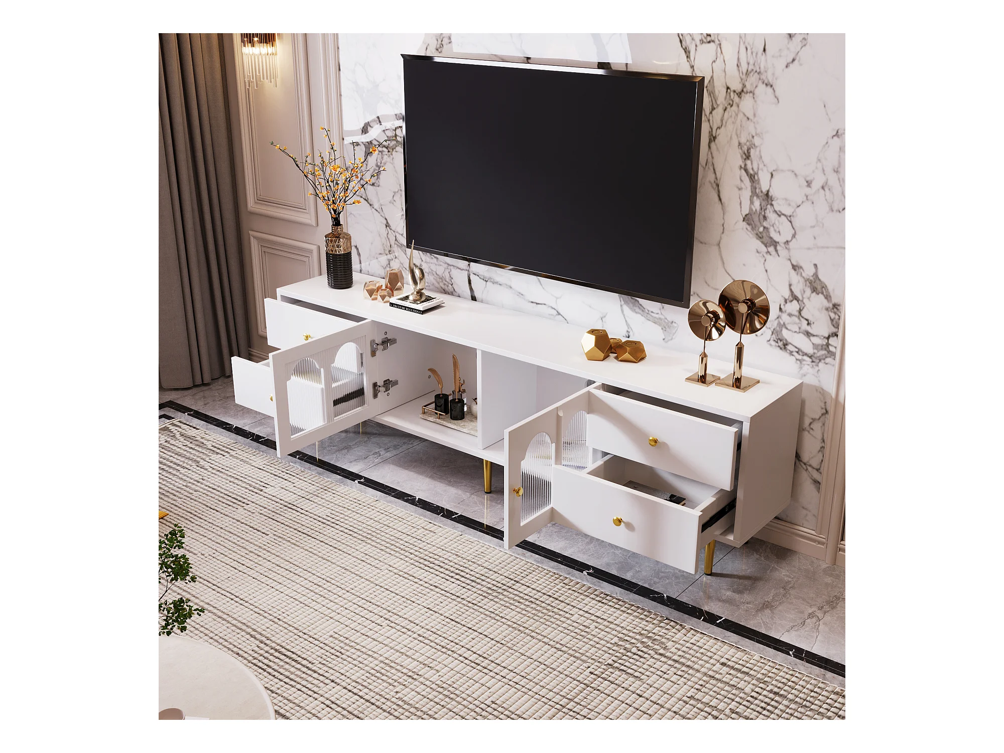 Meuble TV avec 4 tiroirs et 2 portes - 170 x 38 x 50 cm - Bois MDF - Poignées et pieds dorés - Blanc