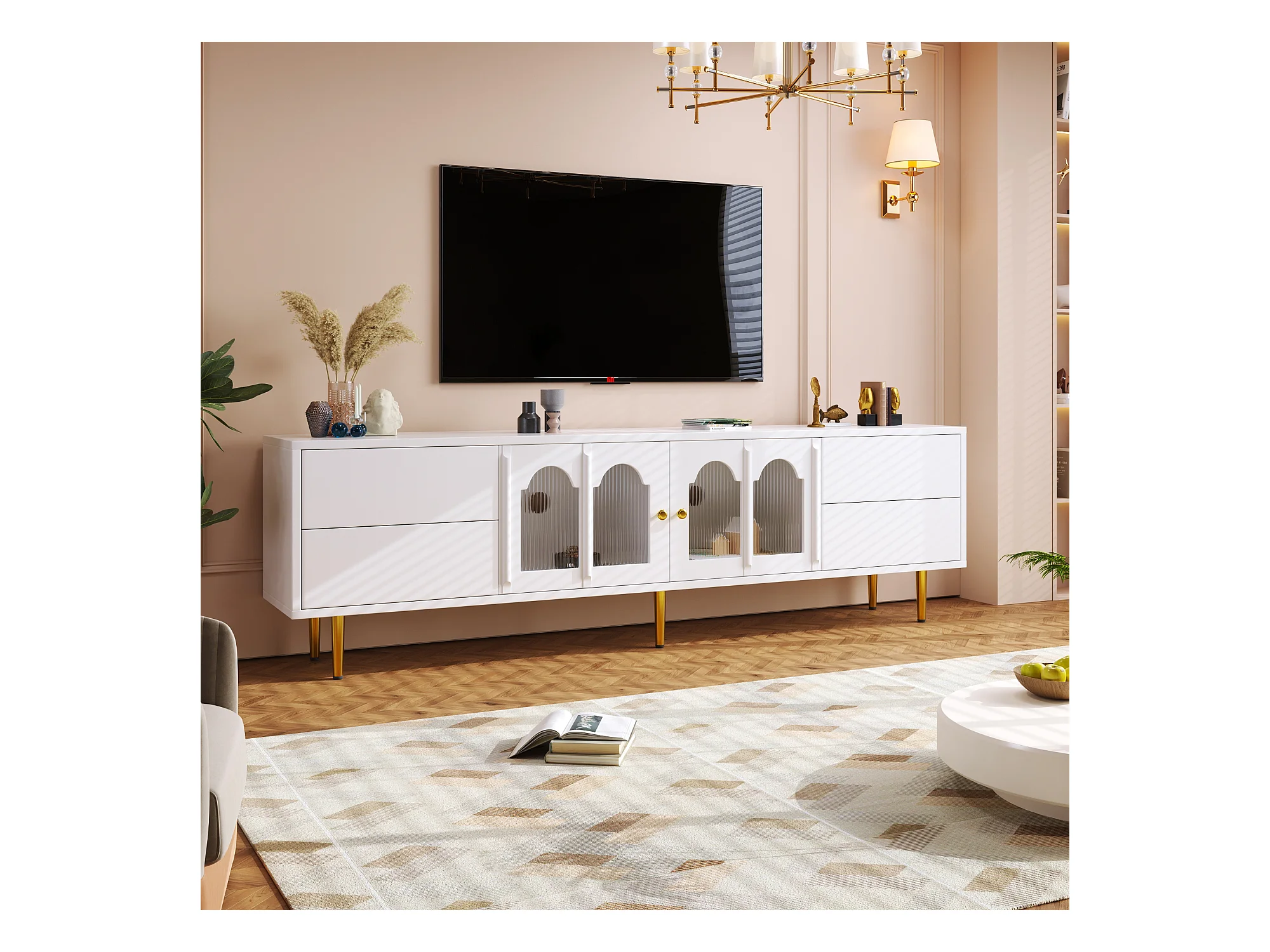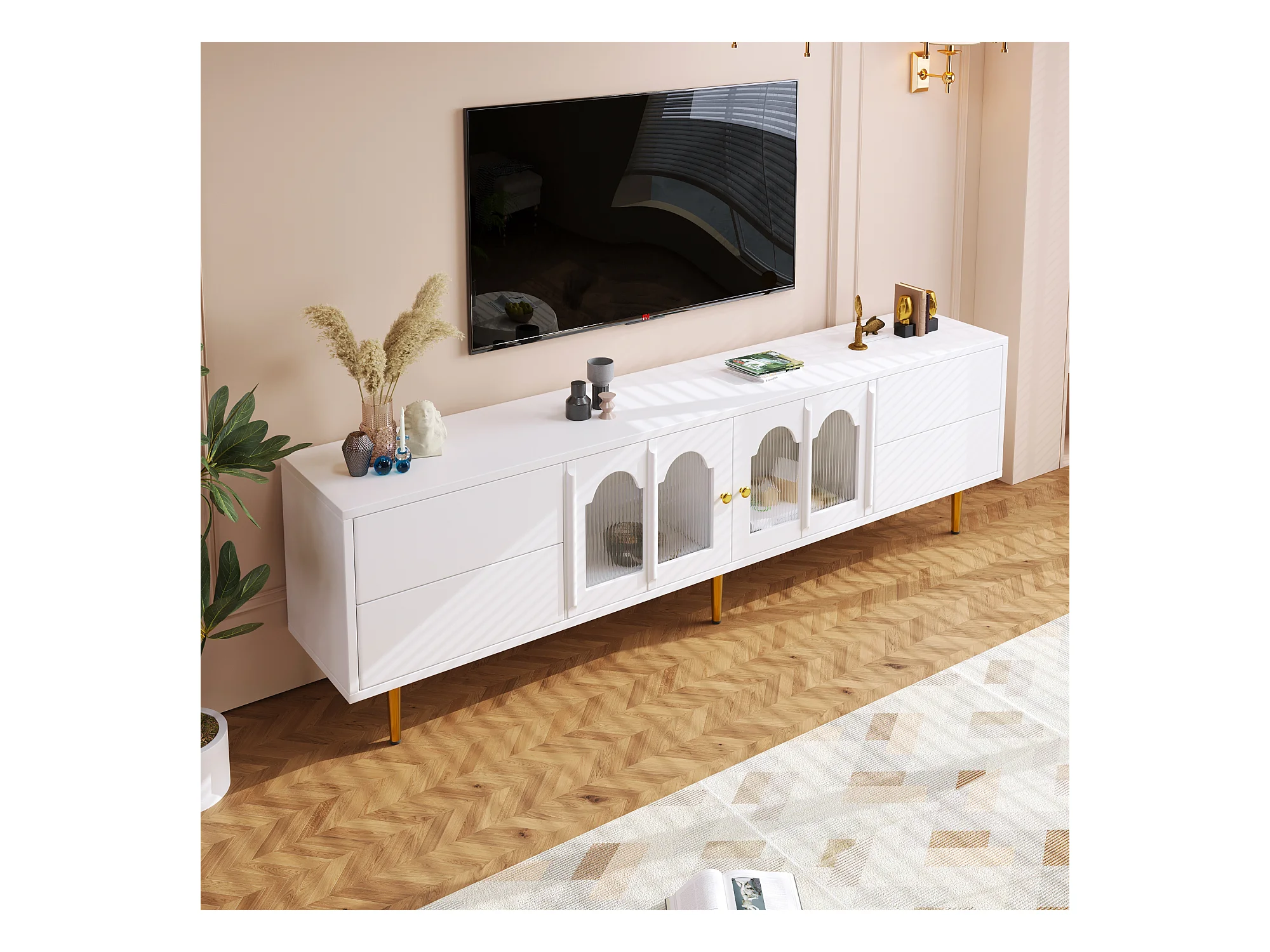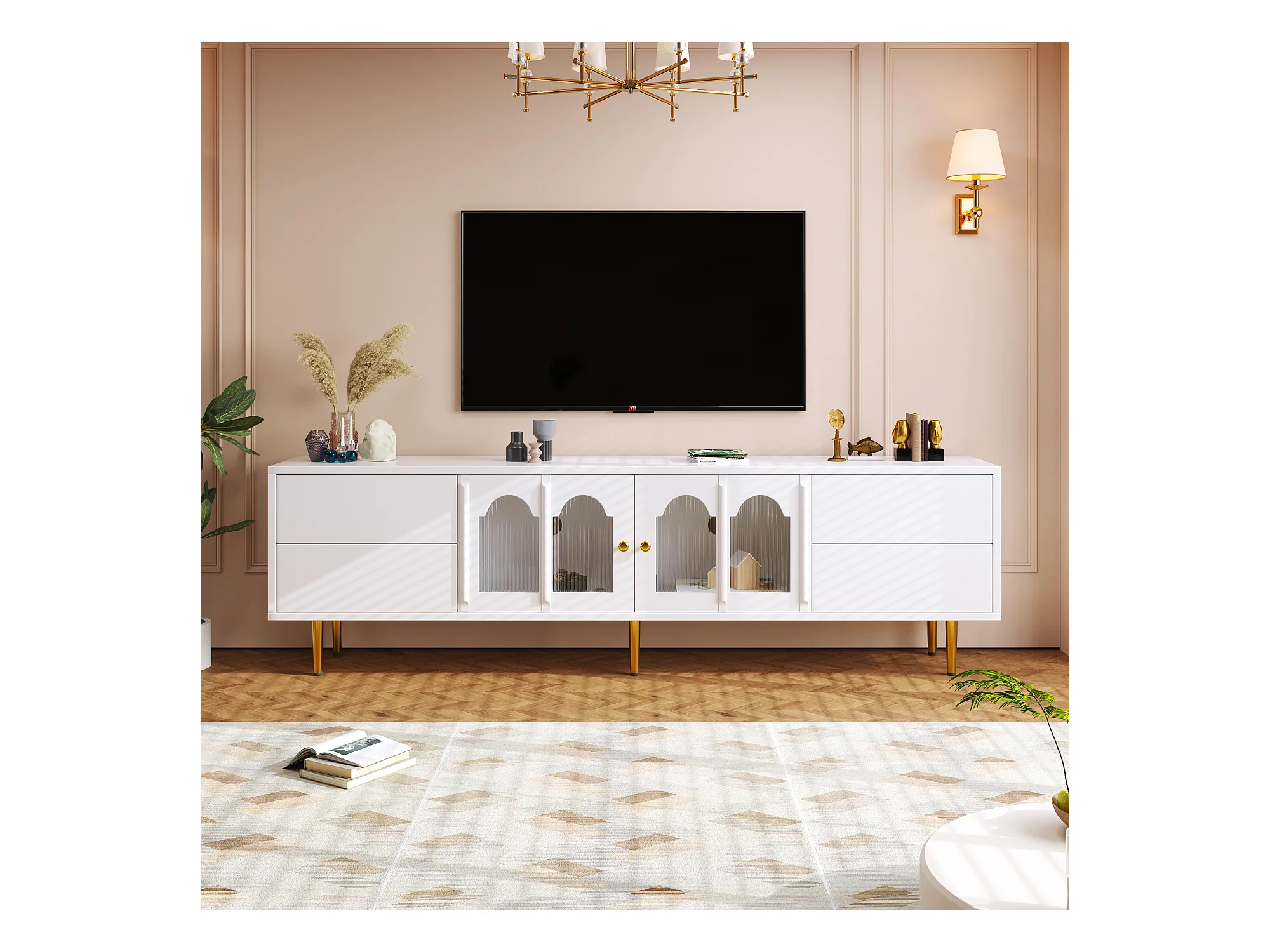 Meuble TV avec 4 tiroirs et 2 portes - 170 x 38 x 50 cm - Bois MDF - Poignées et pieds dorés - Blanc
