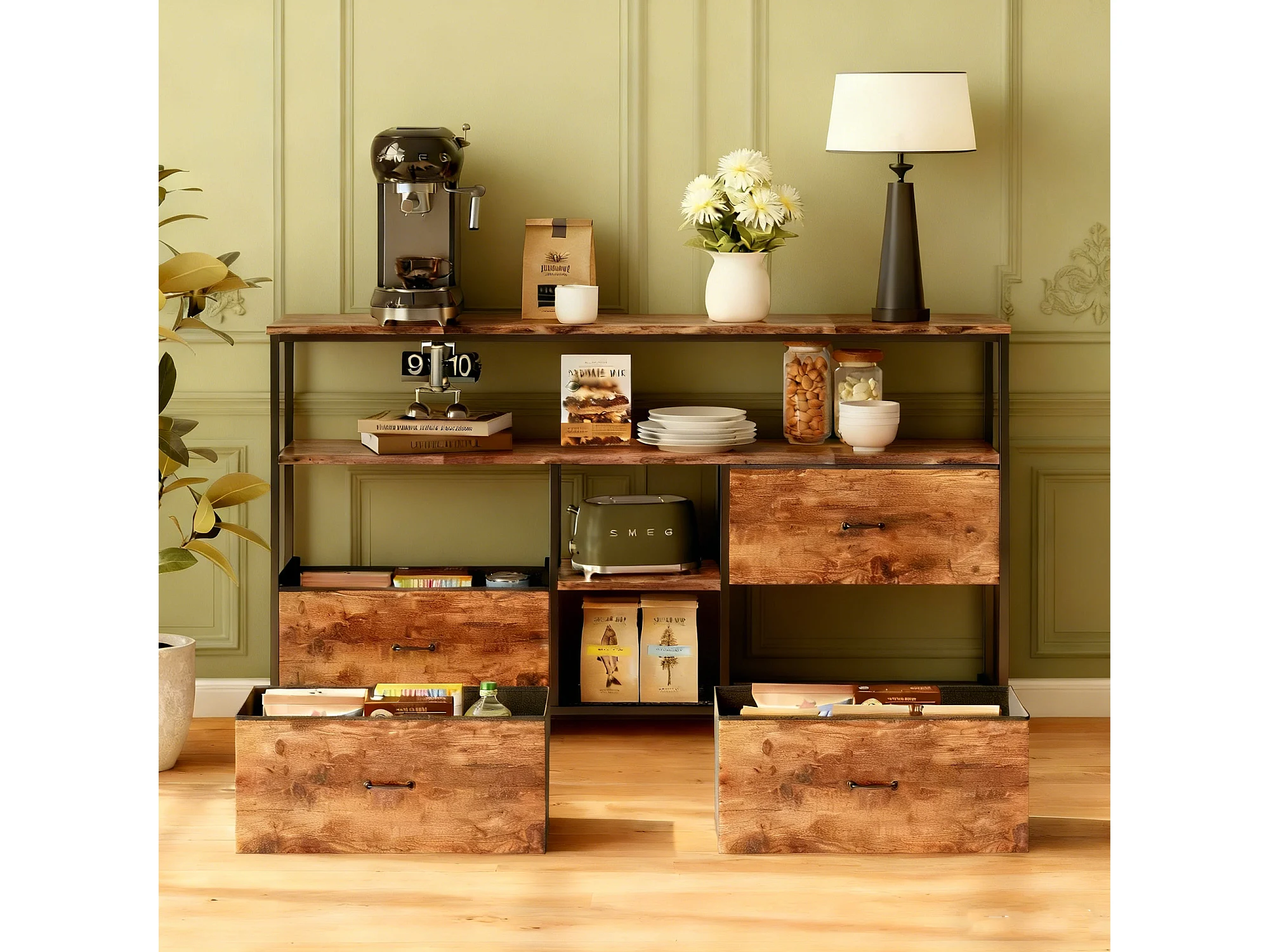 Meuble TV avec 4 tiroirs et 3 étagère - LEDs - Acier - 137x78x29 cm - Style Industriel - grain de bois