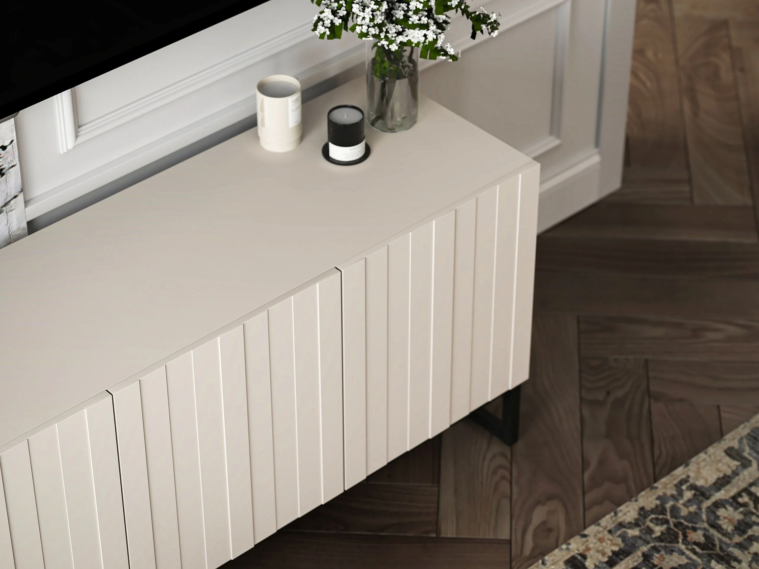 Meuble TV avec 8 portes - corps Cachemire mat, façades cannelées Cachemire mat - 300 cm, Cadre en métal noir