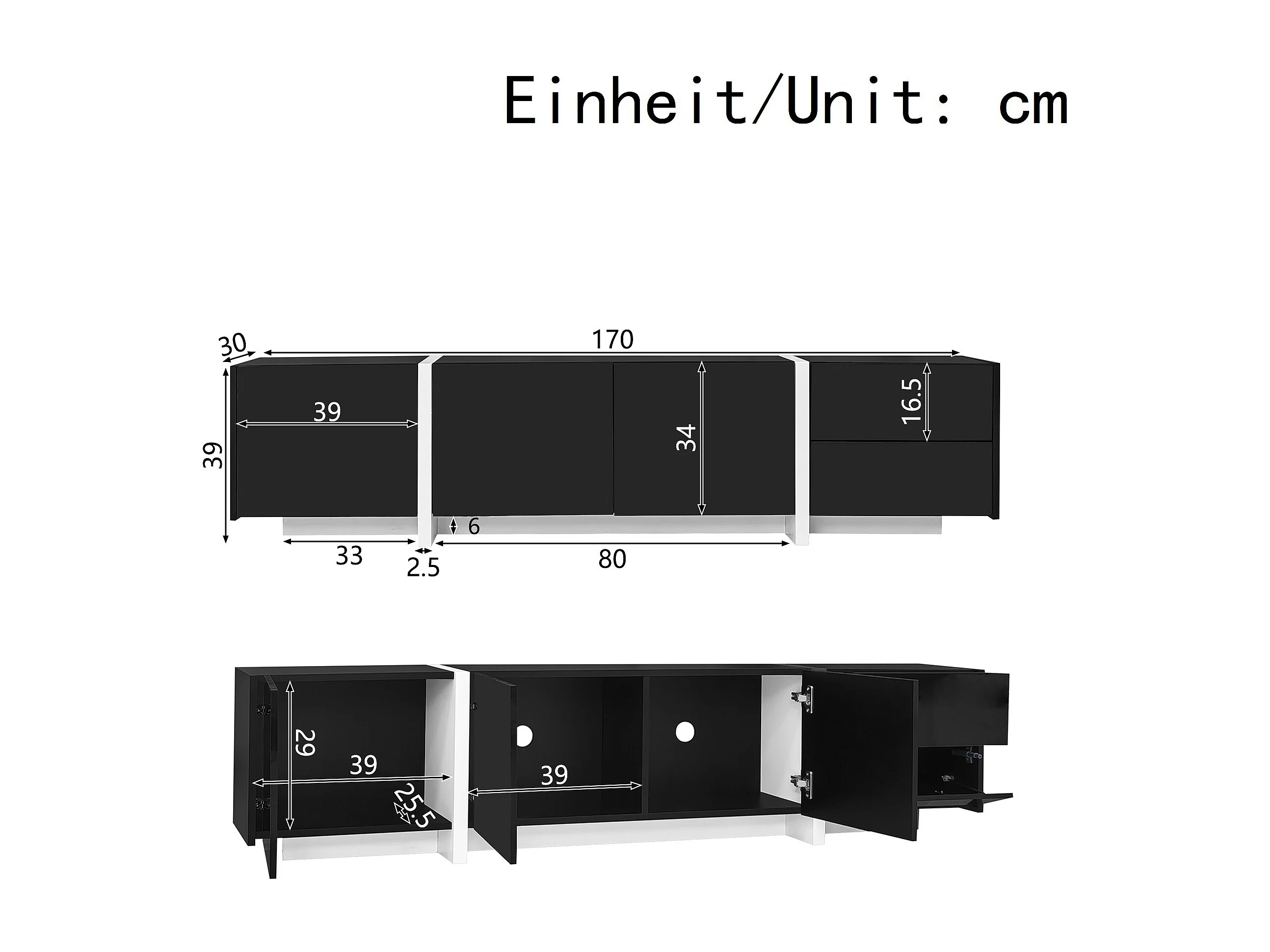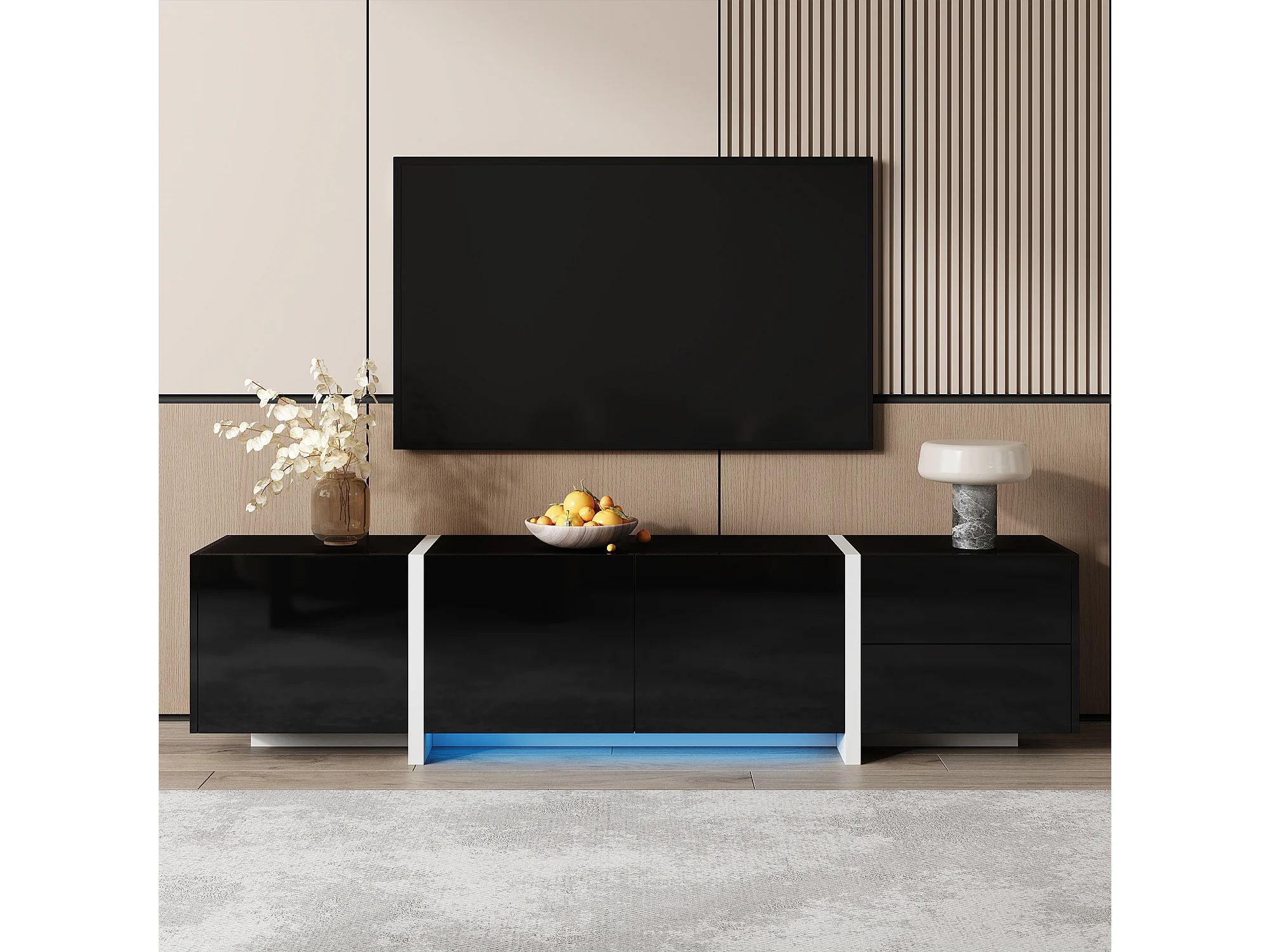 Meuble TV avec armoire basse, armoire noire laquée avec pieds blancs contrastants, portes et tiroirs élégants, avec barre lumineuse LED.