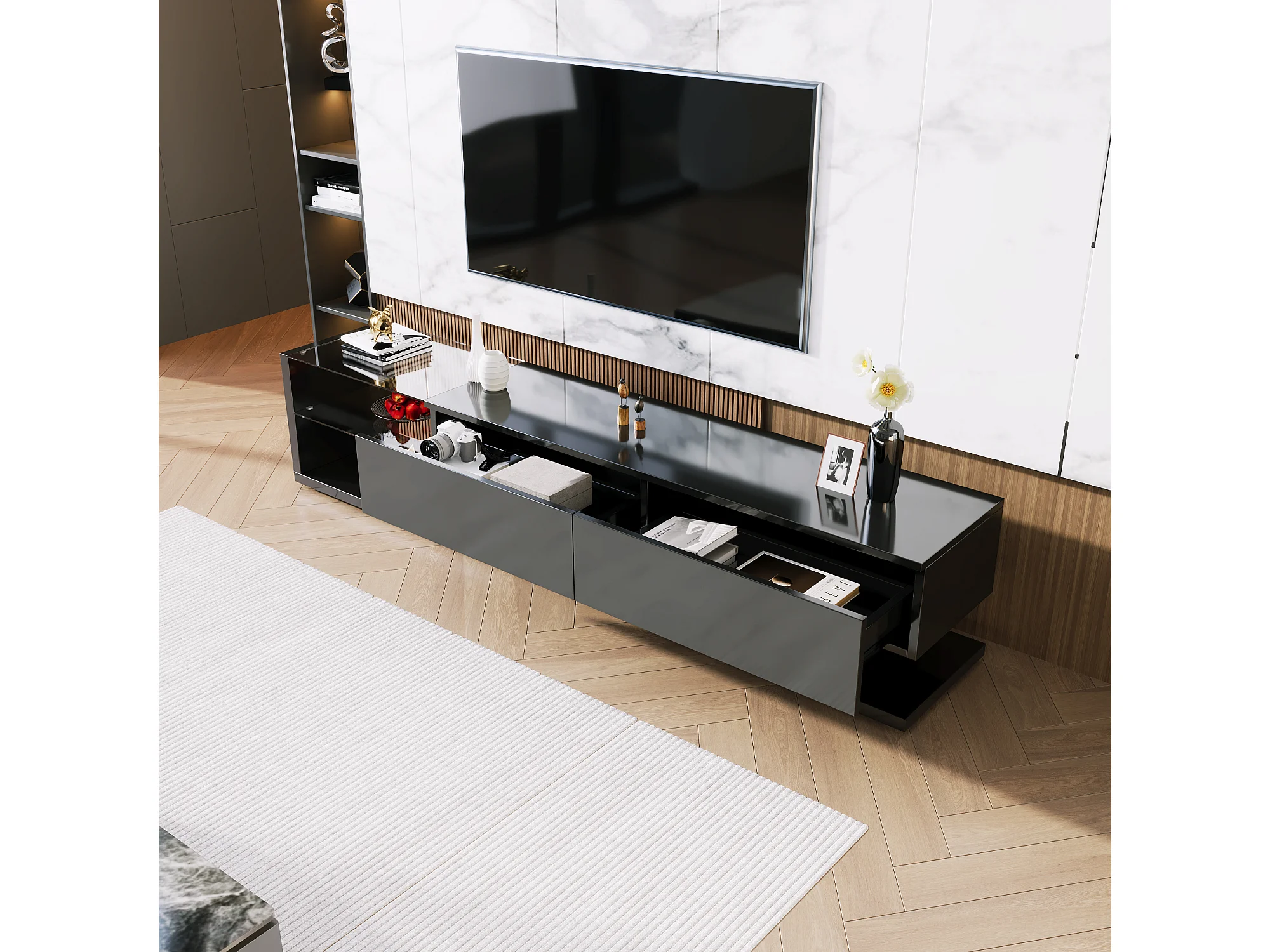 Meuble TV avec lumières LED,2 Tiroirs 2 Etagères de rengement,Moderne,Meuble de salon,170x36x38 cm,Buffet,Noir