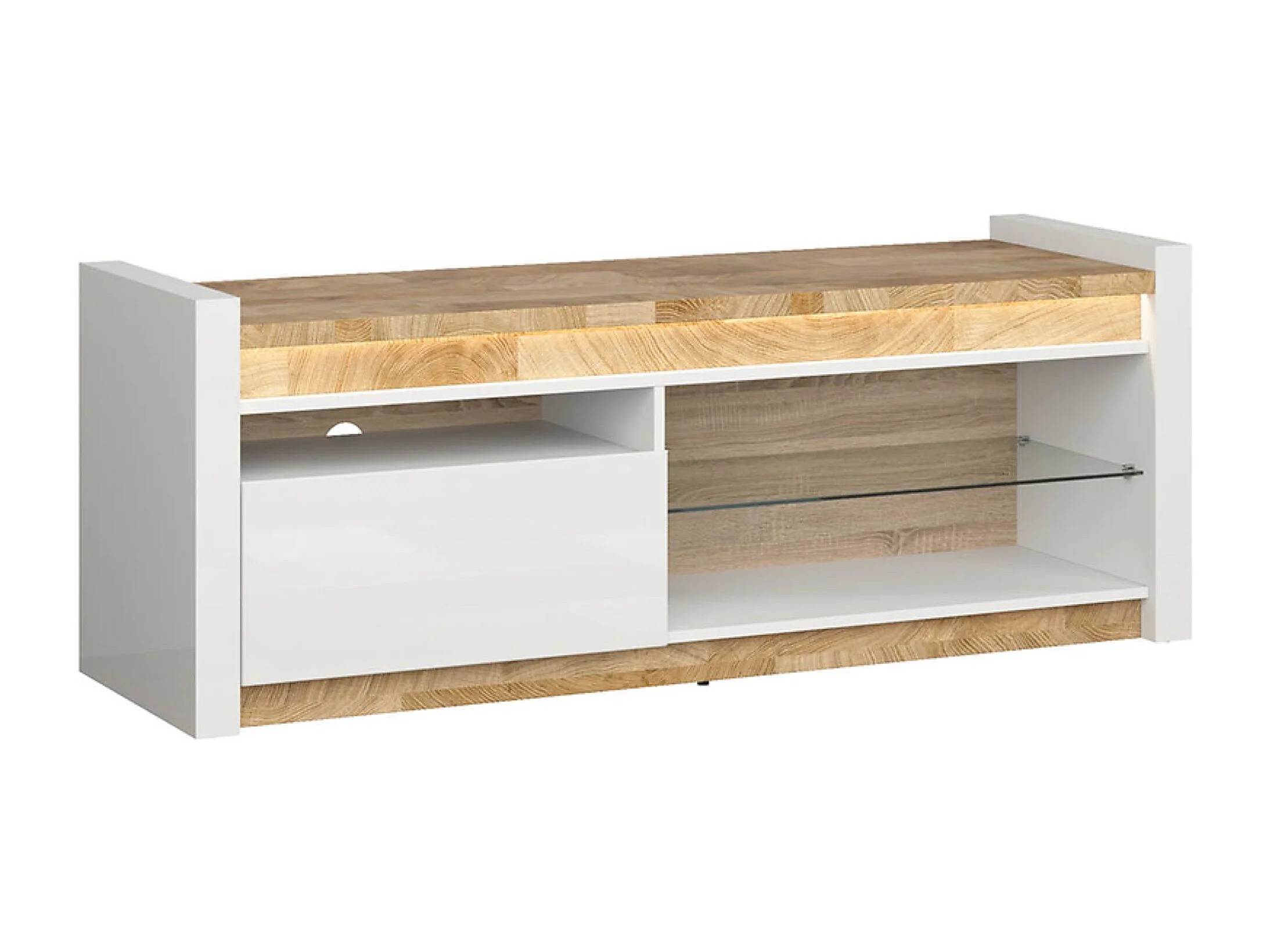 Meuble TV avec tiroir et étagère avec éclairage LED ,coloris Blanc brillant/Chêne clair - Longueur 147 x Profondeur 46 x Hauteur 55 cm