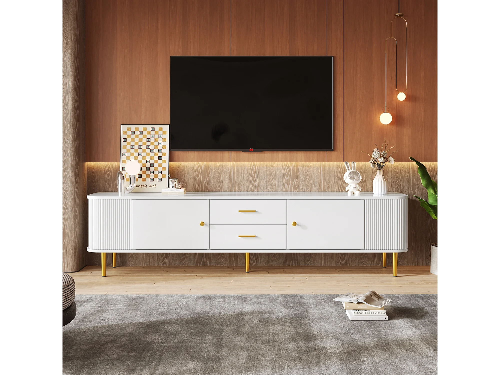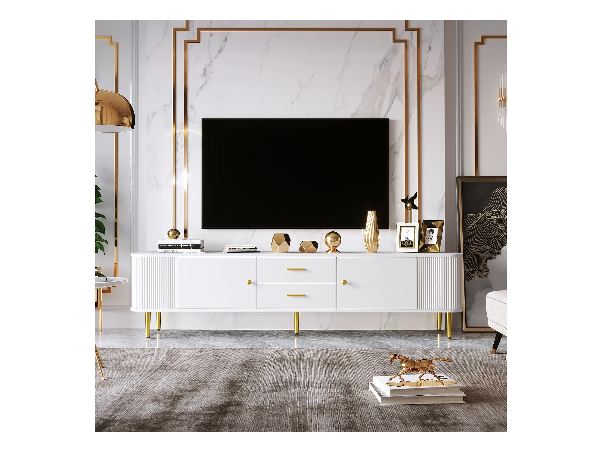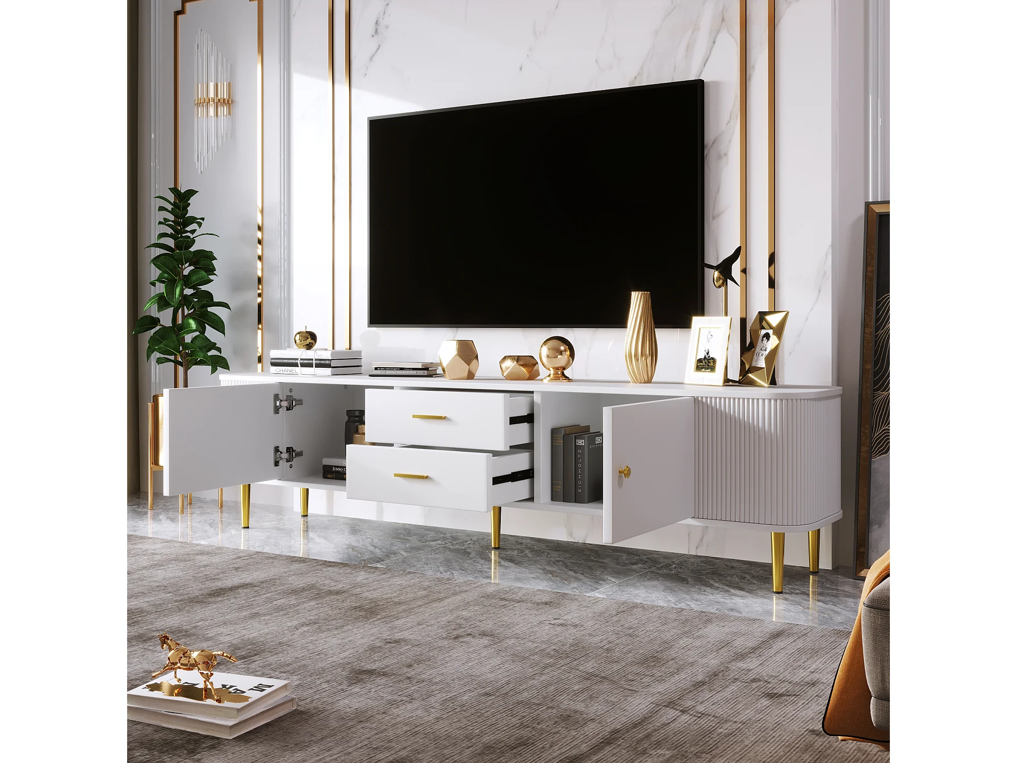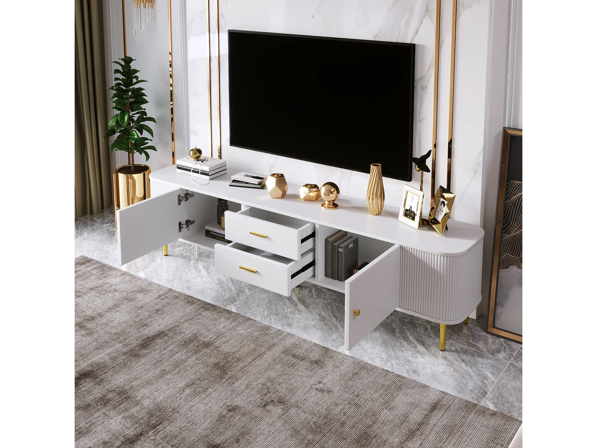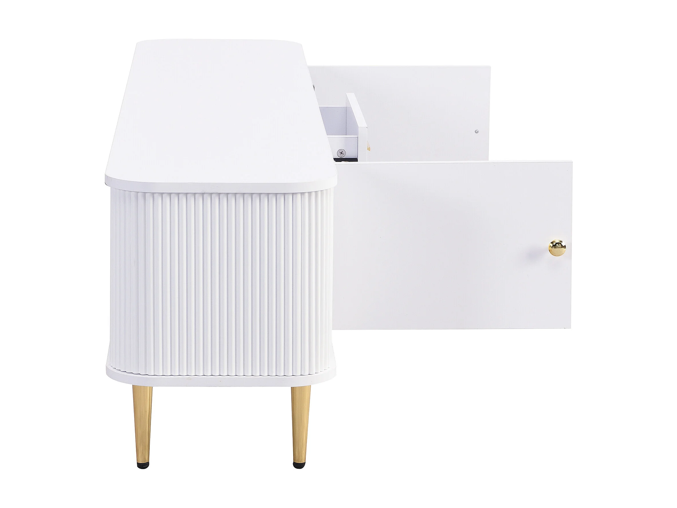 Meuble TV avec Tiroirs, Coins Arrondis, Meuble TV Salon avec Côtés Ondulés, Poignées et Pieds Dorés