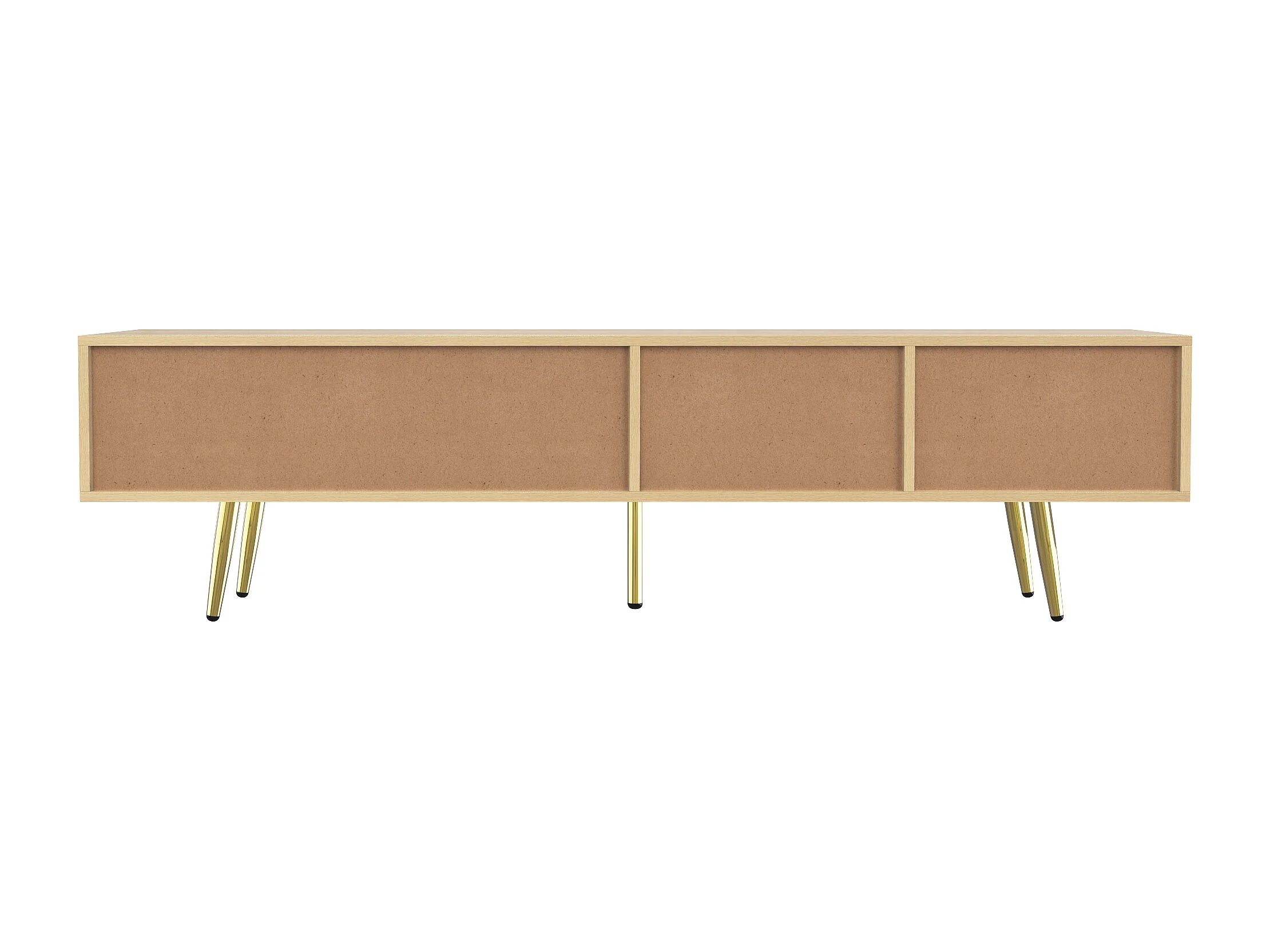 Meuble TV avec tiroirs et coins arrondis – Meuble TV pour salon avec côtés ondulés, poignées et pieds métalliques dorés, élégant aspect bois, rangement pratique