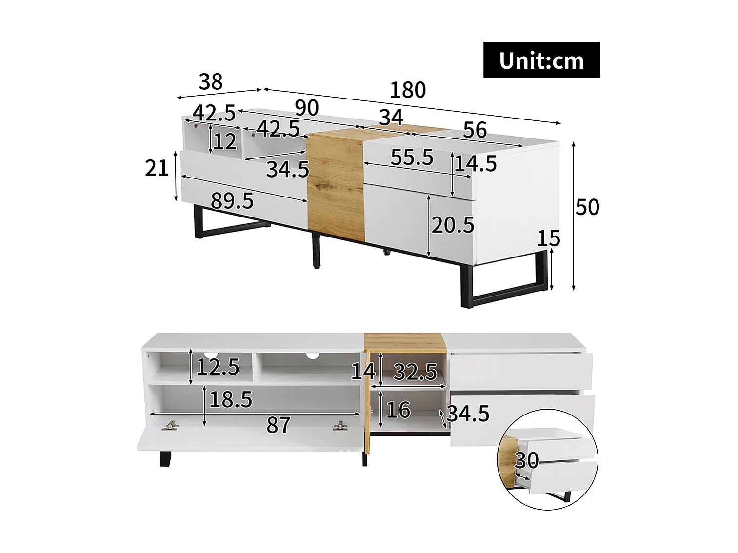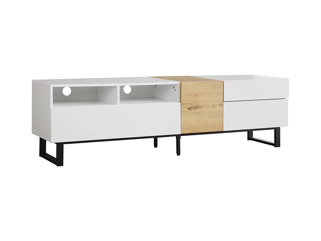 Meuble TV, avec tiroirs et plusieurs compartiments de rangement, 180 x 50 x 38 cm, blanc