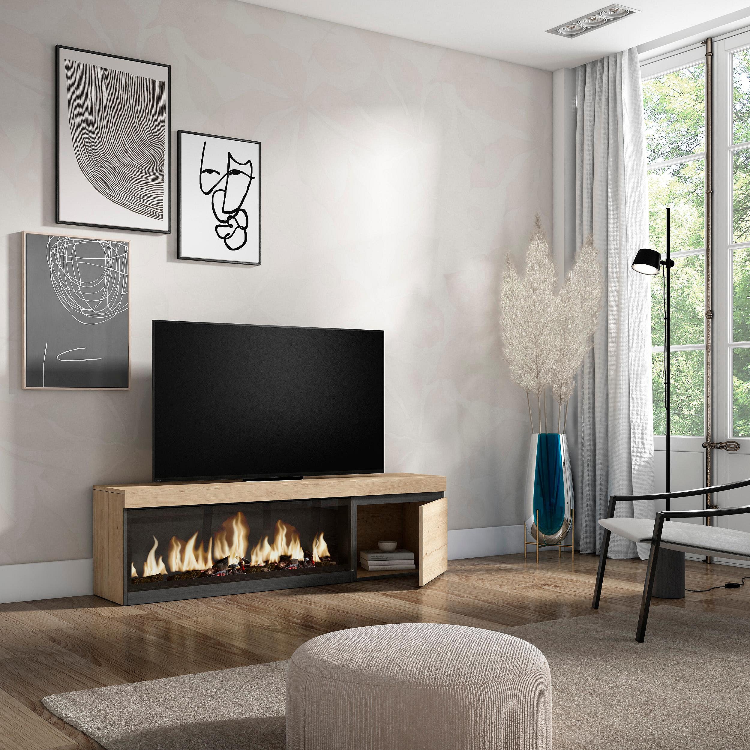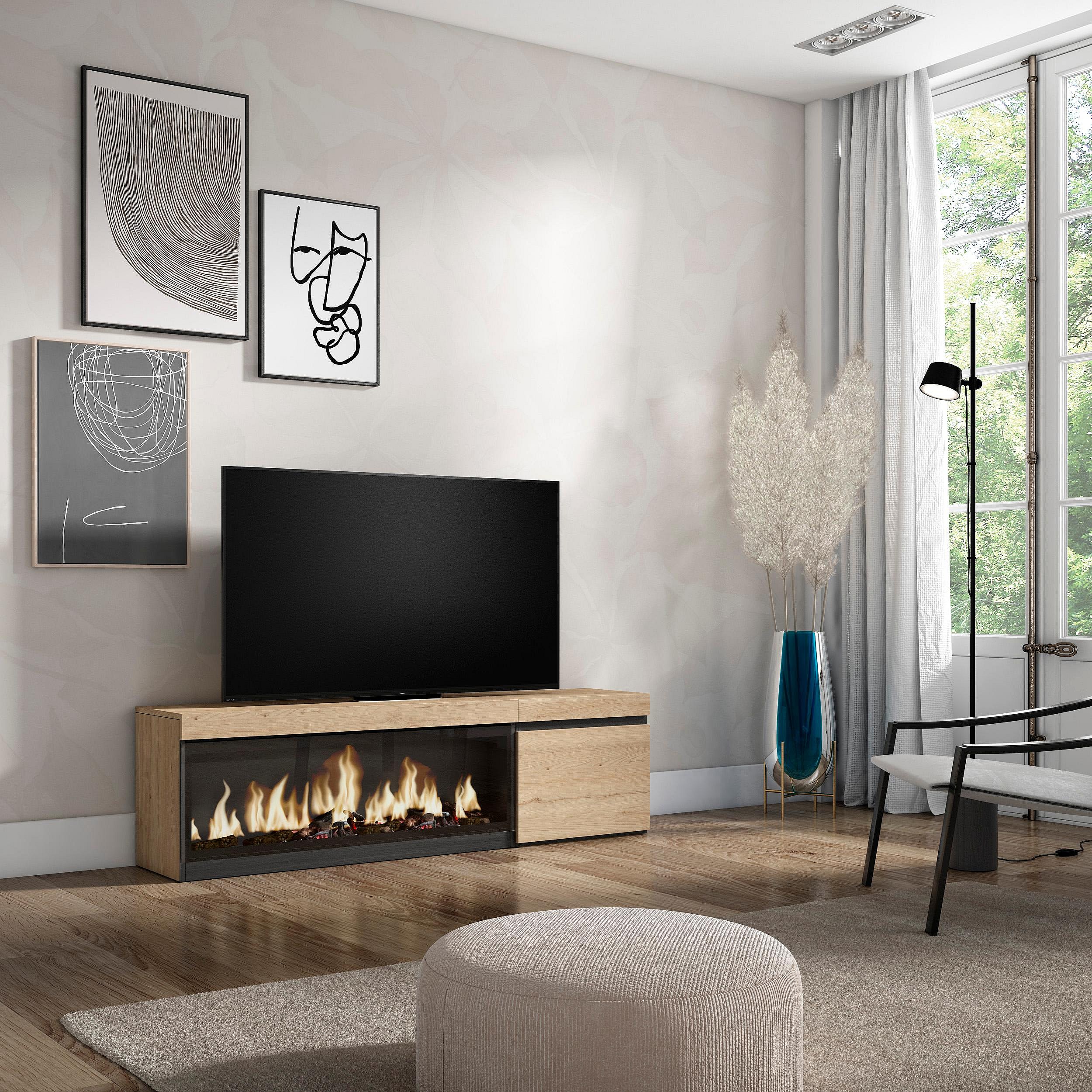 Meuble TV, Banc Télé, 158x35x45cm, Pour les TV jusqu'à 65", Cheminée électrique XXL, Chêne