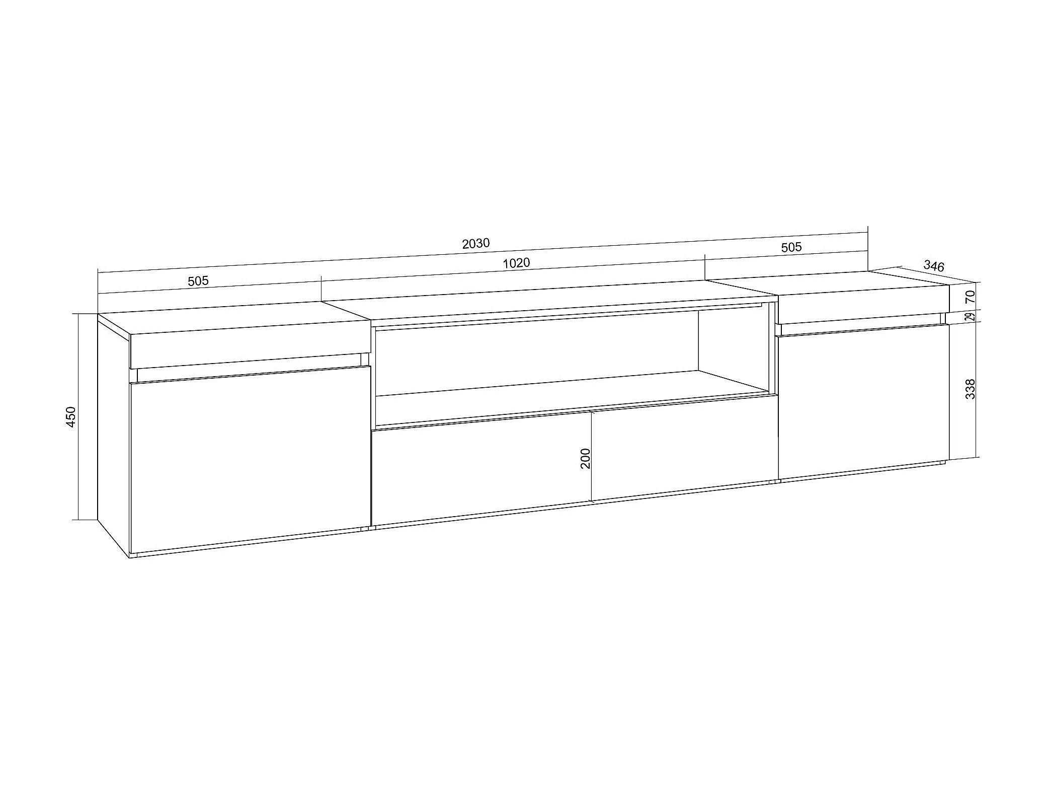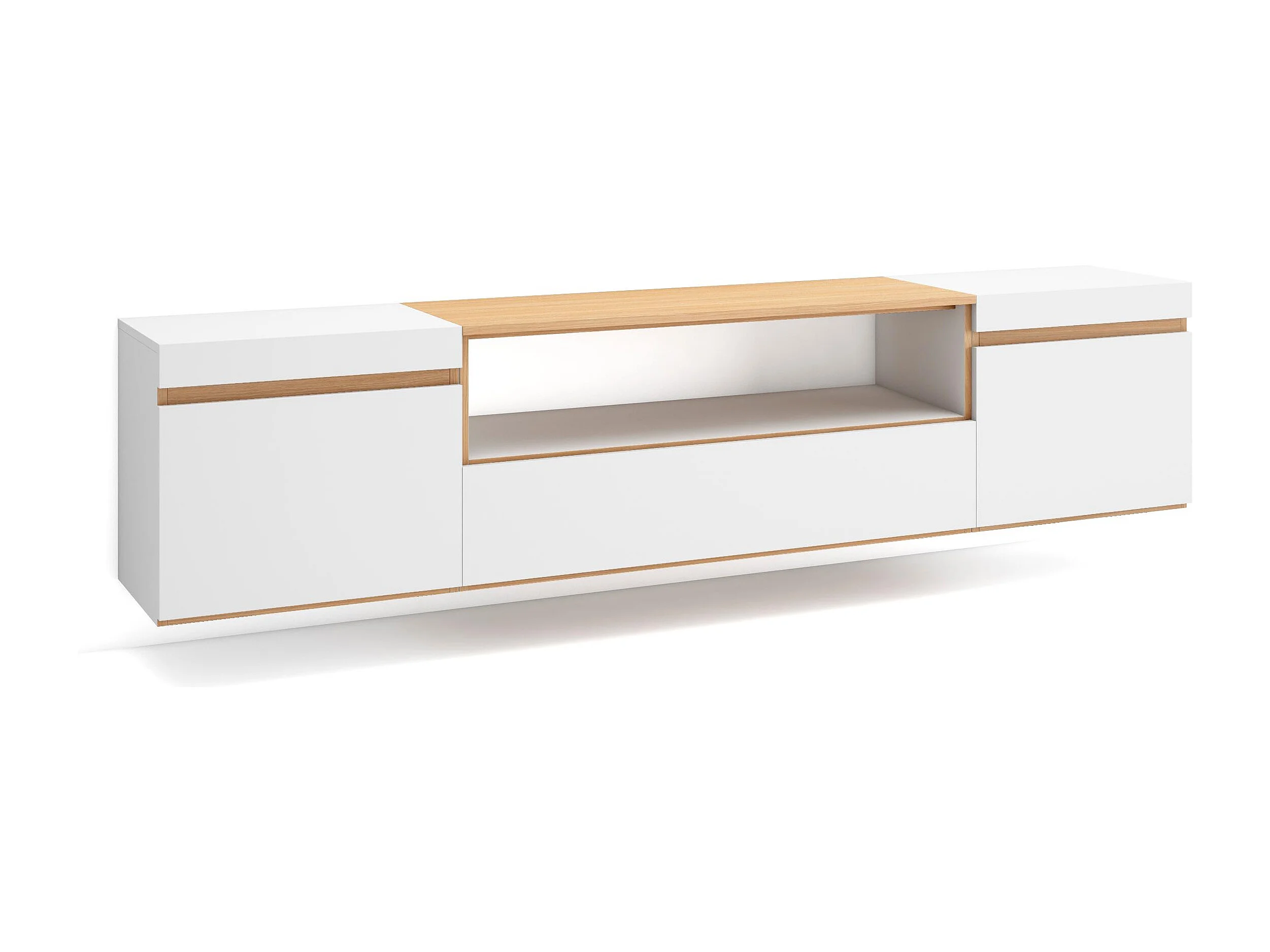 Meuble TV, Banc Télé, 200x35x45cm, Pour les TV jusqu'à 80", Suspendu, Mural, Blanc et Chêne Soft