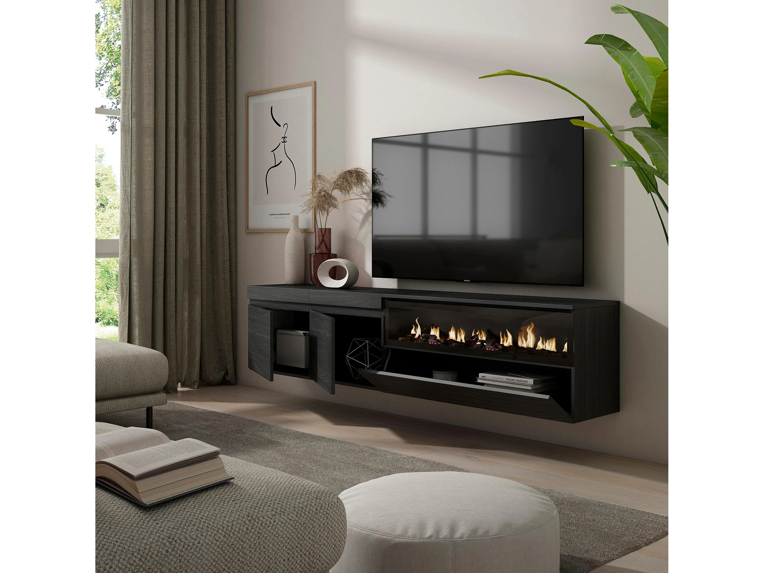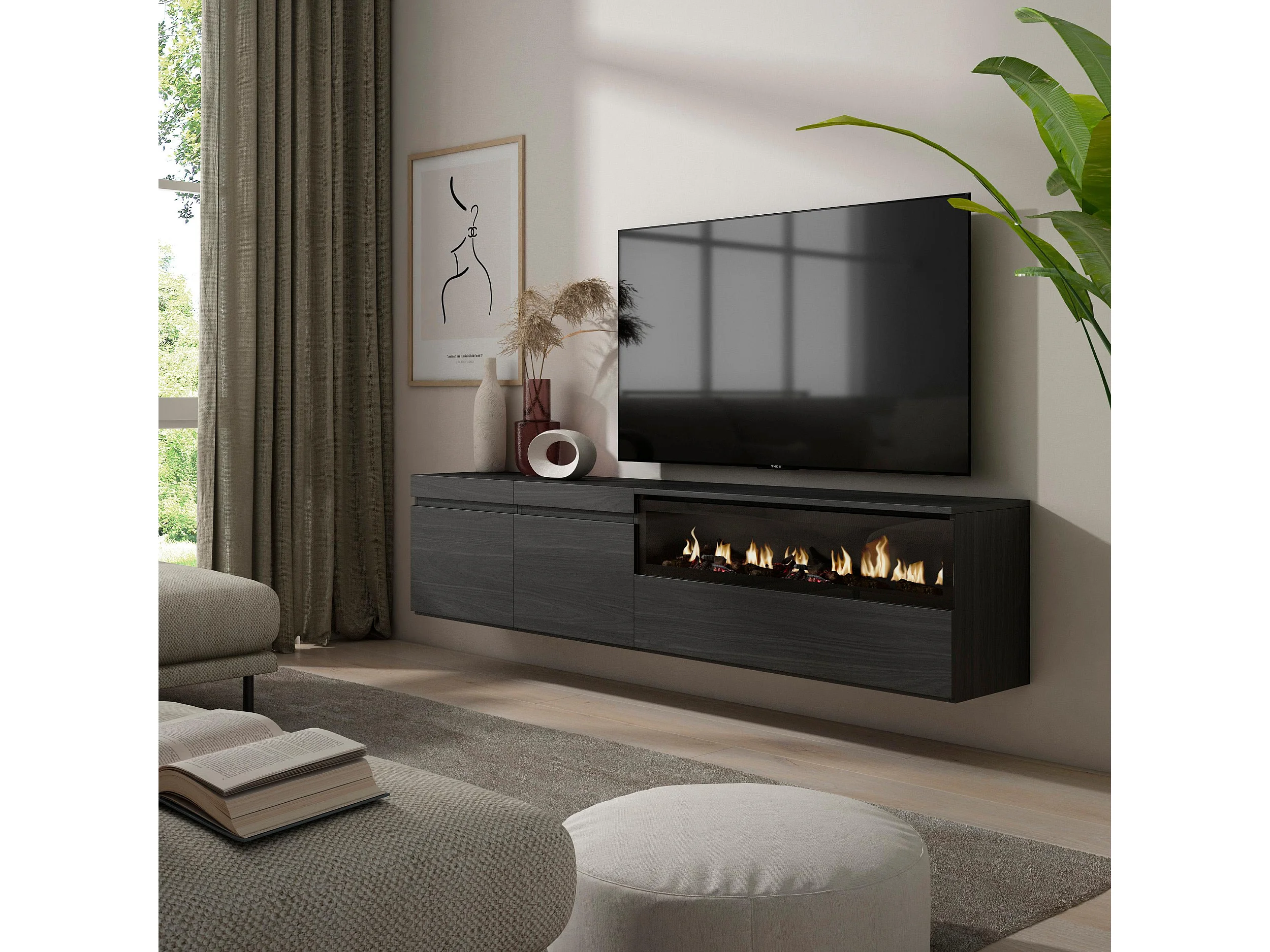 Meuble TV, Banc Télé, 200x35x45cm, Pour les TV jusqu'à 80", Cheminée électrique, Suspendu, Mural, Noir