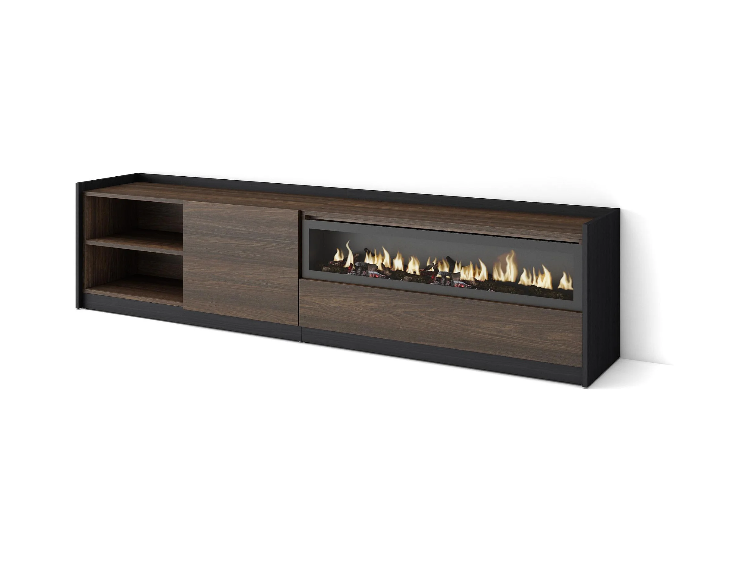 Meuble TV | Banc Télé, 207x50x37 cm, Pour les TV jusqu'à 80", Cheminée électrique, Chêne foncé et Noir