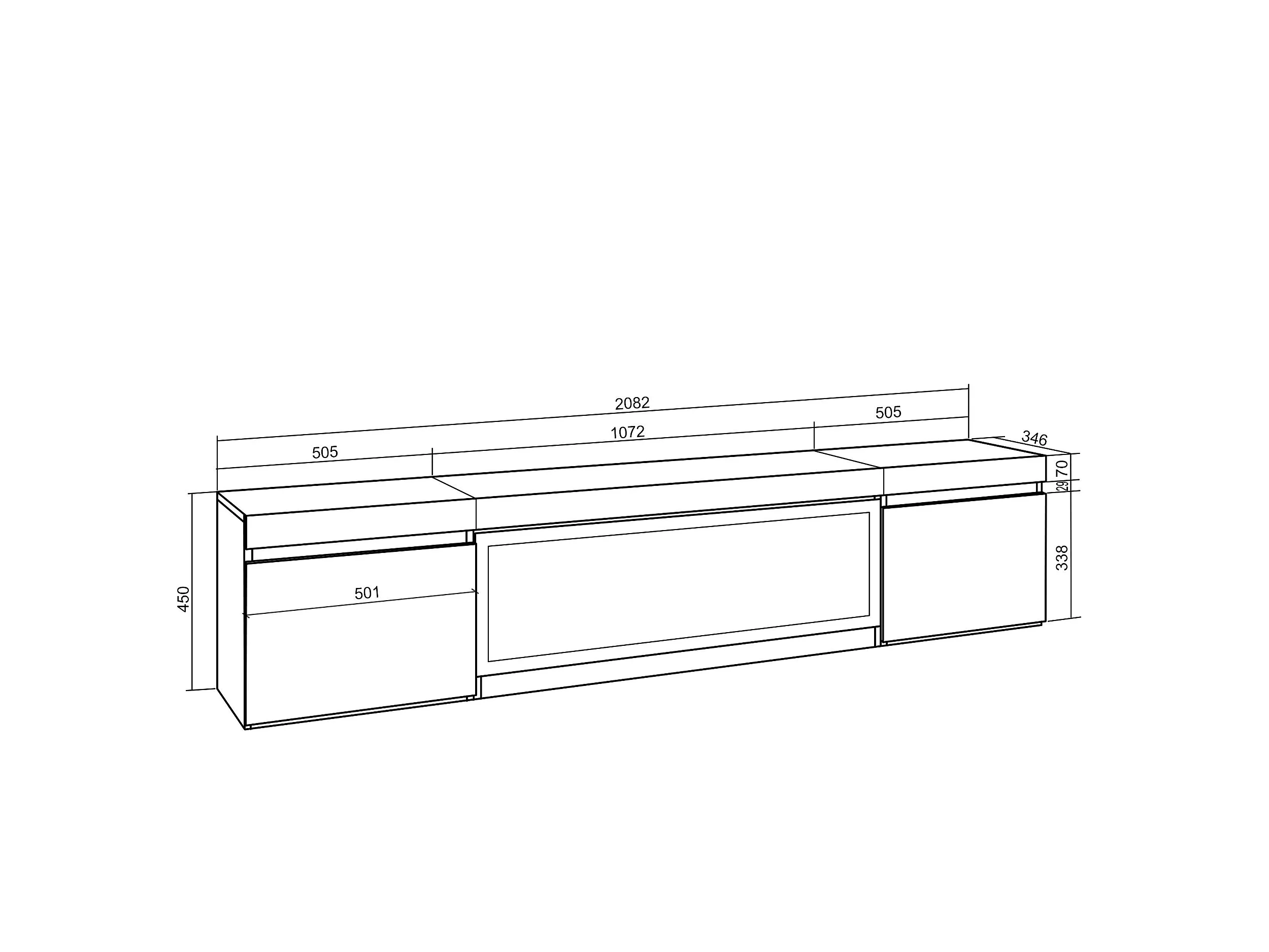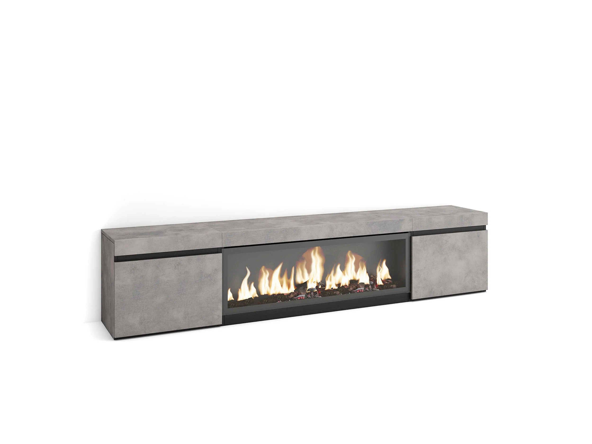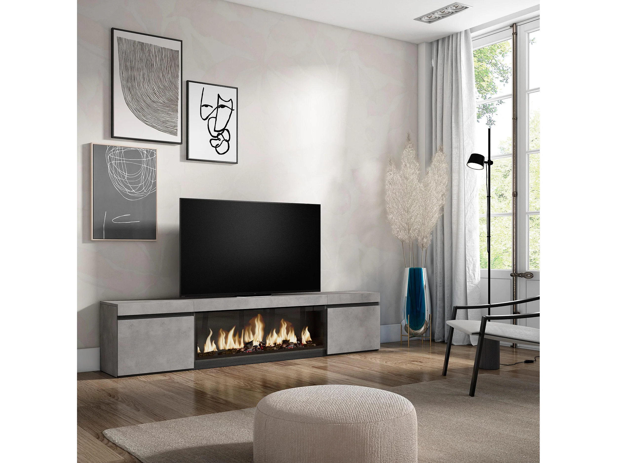 Meuble TV, Banc Télé, 208x35x45cm, Pour les TV jusqu'à 80", Cheminée électrique XXL, Ciment