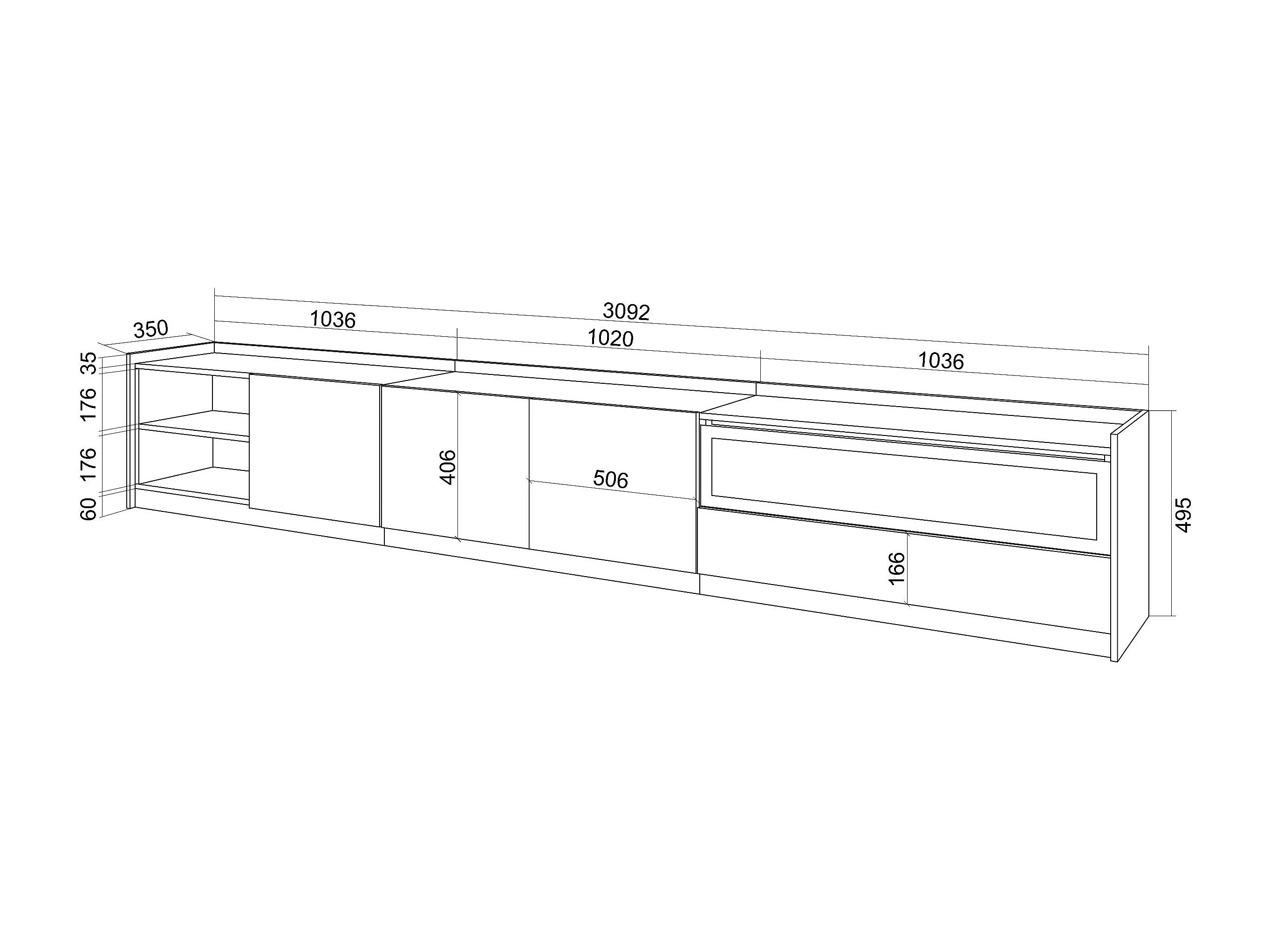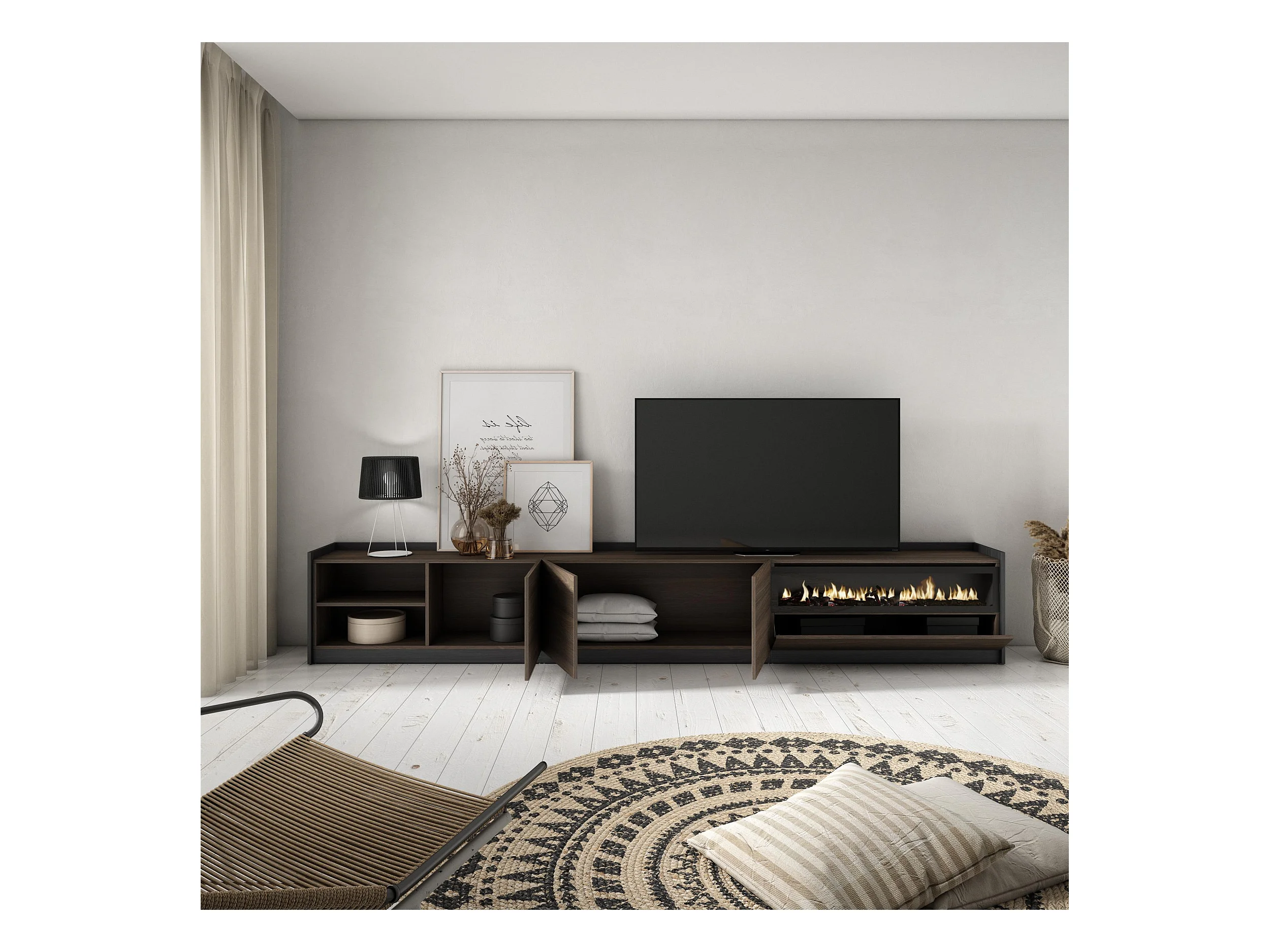 Meuble TV | Banc Télé, 310x50x37 cm, Pour les TV jusqu'à 80", Cheminée électrique, Chêne foncé et Noir