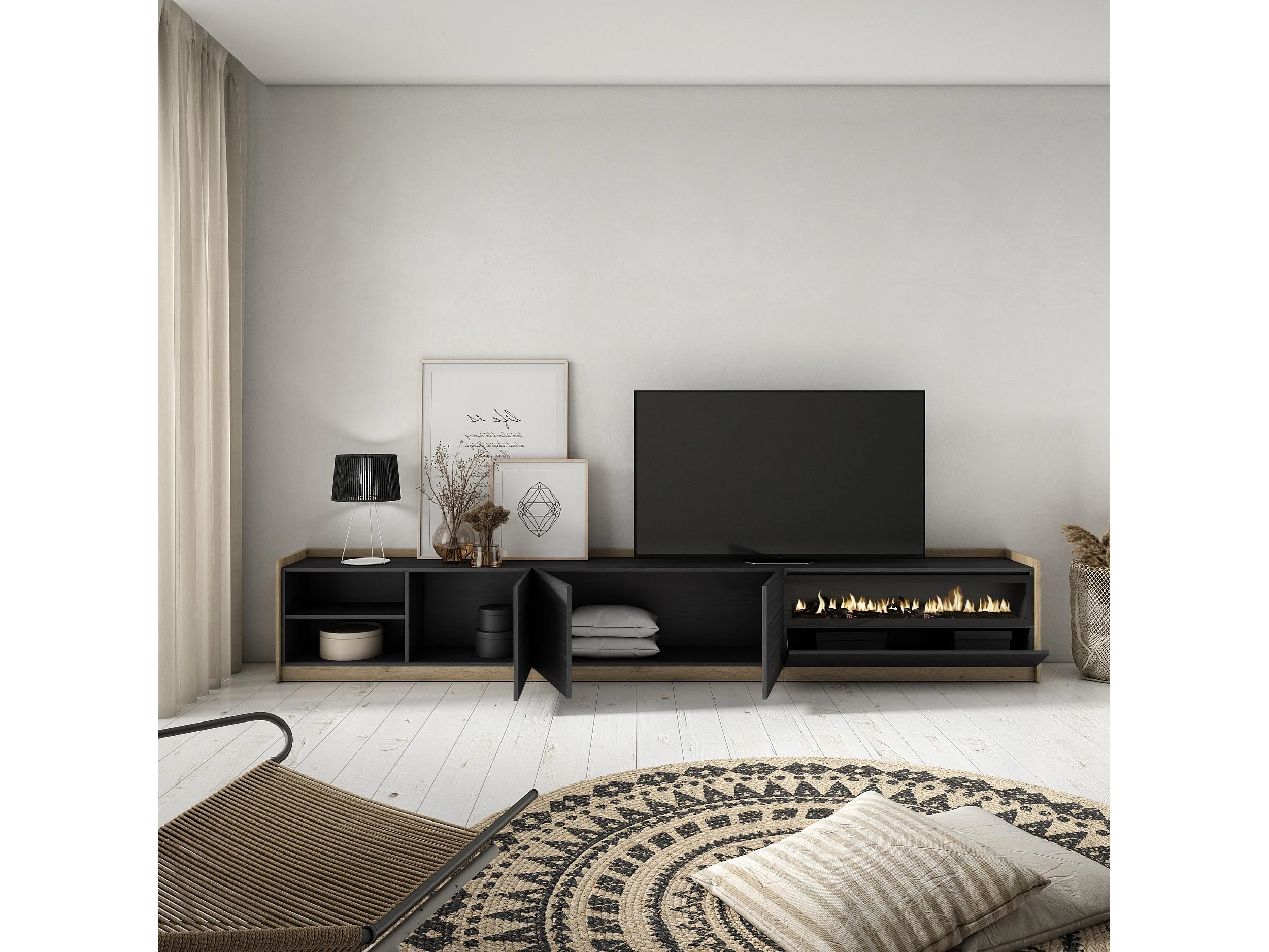Meuble TV | Banc Télé, 310x50x37 cm, Pour les TV jusqu'à 80", Cheminée électrique, Noir et chêne