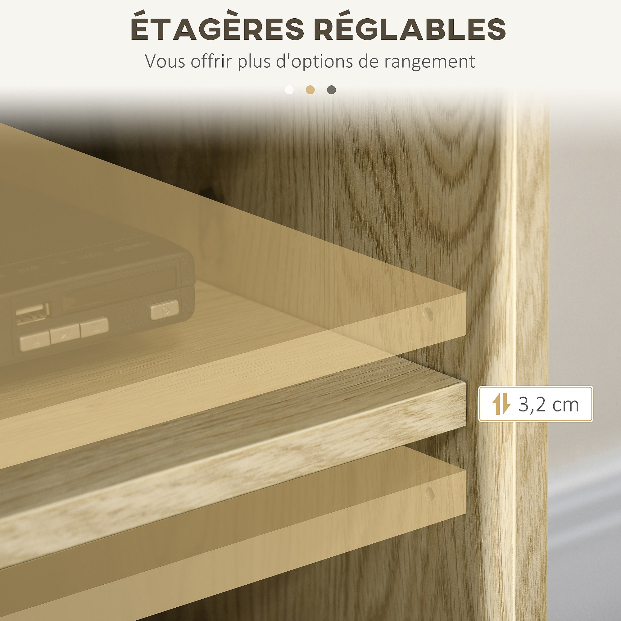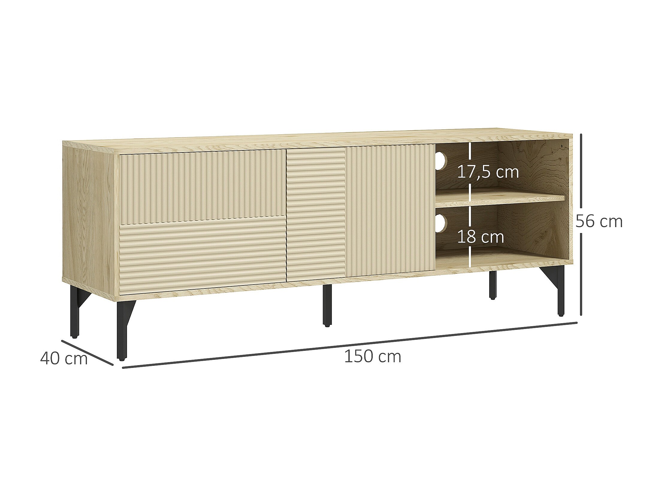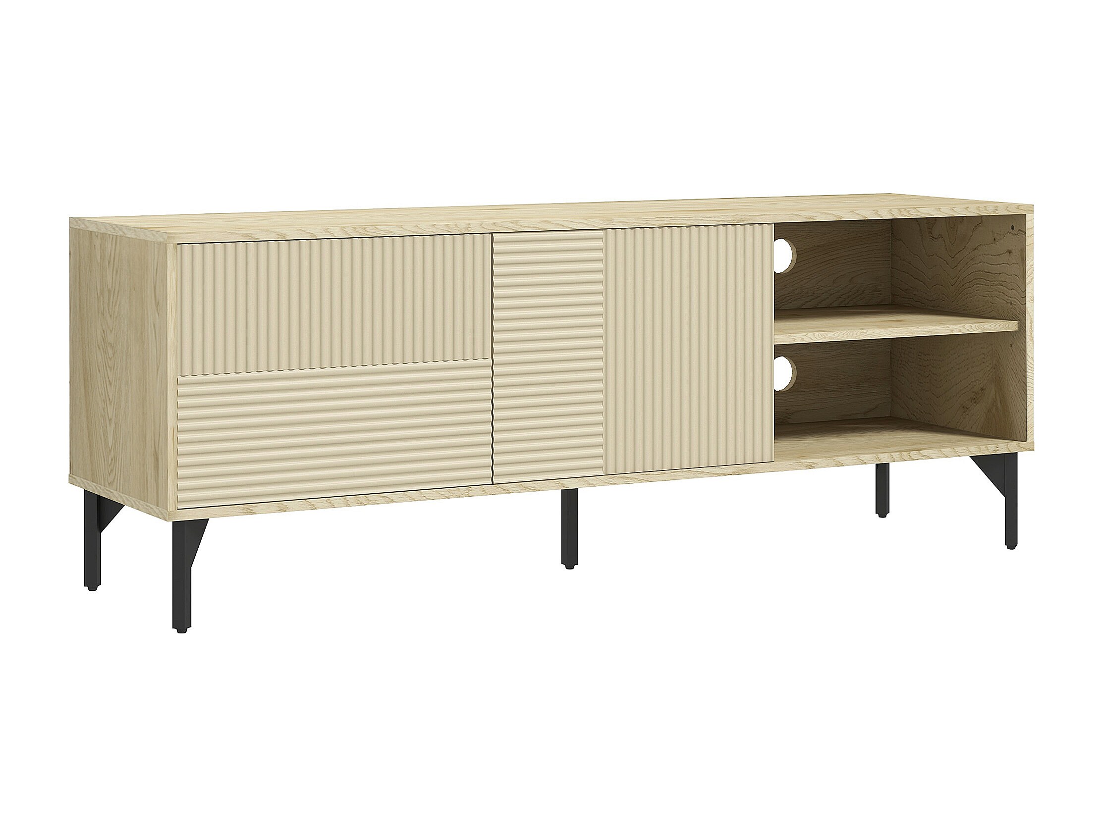 Meuble TV banc TV design Urban Craft - 2 portes, 2 étagères, 2 niches - piètement acier noir - aspect chêne clair