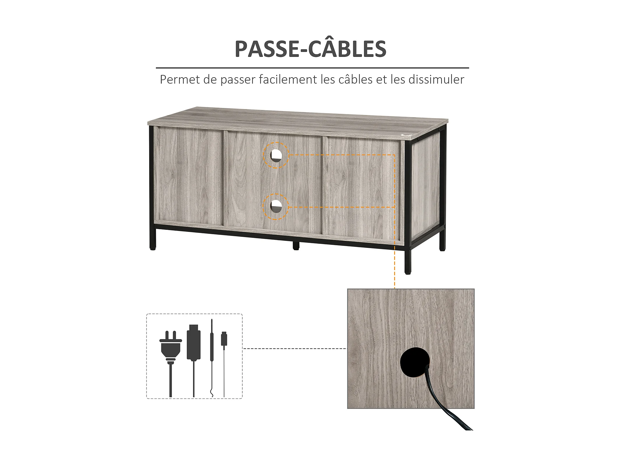 Meuble TV banc TV style contemporain - 2 niches, 2 portes, passe-câbles, grand plateau - dim. 110L x 40l x 50H cm - structure acier noir aspect bois gris