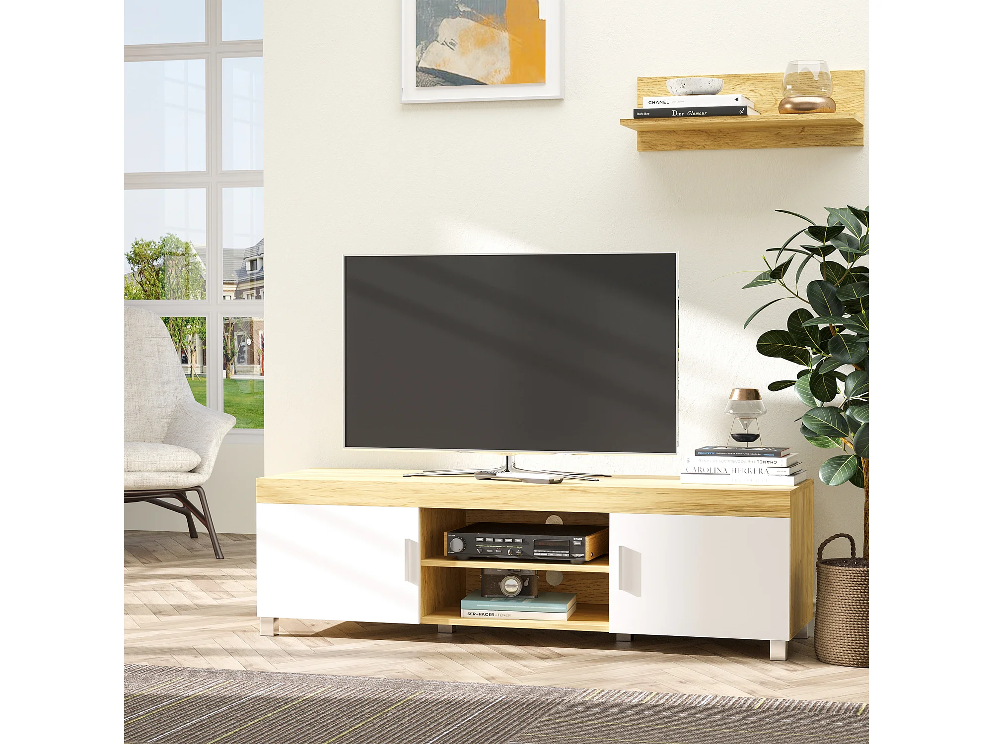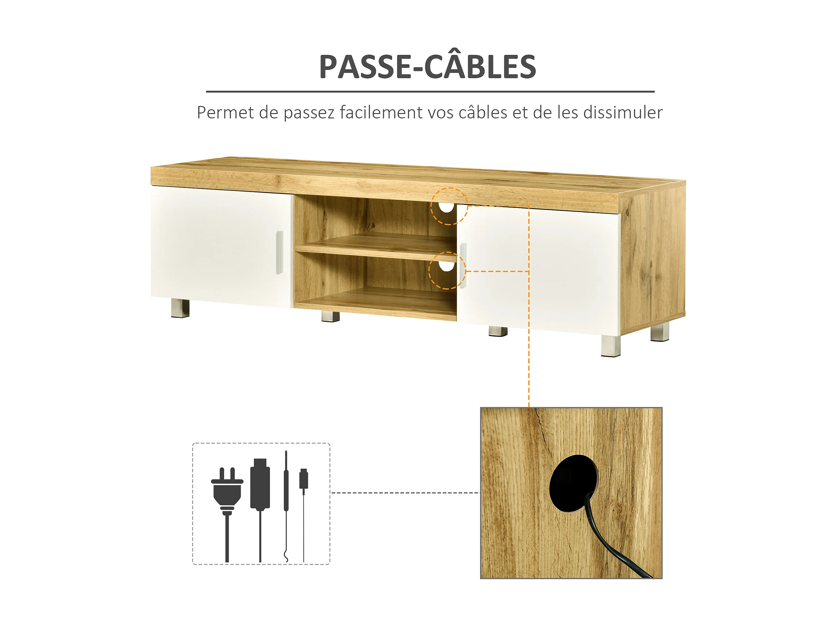 Meuble TV banc TV sur pieds 2 placards 2 niches 2 passe-fils MDF aspect chêne clair blanc