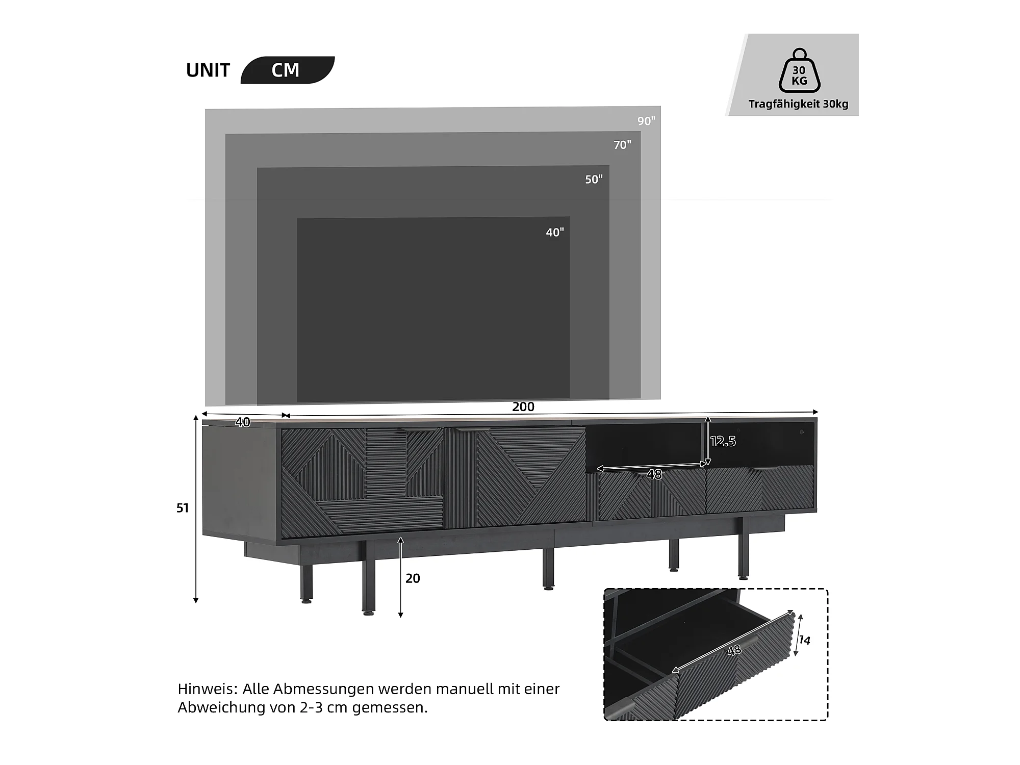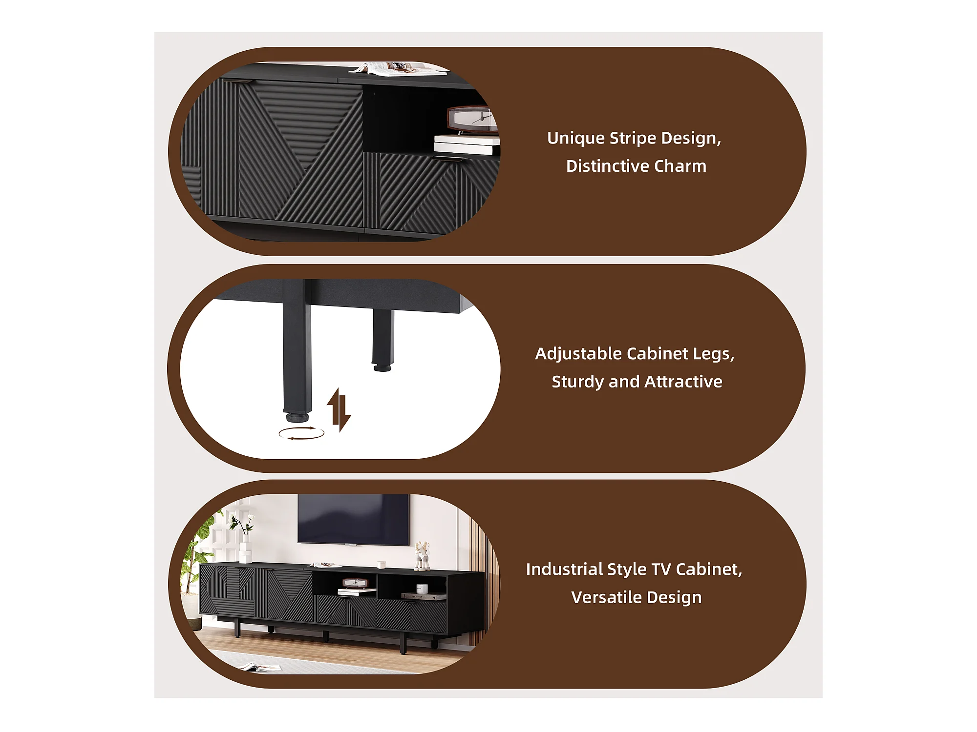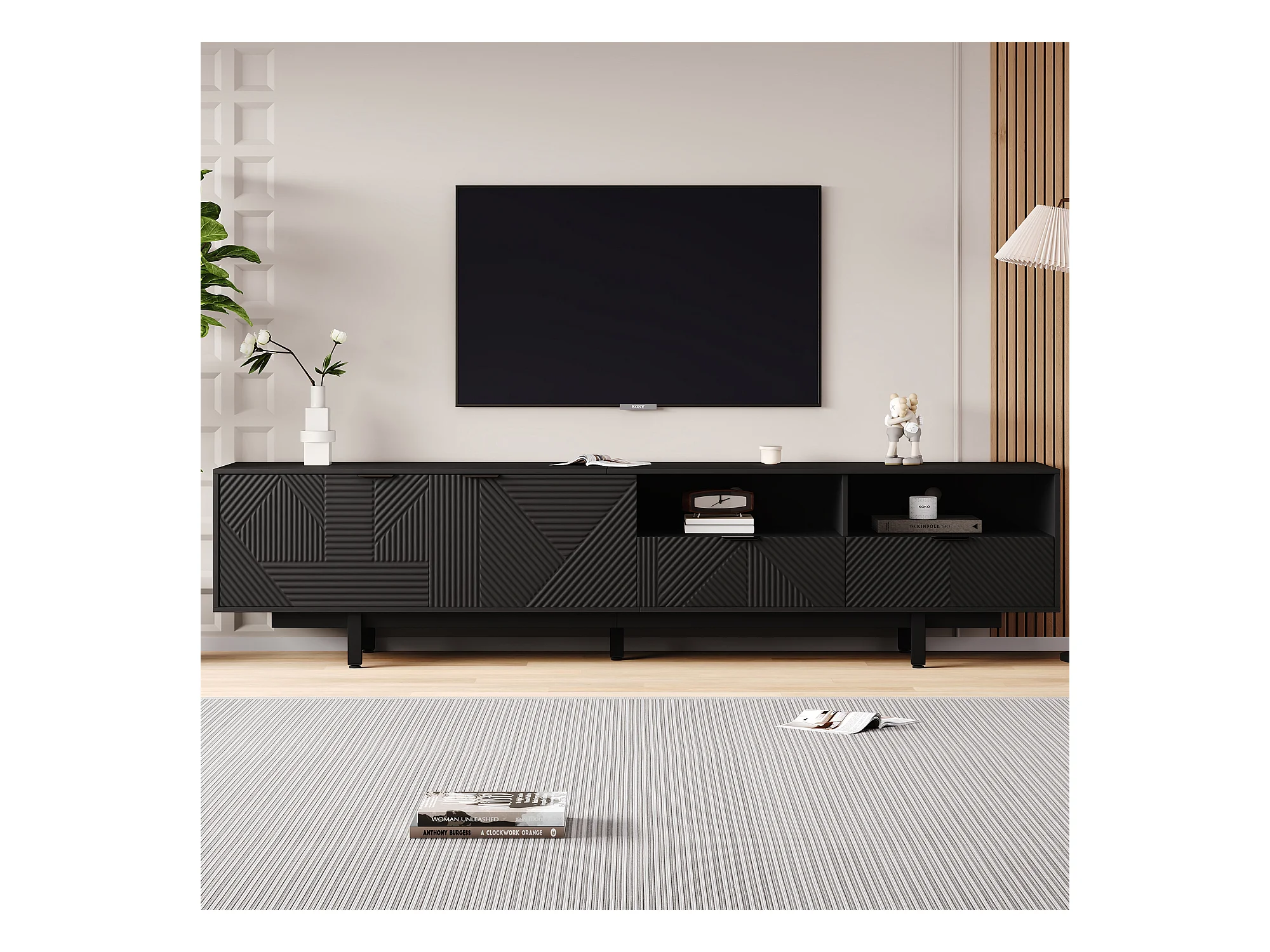 Meuble TV bas avec 2 portes et 2 tiroirs, 2 compartiments et pieds en métal, 200 x 40 x 51 cm, noir