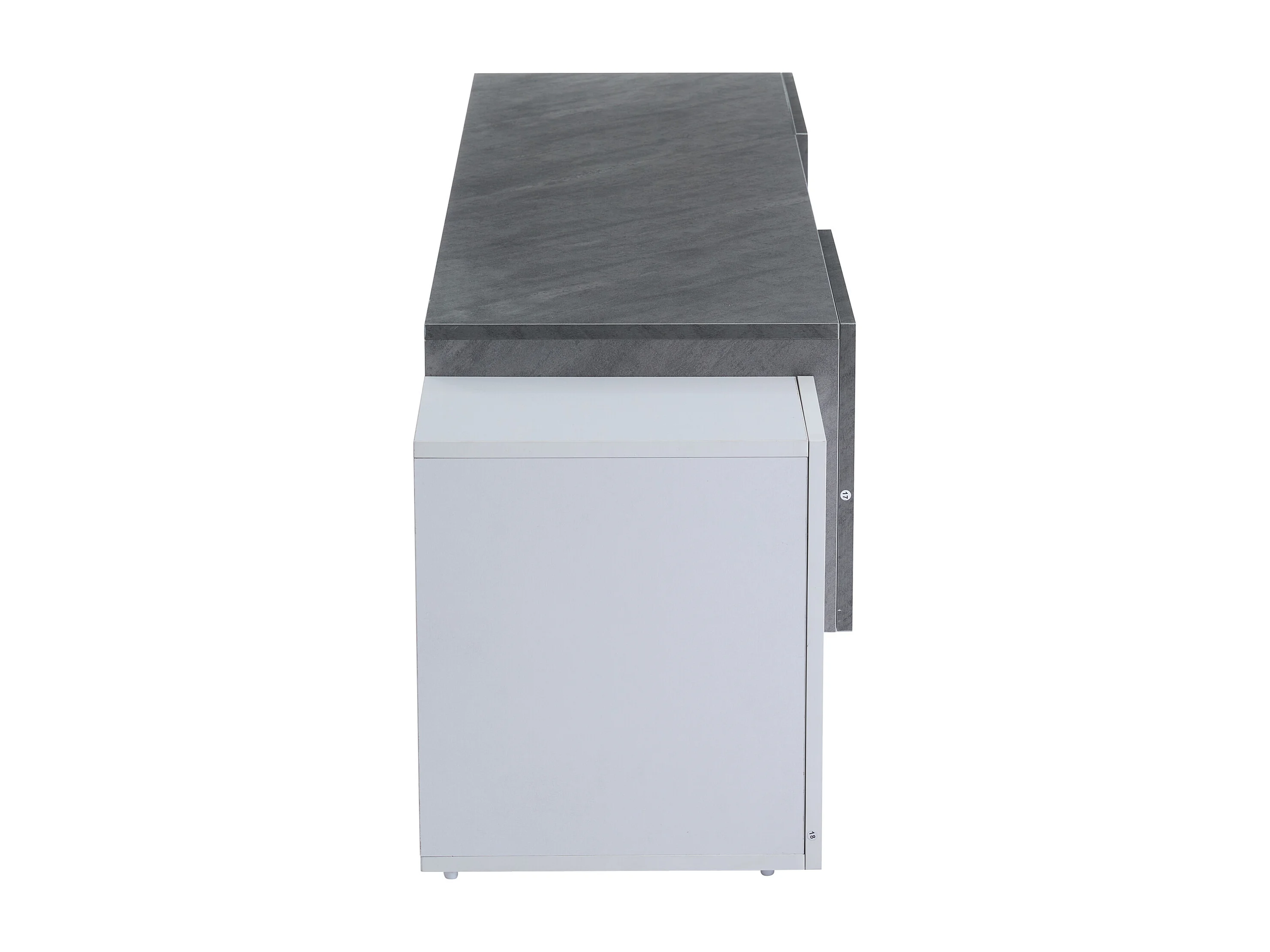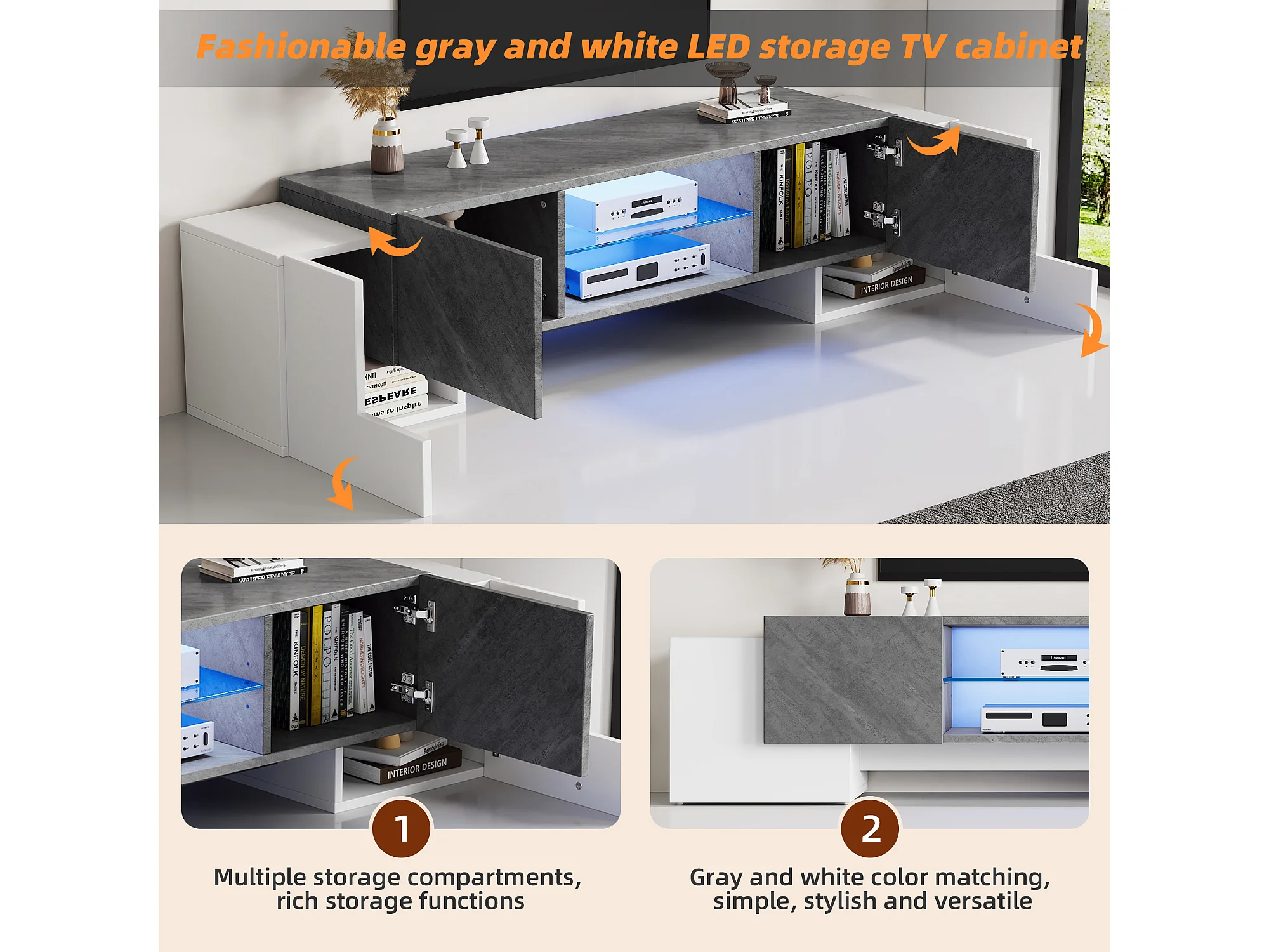 Meuble TV bas avec éclairage LED - Support TV avec 4 portes, étagères en verre - Blanc et gris