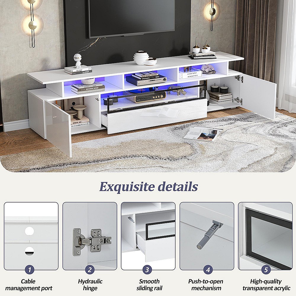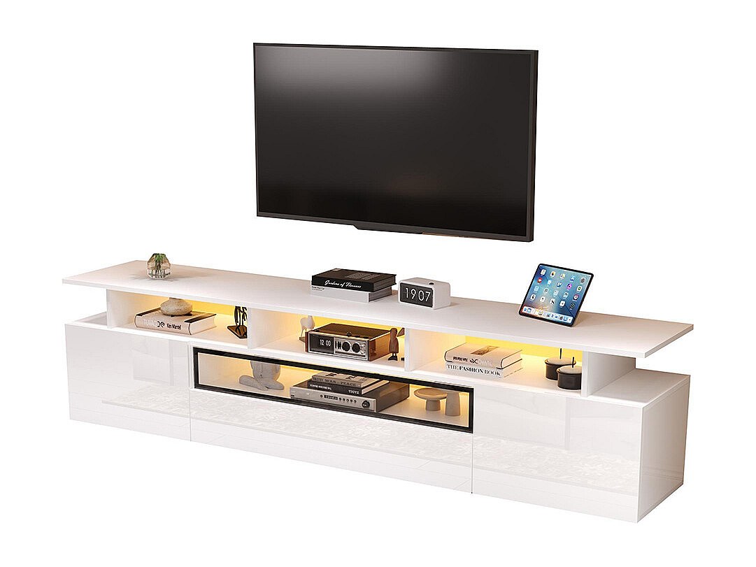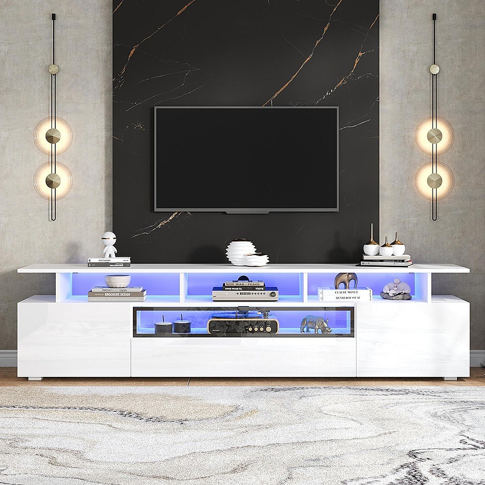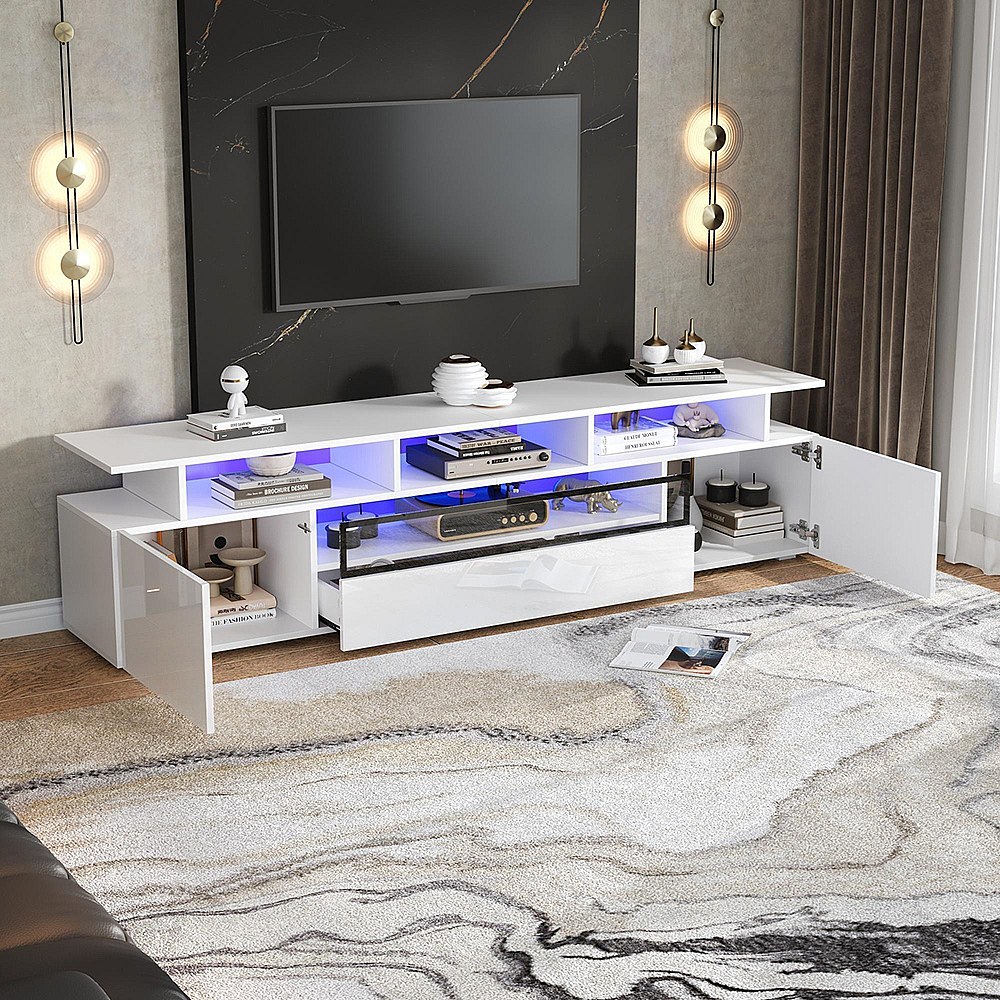 Meuble TV bas brillant 2 placards 1 tiroir LED 10 étagères pieds TV 75 pouces