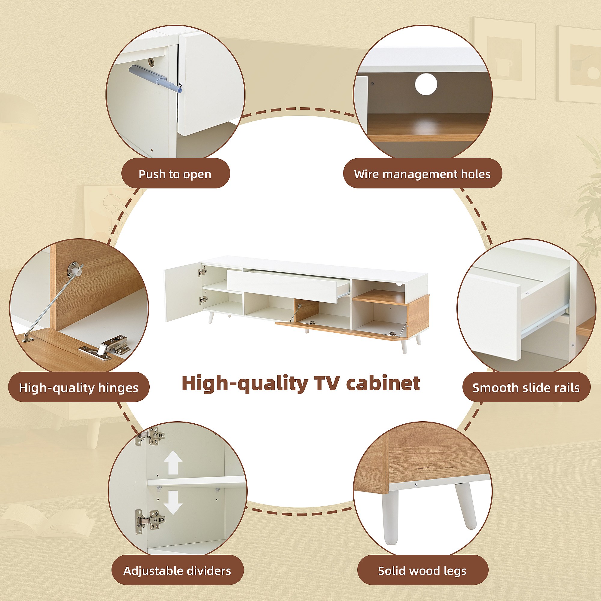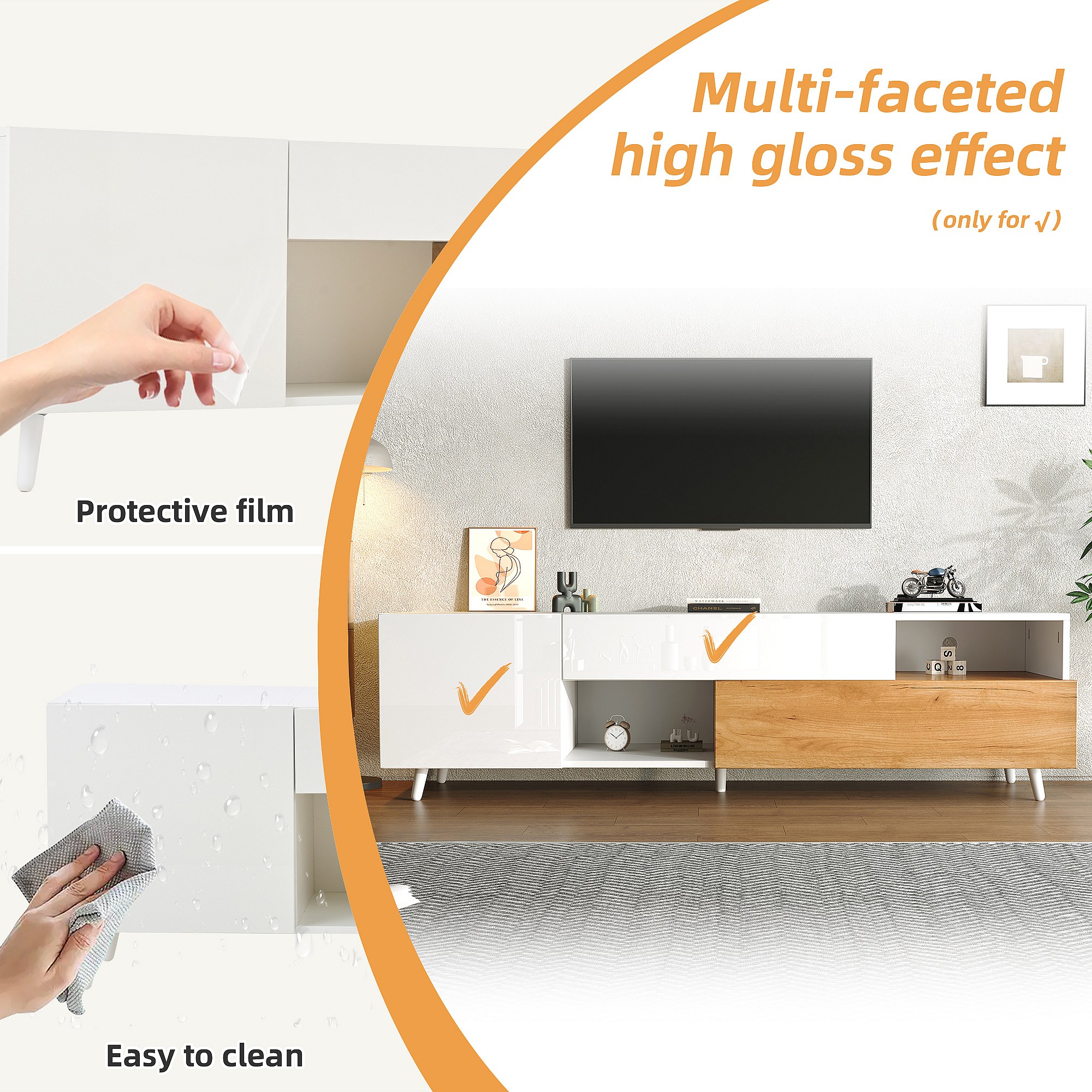 Meuble TV bas brillant avec 2 portes, 1 tiroir, pour salle à manger, salon, 180 cm, blanc et bois