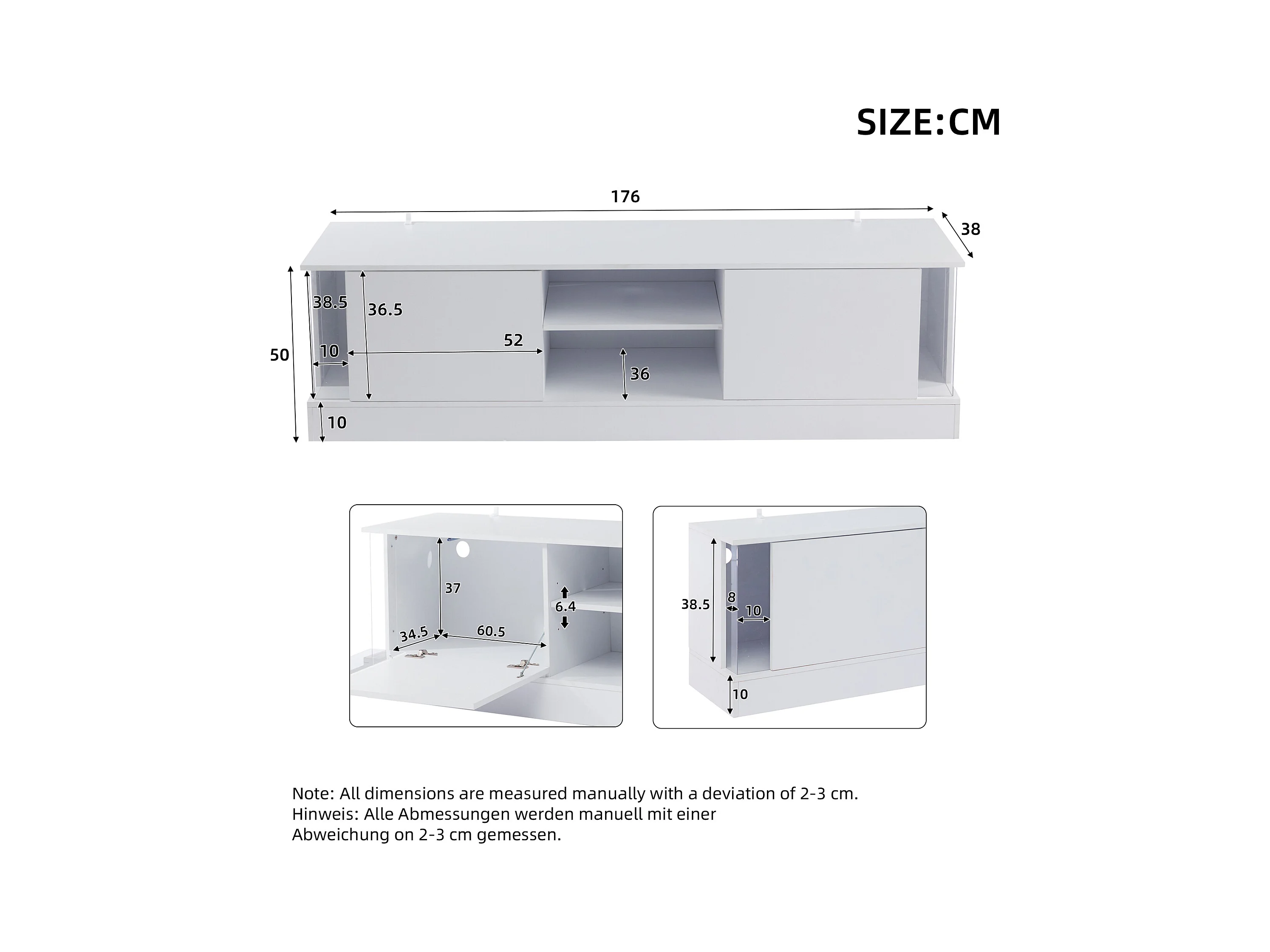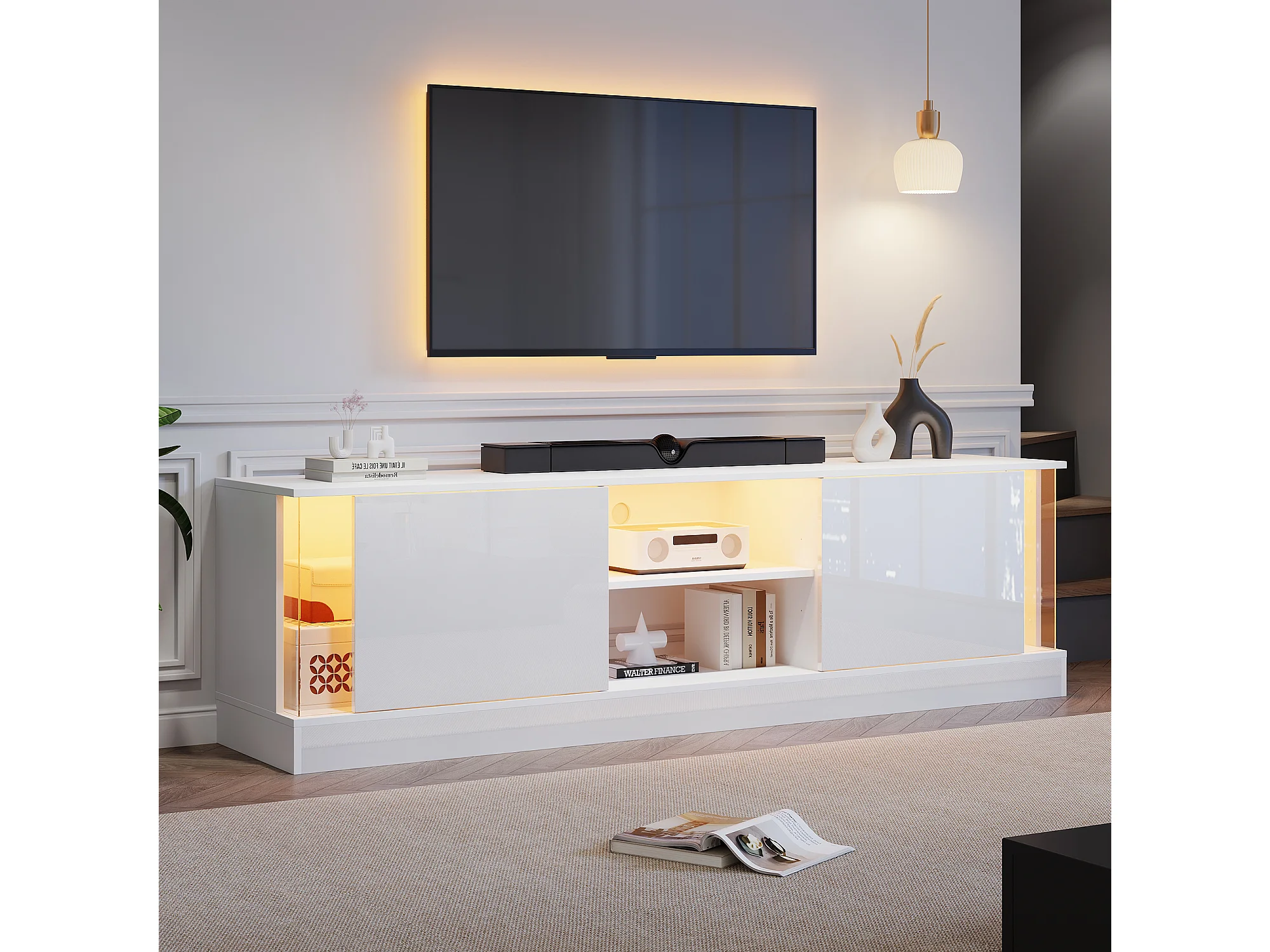 Meuble TV bas brillant de 160 cm avec fonction de rangement LED et 2 portes d'armoire - Blanc
