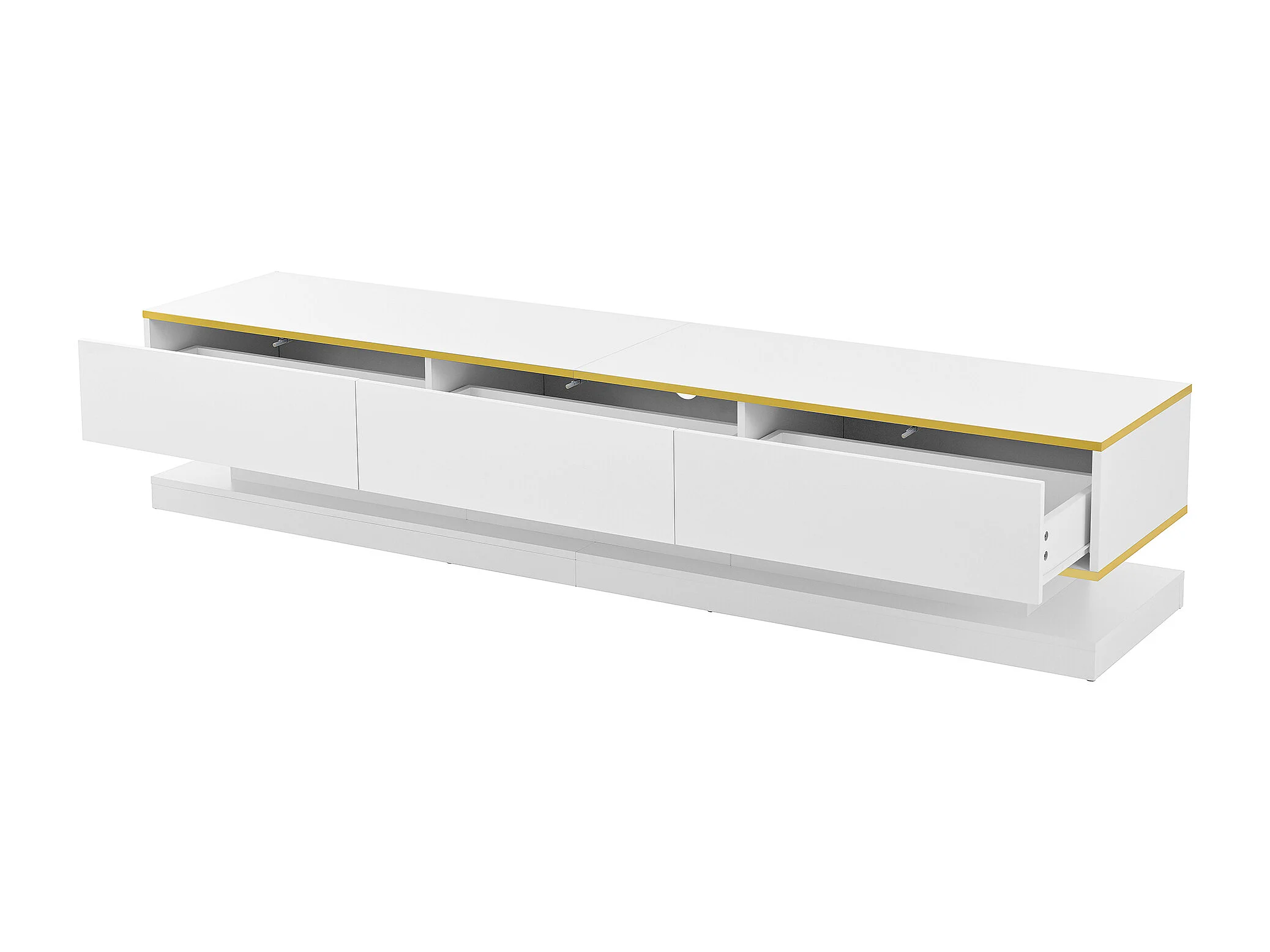 Meuble TV bas moderne avec 3 tiroirs et compartiments ouverts – Surface brillante – bords dorés
