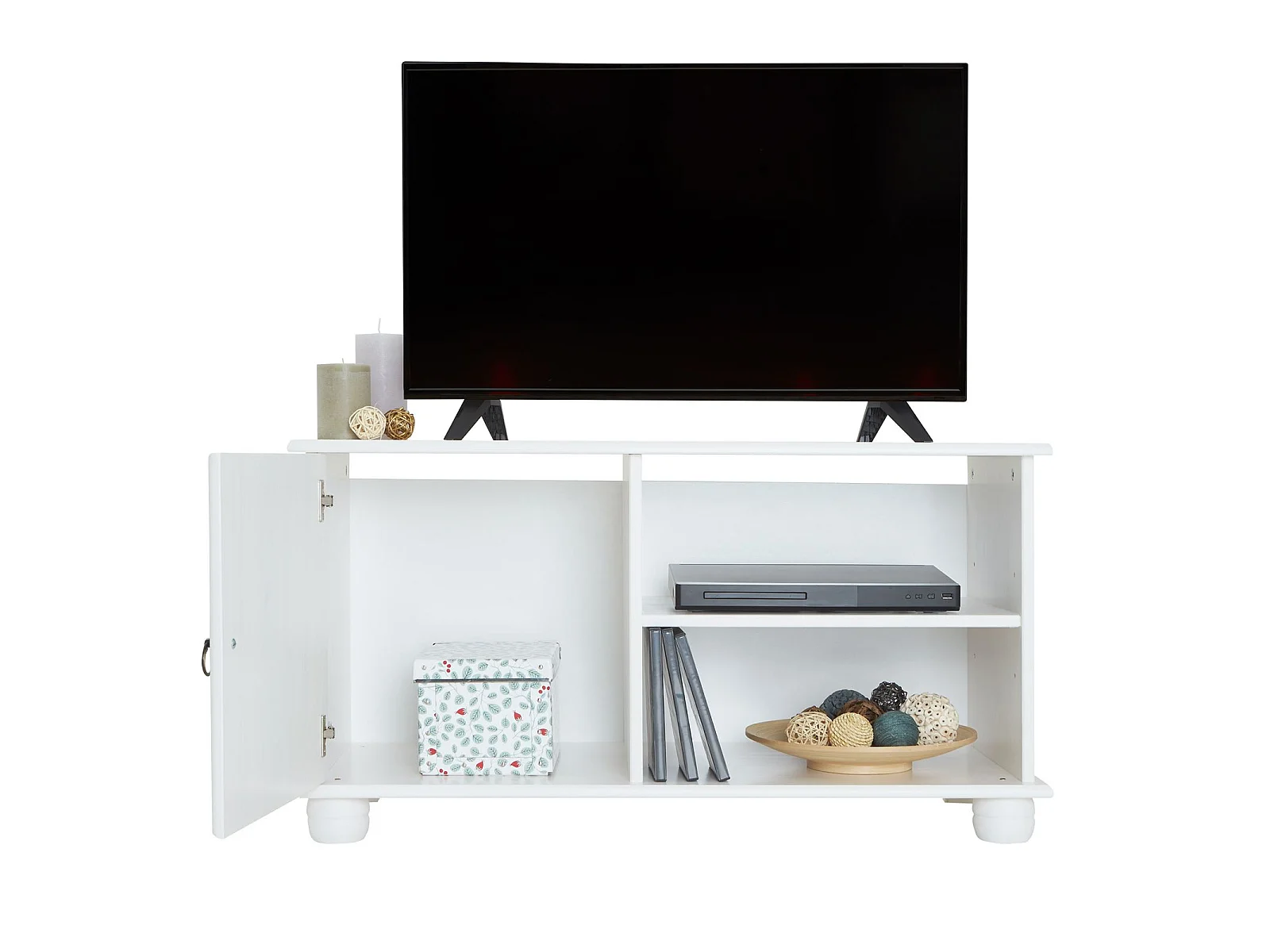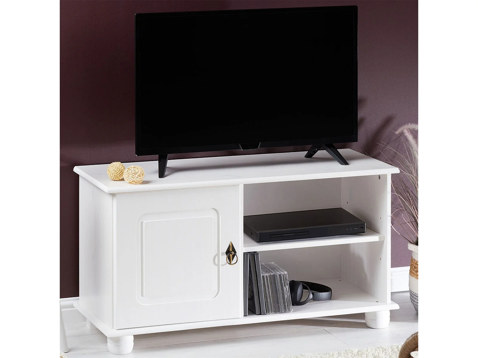 Meuble TV BELFORT banc télé de 94 cm en bois avec 1 porte et 2 niches, en pin massif lasuré blanc