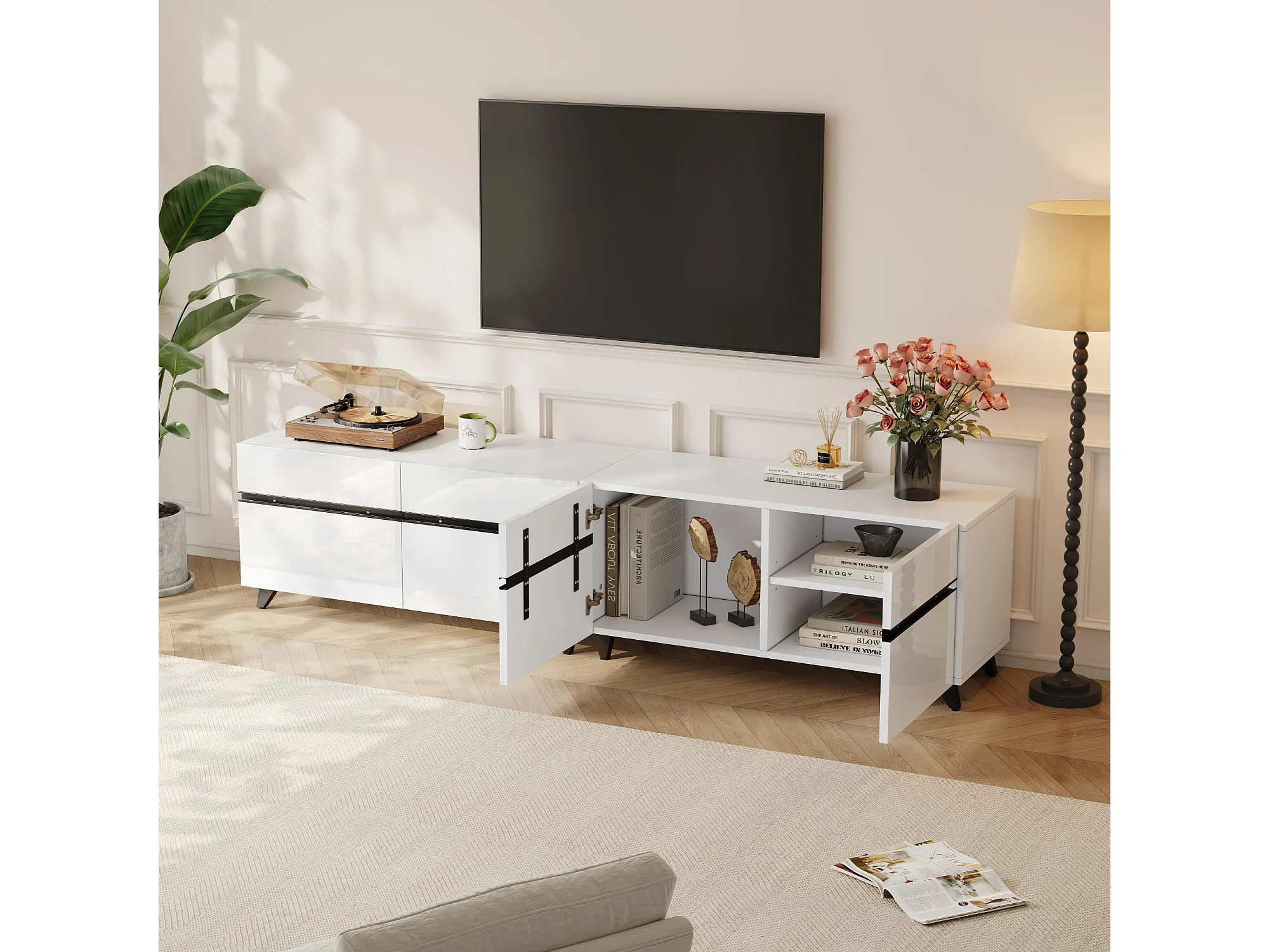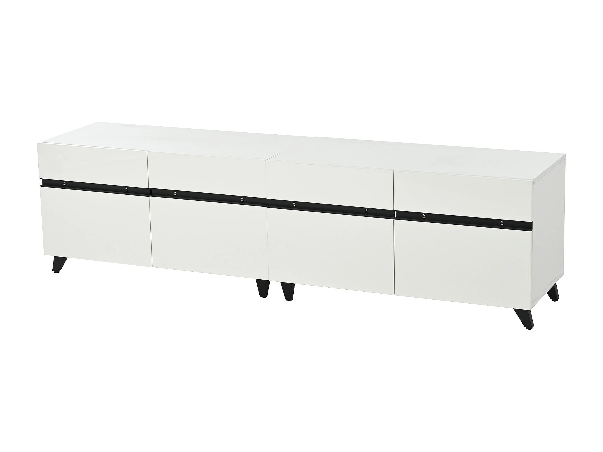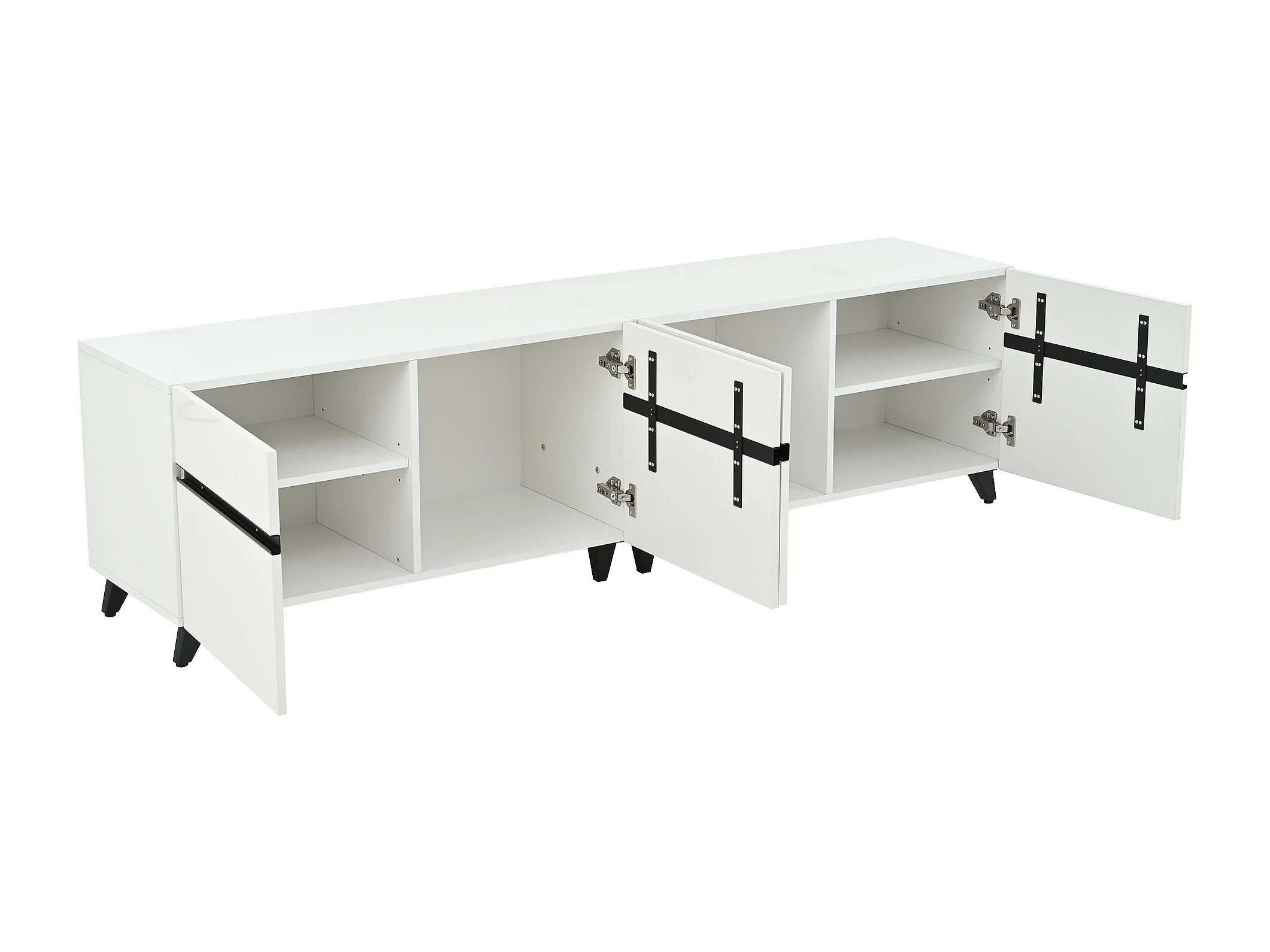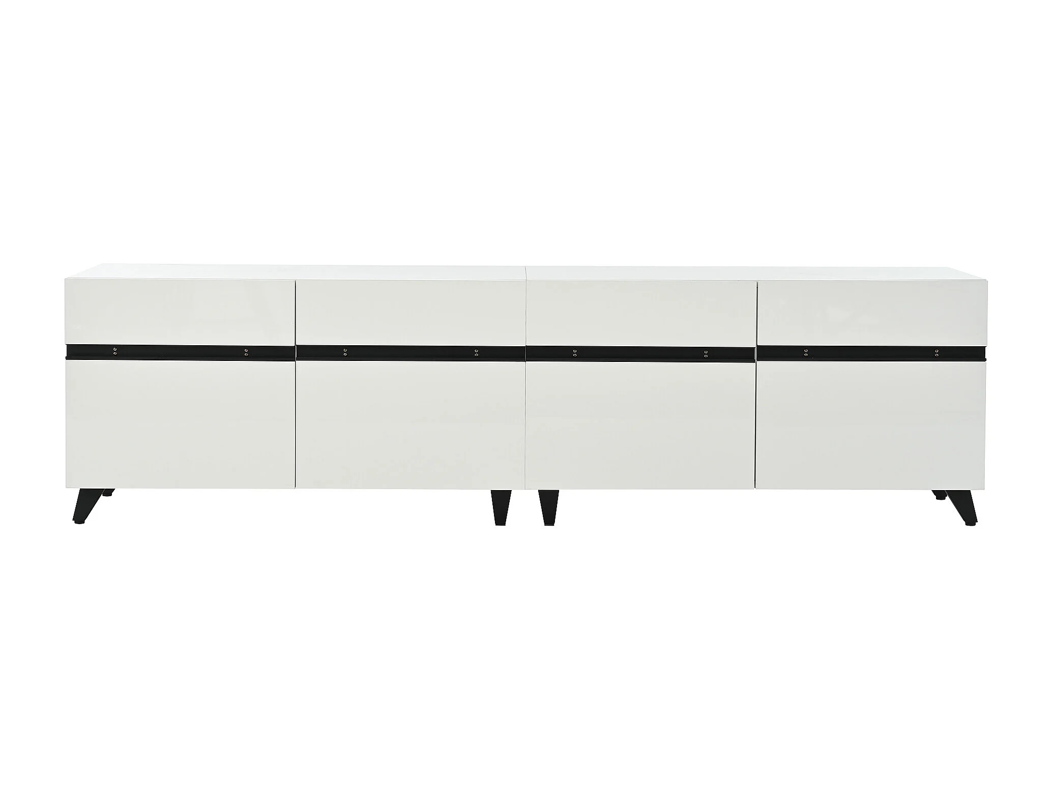 Meuble TV blanc avec 4 portes, finition brillante , pieds noirs.