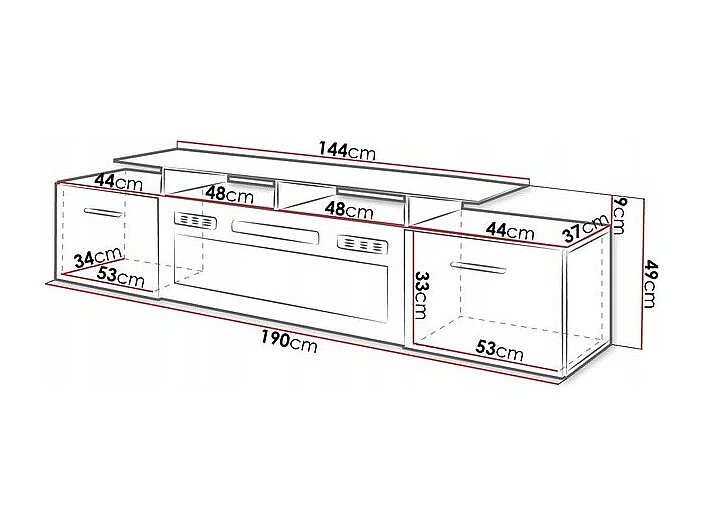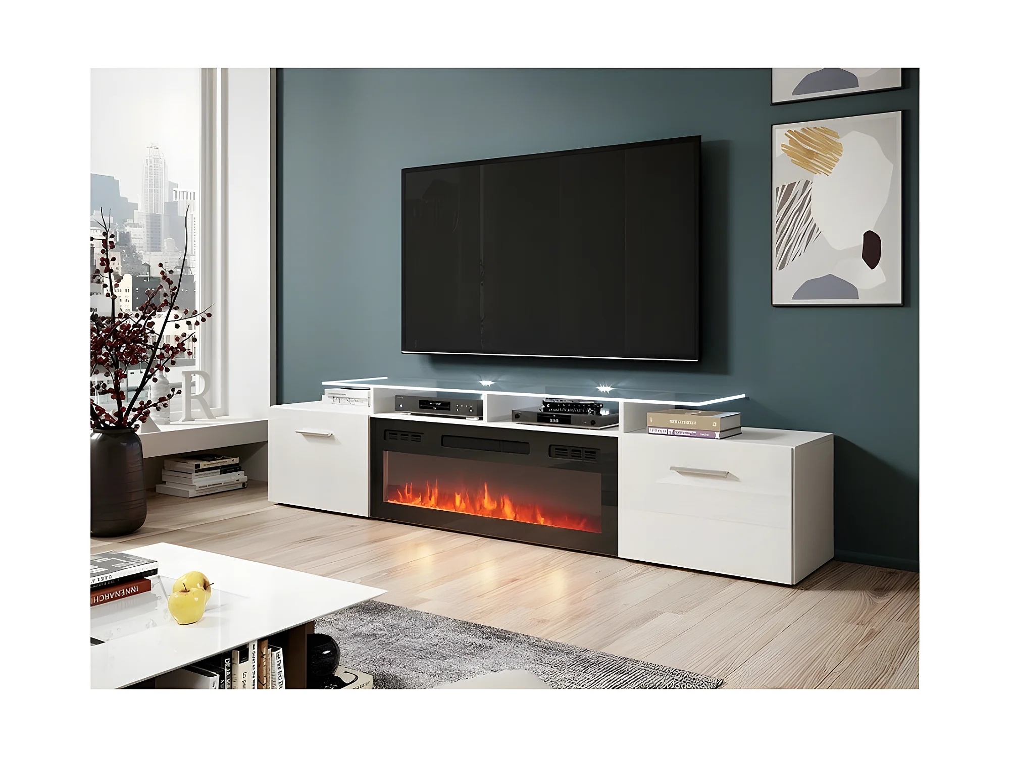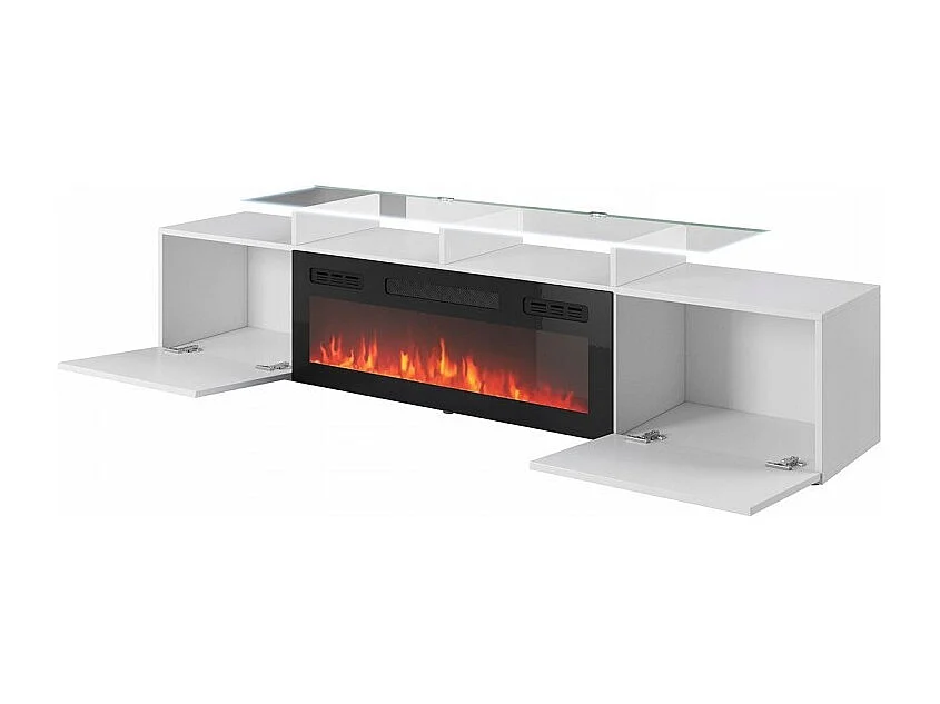 Meuble TV Blanc brillant 190x49x37cm Avec Cheminée chauffante intégrée ROXA à poser