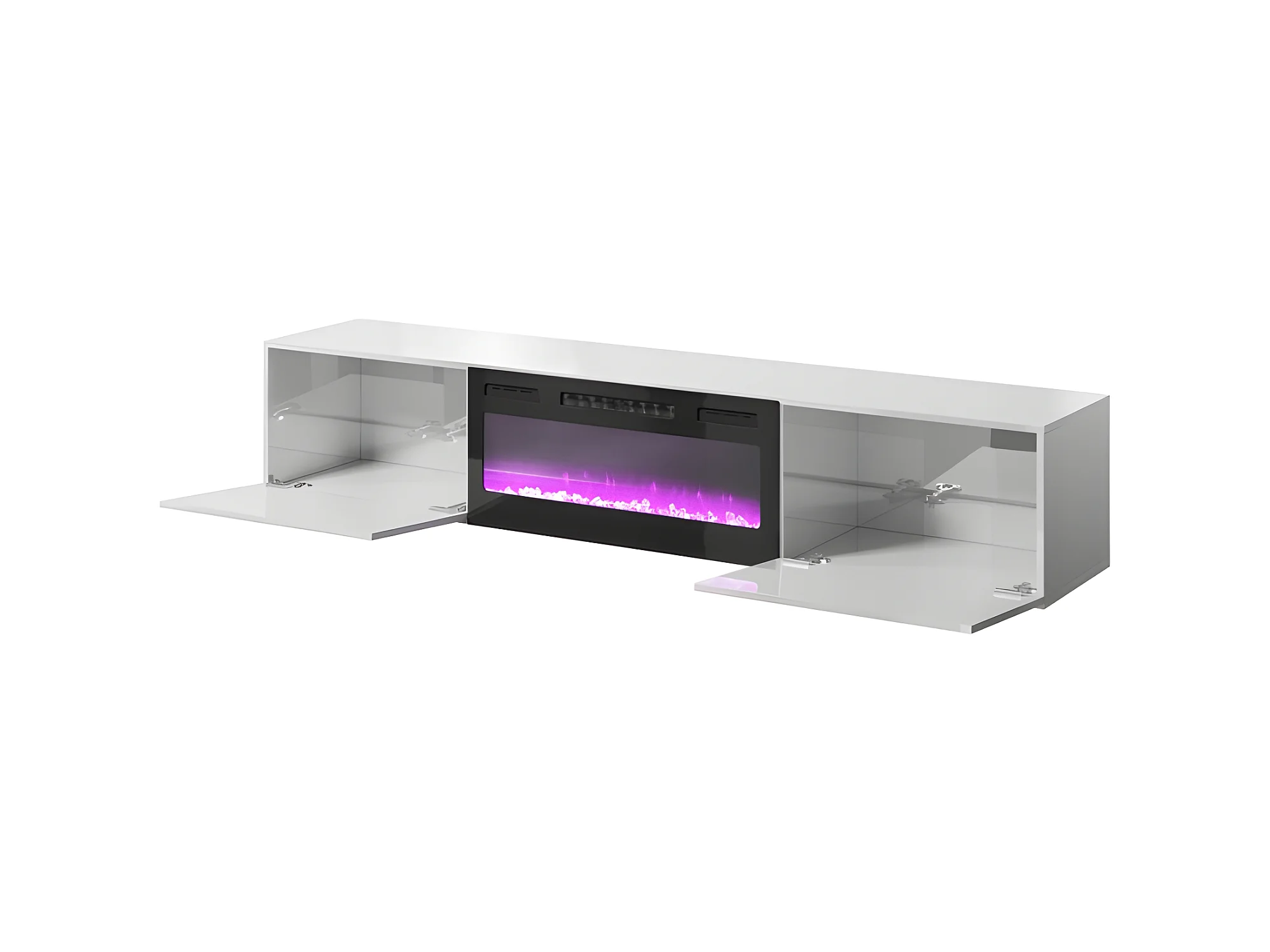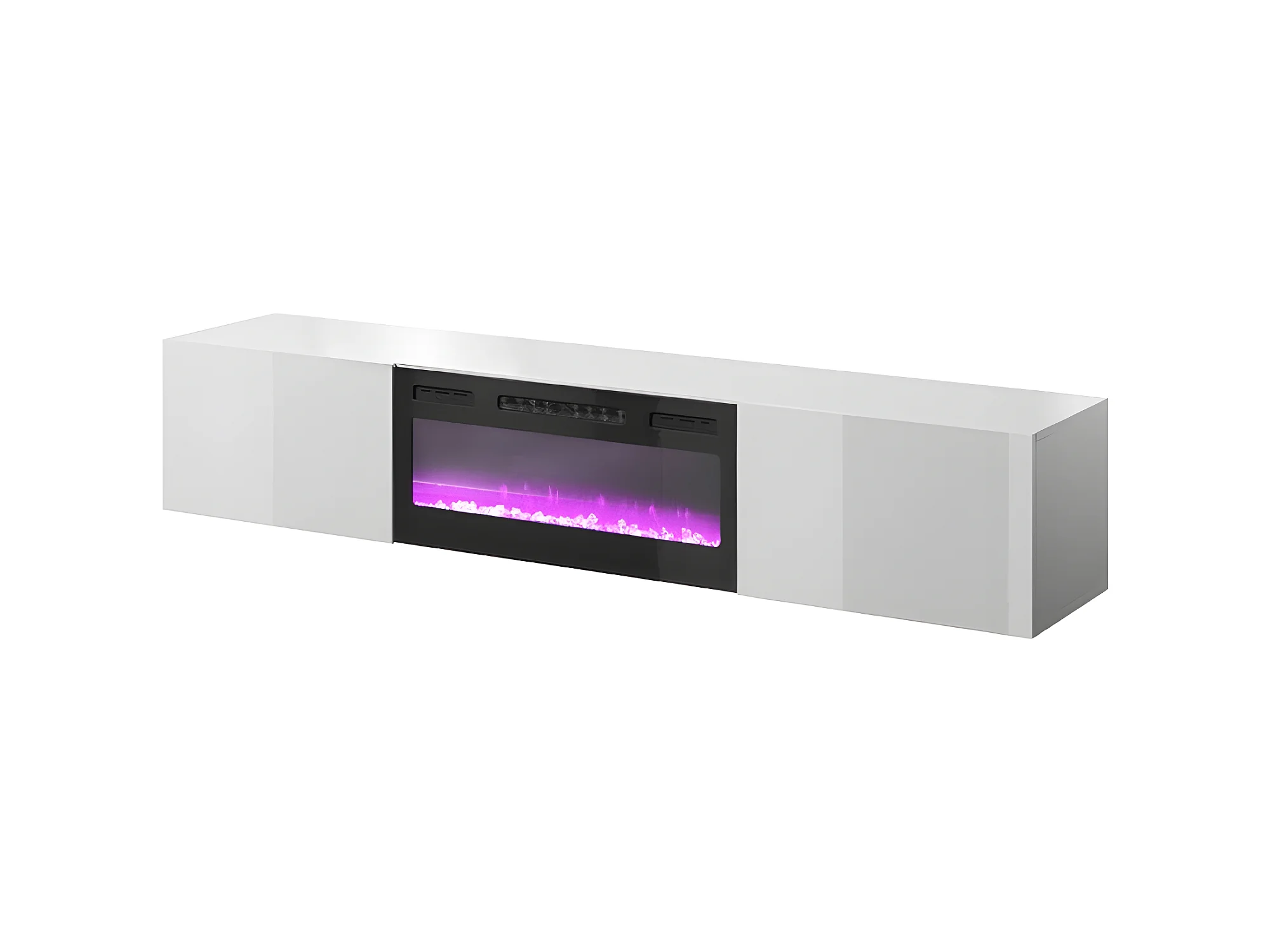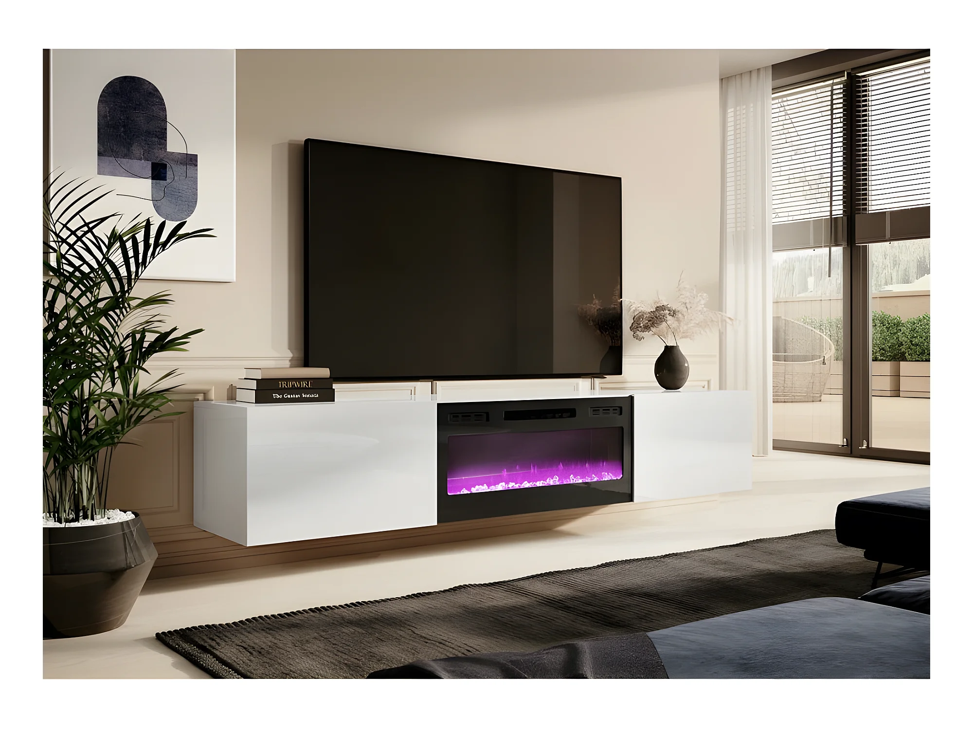 Meuble TV Blanc brillant 200x37x40cm Avec Cheminée chauffante intégrée SLIKA K à suspendre