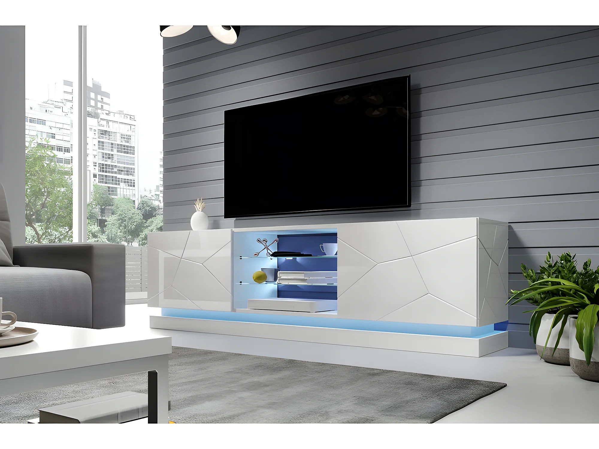 Meuble TV Blanc brillant 200x57x42cm QUEEN meuble Hi-fi luxueux sideboeard commode sur pied