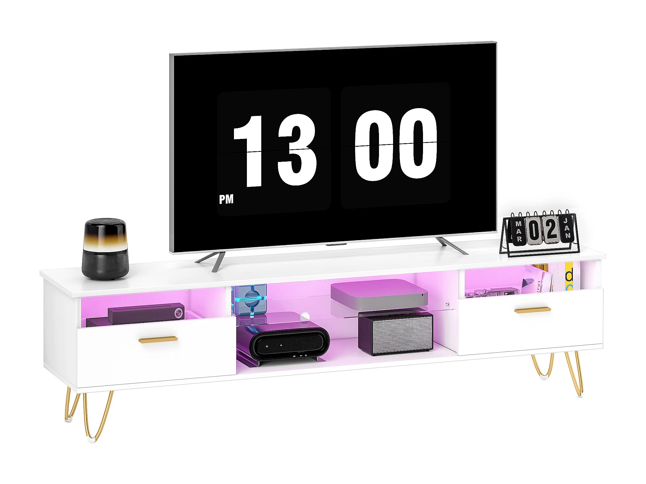 Meuble TV style nordique 2 portes 2 étagères 2 tiroirs façade blanc laqué effet bois clair