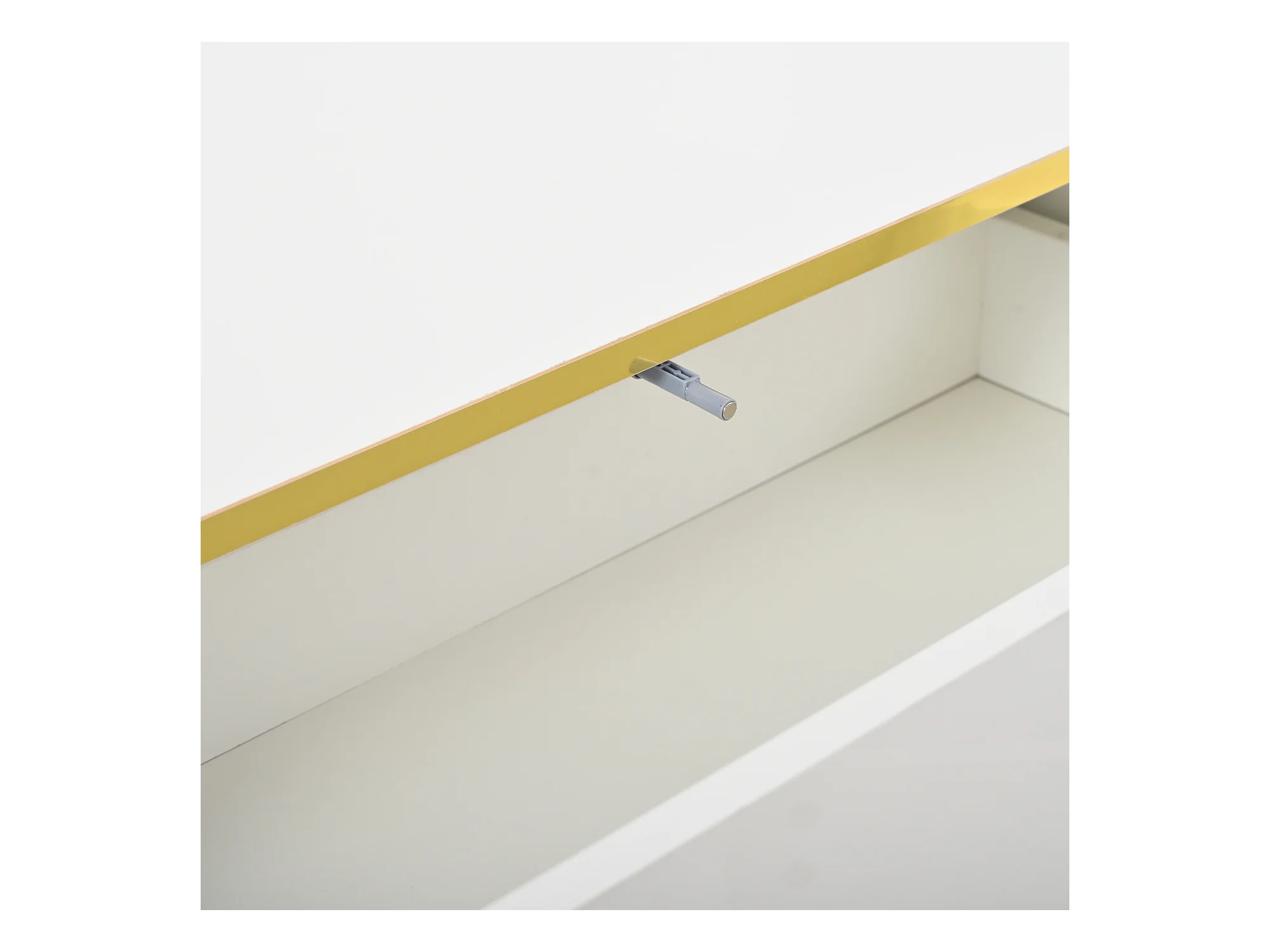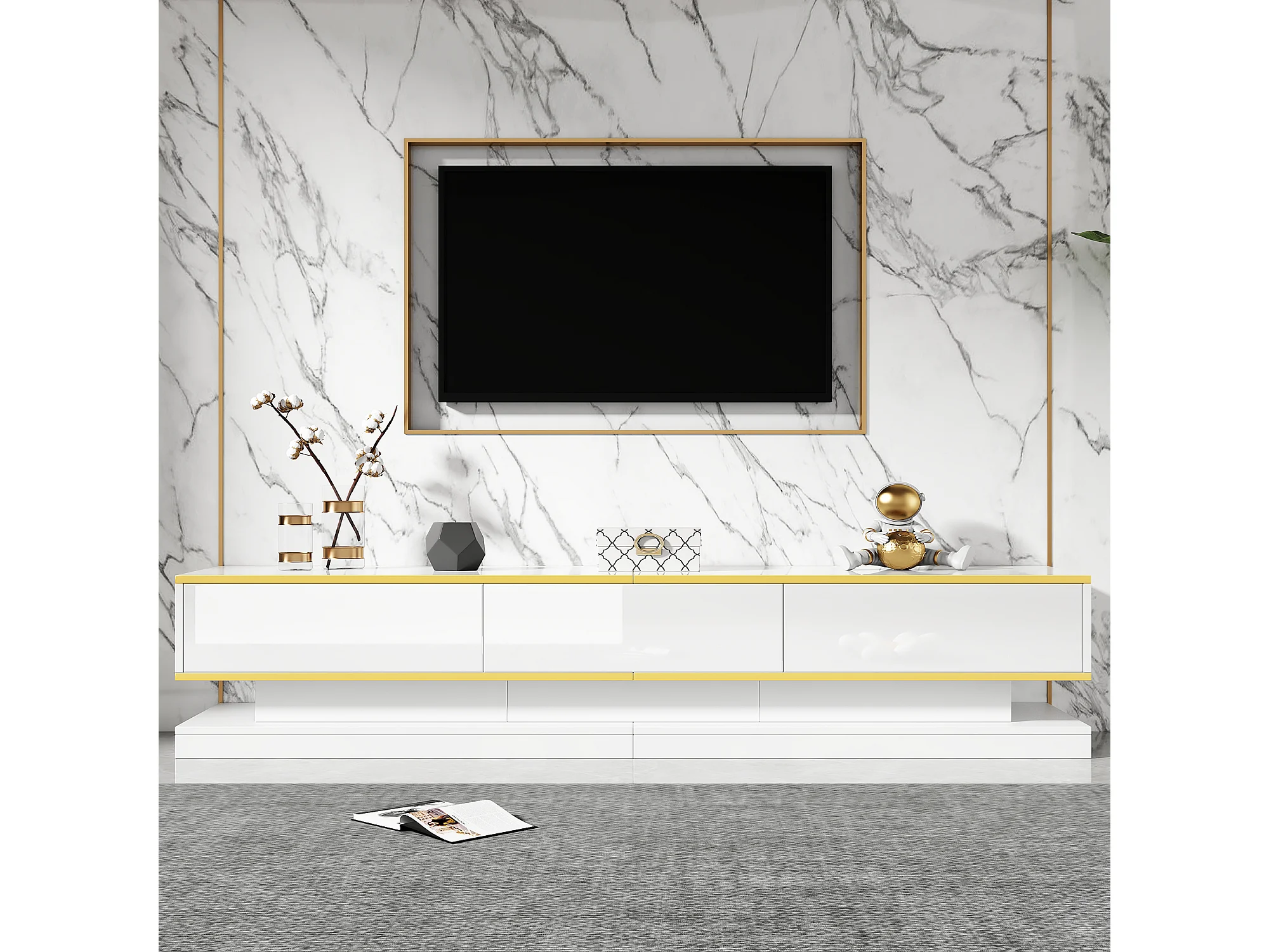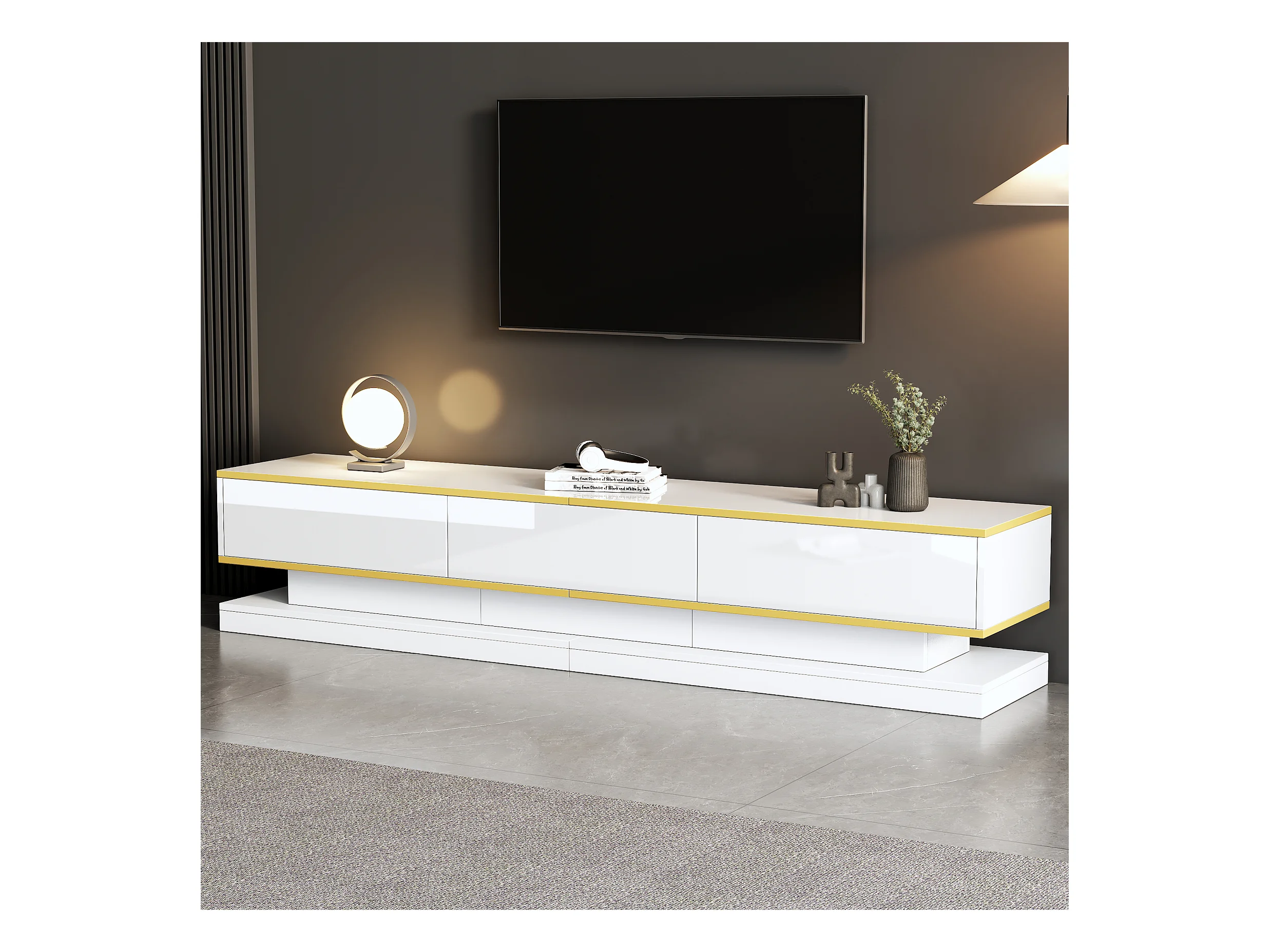Meuble TV blanc - Meuble TV avec 3 tiroirs et finitions dorées - coulisse inférieure silencieuse et fluide