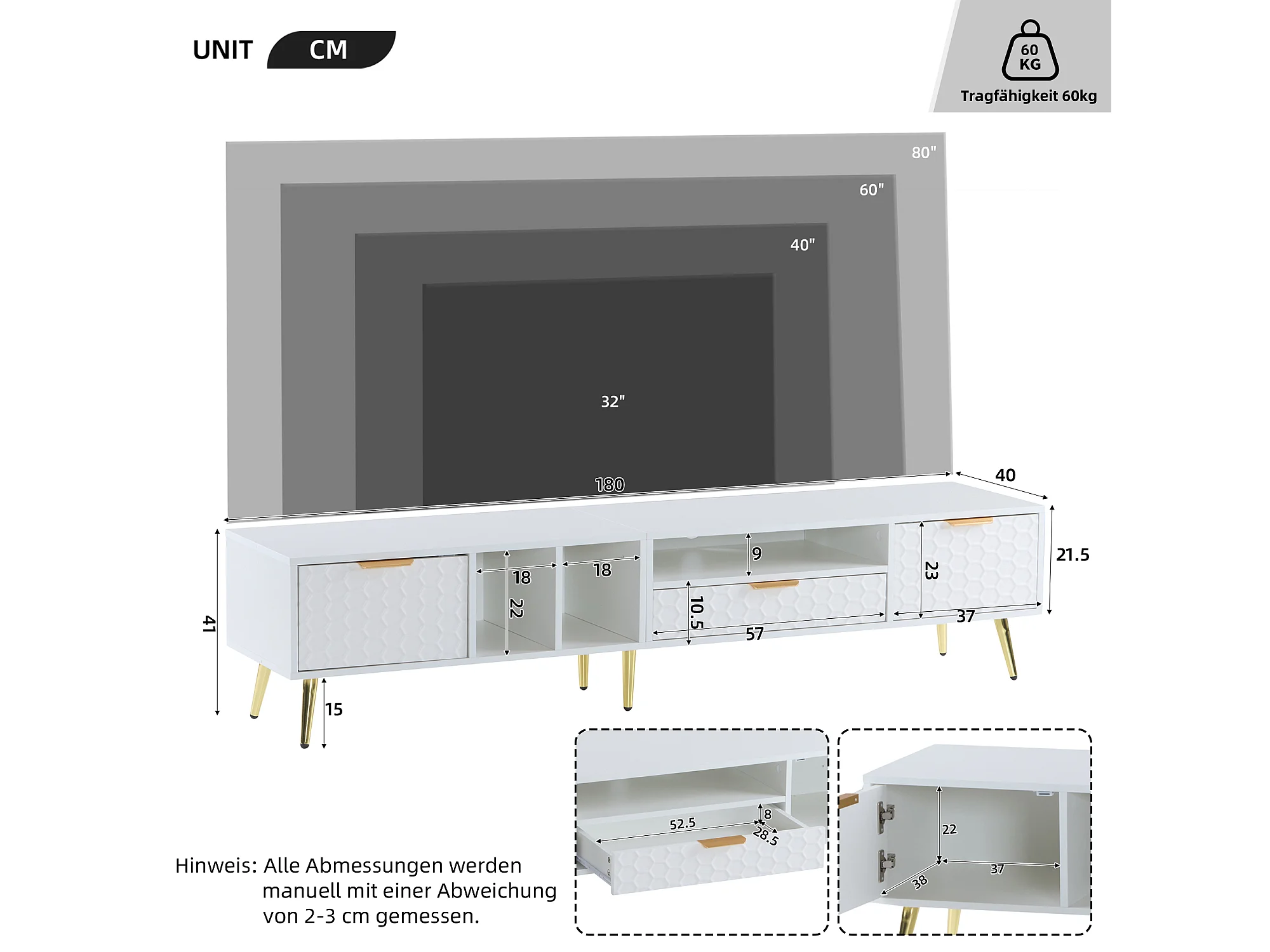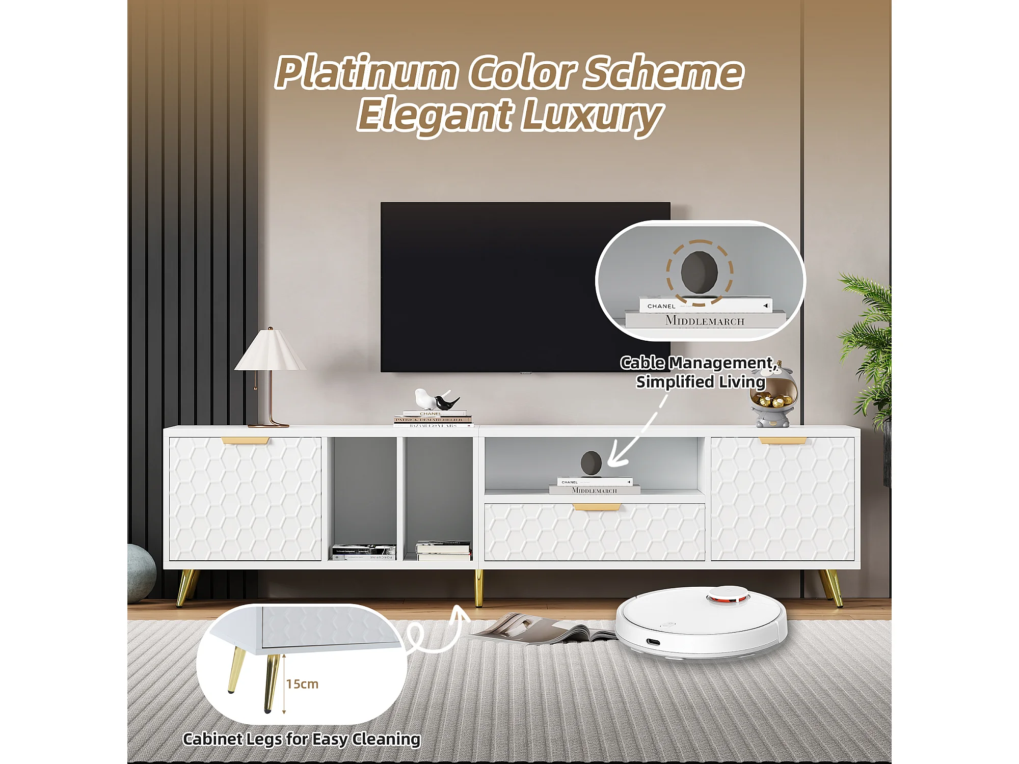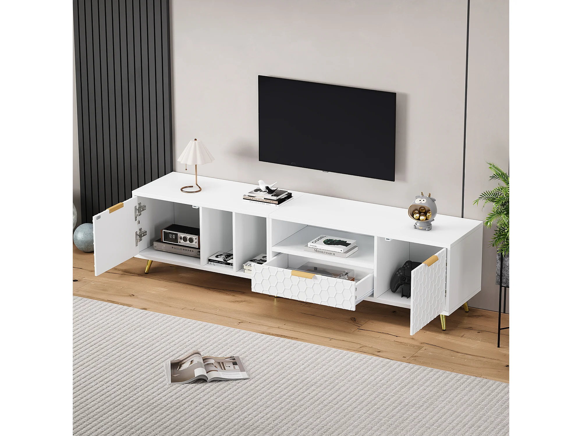Meuble TV Blanc, Motif Nid d’Abeille Mat & 3 Compartiment & 2 Portes & 1 Tiroir, 180 x40x41cm