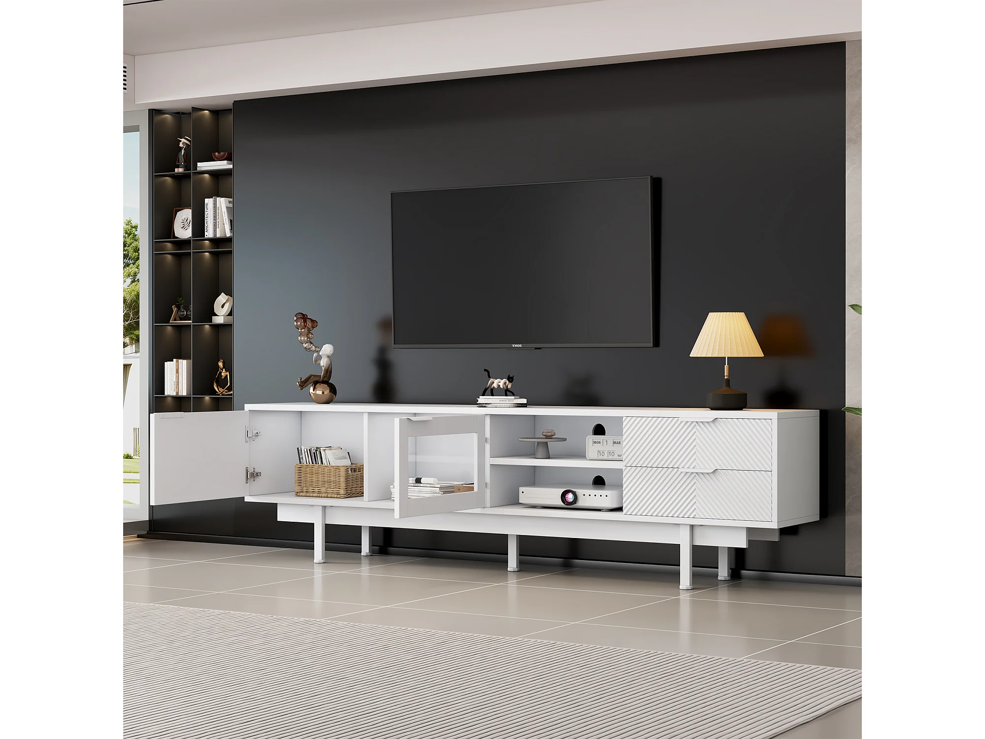 Meuble TV bohème avec espace de rangement, portes d'armoire minimalistes, 200 x 40 x 51 cm, blanc