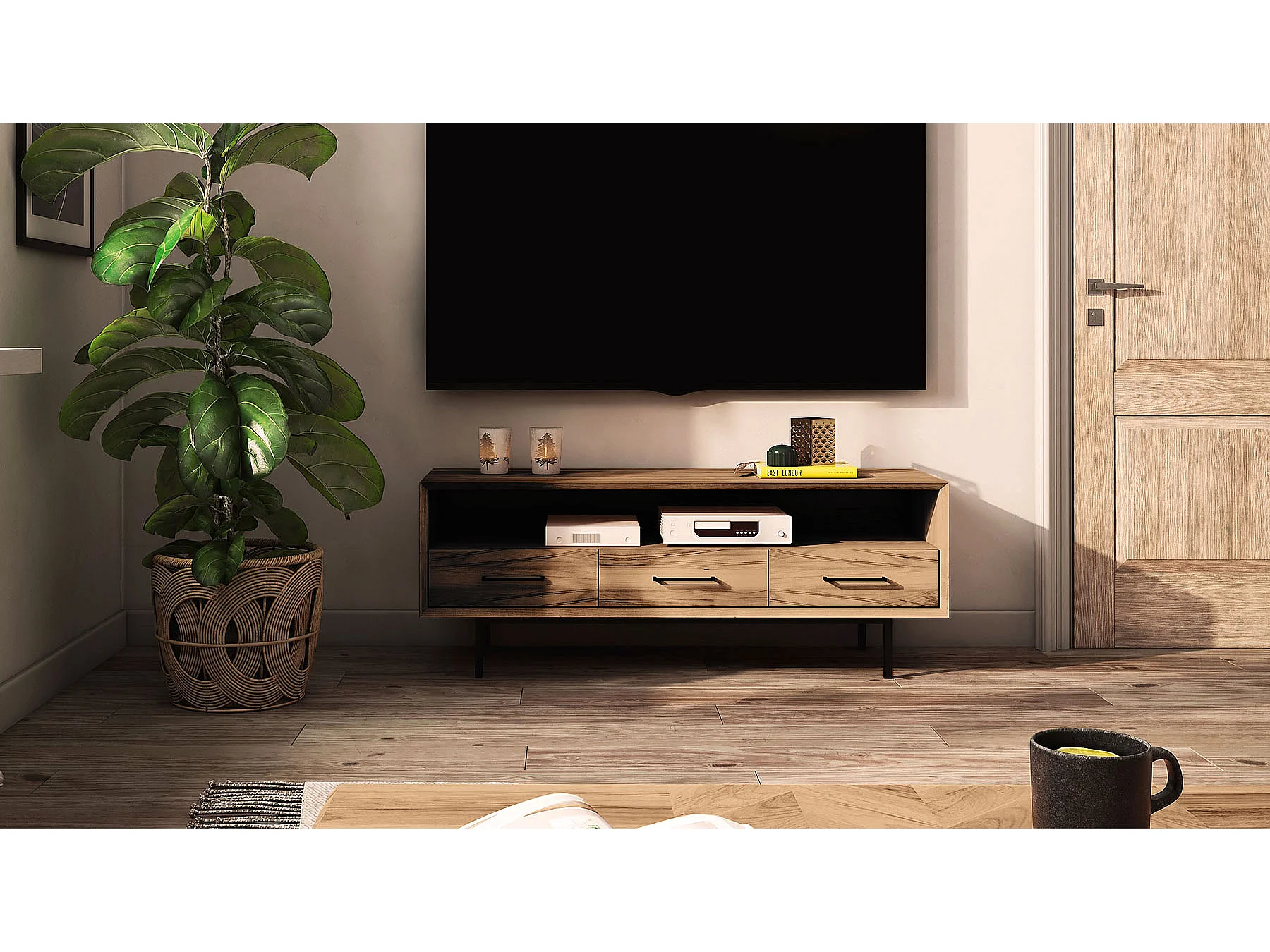 Meuble tv bois hêtre 3 tiroirs paola 144x45cm